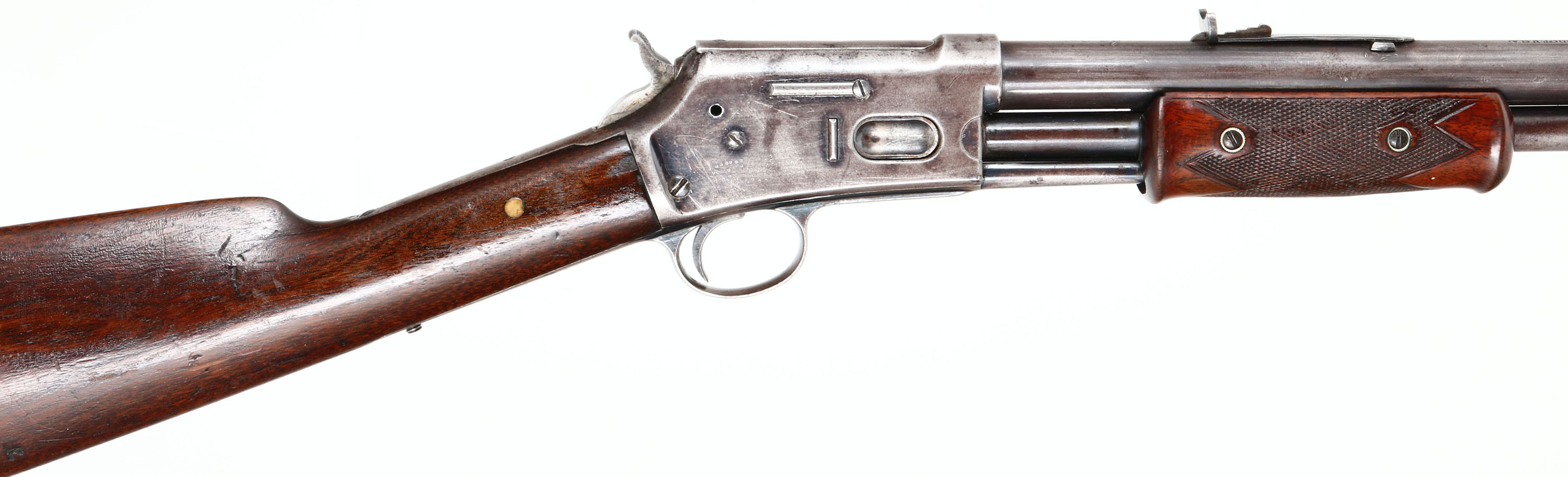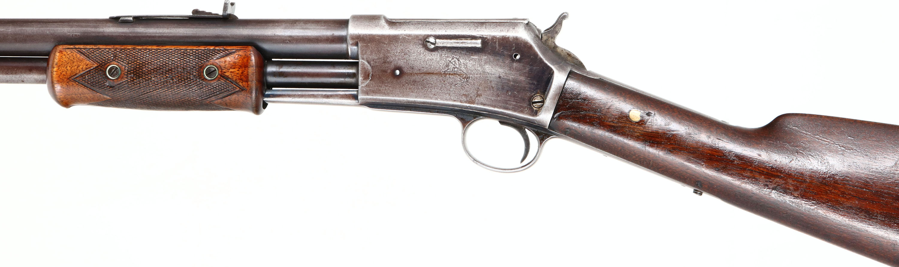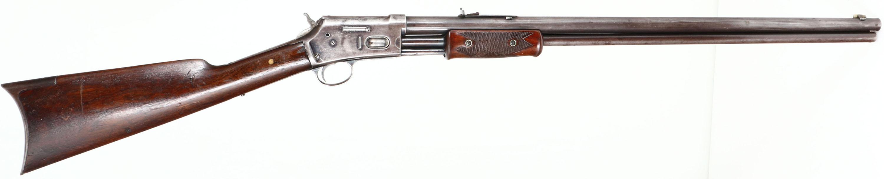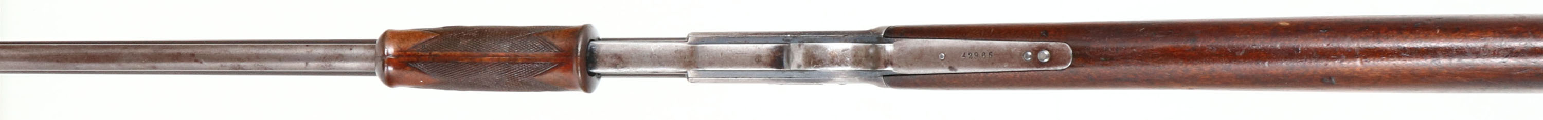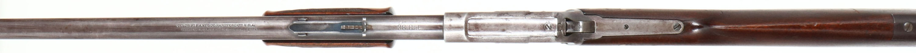 Colt Lightning, Medium Frame, CAL: 38, MFG: 1890, SN: 42965, Pump Action Rifle, 26'' Round barrel, Full mag. The factory straight grip wood stocks are very good, with a checkered forend. The stock has an added layer of finish over the original finish. There is a brass peg at the wrist adding strength & stability. The is a 1 1/2'' grain crack emanating from the upper tang & there are other small dings, scratches & contusions. The checkering is very good, but starting to smooth some from normal use. The original metal finish has worn mostly gun metal gray, with a thin brown layer of patina remaining. Bore is good, with areas of roughness amongst strong rifling. Rifle is fitted with an adjustable rear & long blade front sights. Crescent metal buttplate. A nice example of an early pump rifle. Antique, No FFL Req. - Value: 1000 to 2000