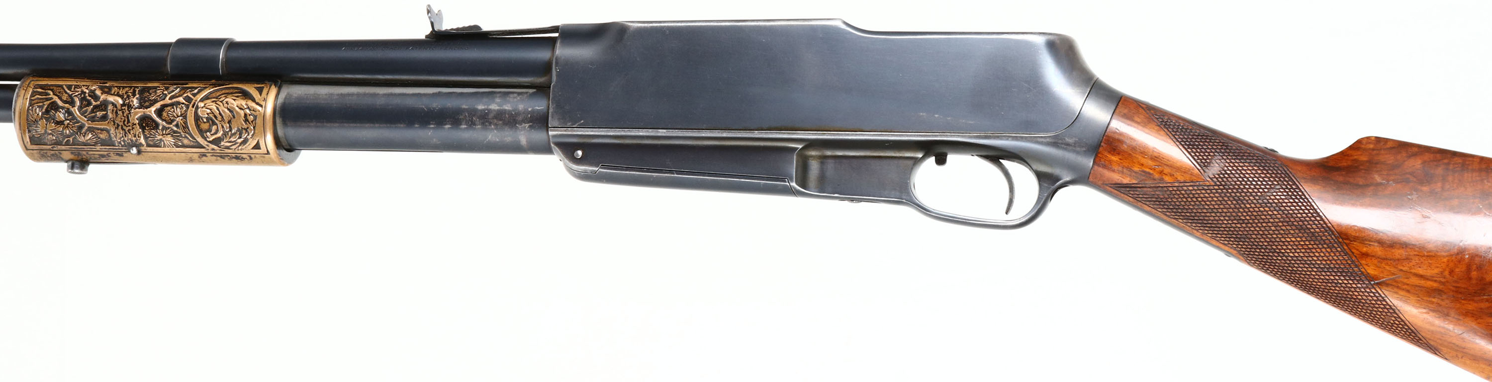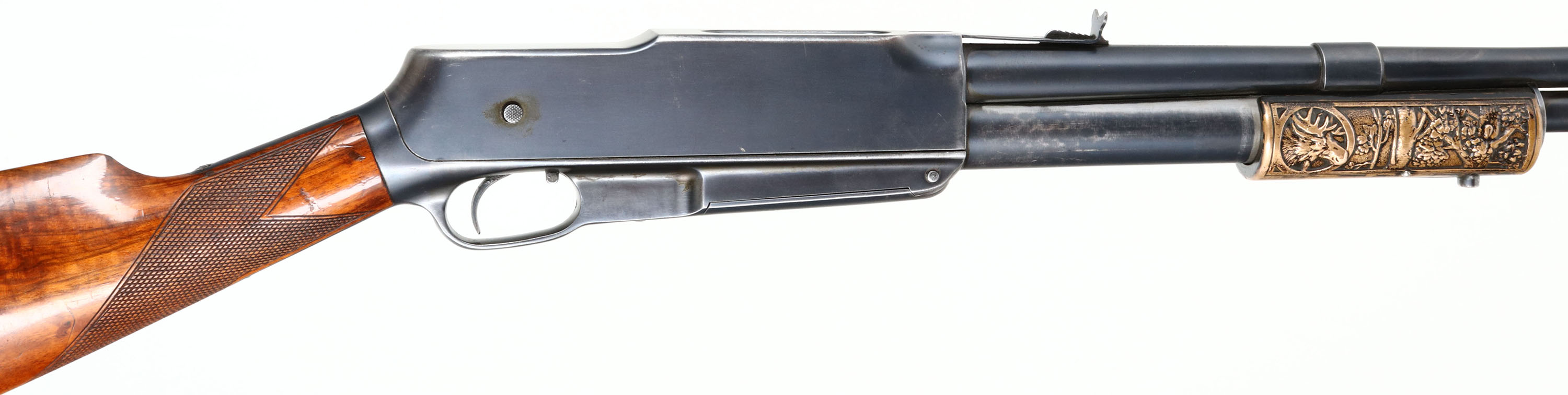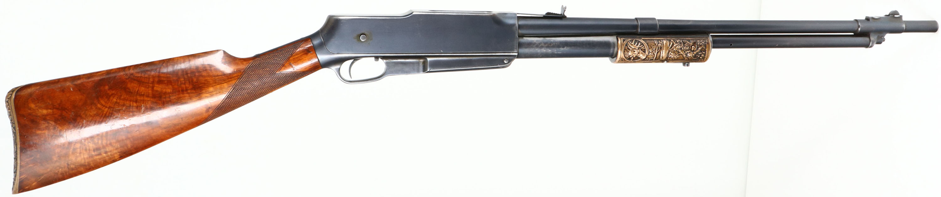 RARE DELUXE Standard Arms, Model G, .35 REM Cal., MFG: 1909-20, SN: 8004, Pump Action & Semi-Auto Rifle, 22'' Round barrel, Philadelphian Morris F. Smith had a number of firearms patents, some of which were rolled into the 1906 patent number 314,242 for a unique ''automatic gas-operated'' rifle, which were used as the basis for the Standard Arms. Other semi auto rifles of the era like Remington & Winchesters relied on blowback & recoil to work their actions, making Smith's ''gas-operated'' rifle unique. The original deluxe checkered & straight grip wood stock on this example is excellent & solid. The stock carries the original finish, with a few small scuffs, scratches & contusions. The wood displays excellent rippled & feathered grain. The forearm & buttplate are of an elaborate cast brass, which were supposedly manufactured & provided to the Standard Arms Co. from the famous House of Tiffany foundry. The brass casting still retain much of the original Japan black finish in the protected background relief. The factory metal blue finish on the barrel & receiver rates 90% & 80% on the pump tube. Bore is excellent. The rifle is fitted with an adjustable rear sight & Lyman half moon blade front sight, with ivory bead. An interesting & rare vintage Semi auto/pump rifle, with approximately 8,000 total produced. Any Standard Arms rifle is fairly rare, but a deluxe example is extremely rare & collectible. FFL or C&R Req. - Value: 1500 to 2500