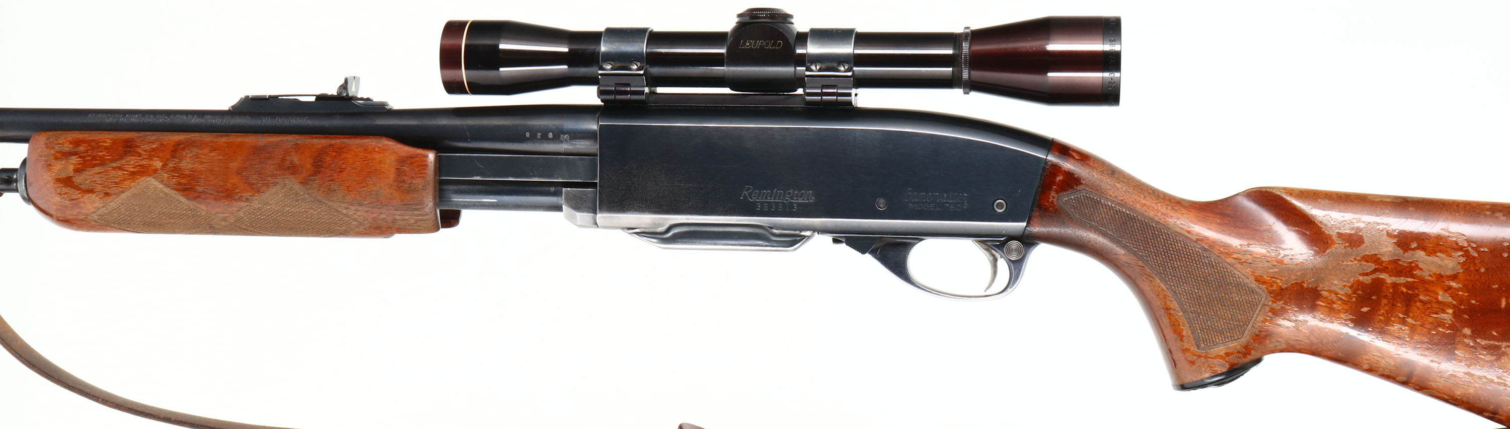 Remington, Gamemaster Model 760, CAL: 30-06, MFG: 1960, SN: 363913, Pump Action Rifle, 21 3/4'' barrel. The original checkered & capped pistol grip wood stocks are very good & solid. However, the original finish shows heavy flaking & is worn thin at the contact points. The metal blue finish rates 95% on the barrel & 85% on the receiver, with most of the loss at the belly of the receiver & some spotting/speckling. Bore is very good, but with light roughness amongst strong rifling. The receiver holds a Leupold M8-4X scope, held by Weaver rings. The barrel carries the elevated adjustable rear sight & ramp elevated blade front sight. Stock has a ventilated recoil pad. Sling loops hold a brown leather sling. FFL or C&R Req. - Value: 300 to 600