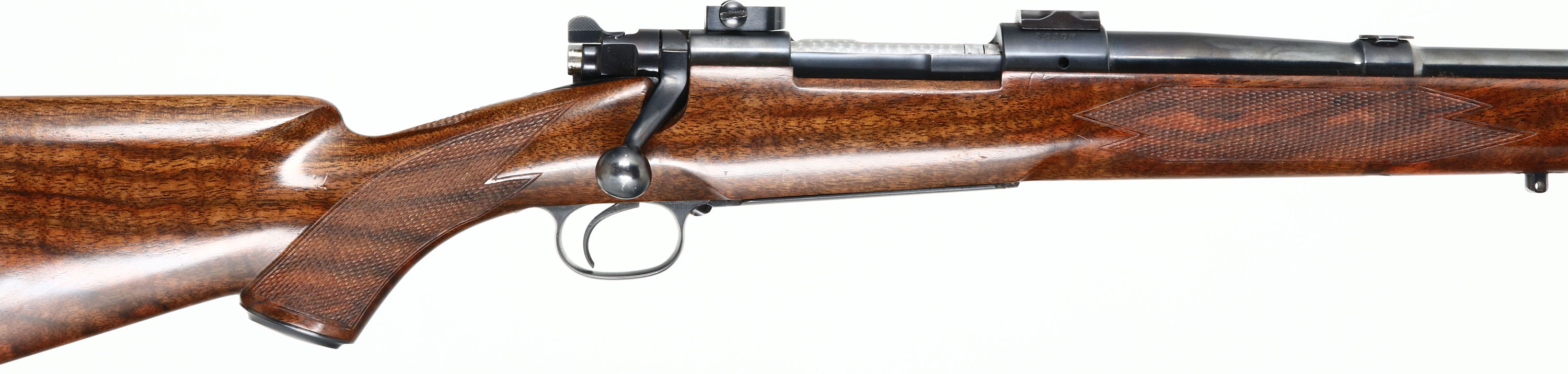 Winchester, Model 70, CAL: 30 GOV'T06 (30-06), MFG: 1940, SN: 30308, Bolt Action Rifle, 24'' tapered round barrel. Thethe custom deluxe checked & capped pistol grip walnut stock is excellent, with a darker wood forend tip. The stock has excellent grain, with sharp checkering & a few minor handling marks or light contusions to the finish. The original metal blue finish rates 97% overall. Bore is very good, with strong rifling. The receiver carries a couple of scope blocks, while the barrel holds a cutoff rear sight that functions as a blank & a front sight which has had the blade ground off so not to interfer with the optics of the previously mounted scope. The buttstock carries a Decelerator solid recoil pad. Sling provisions. A very nice cutomized rifle in a common hunting caliber. FFL or C&R Req. - Value: 500 to 1000