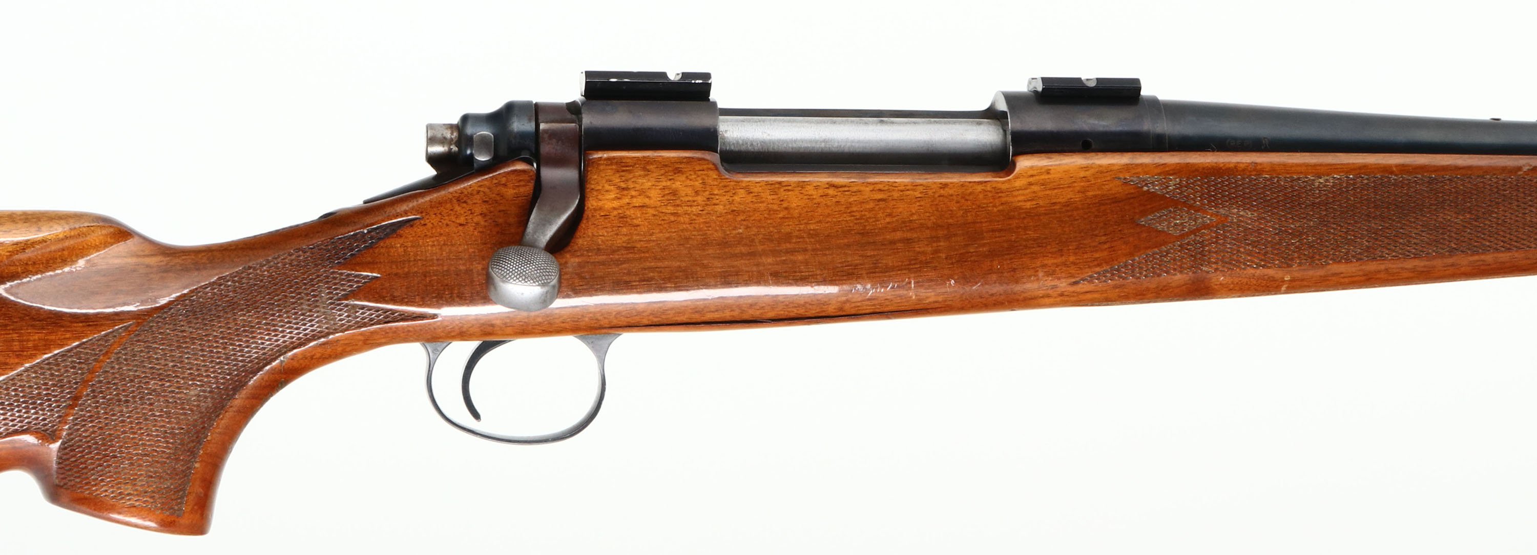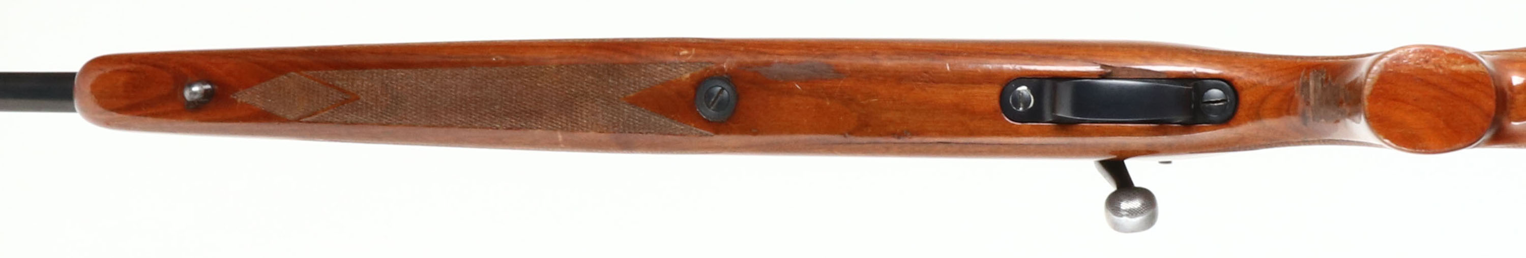 Remington, Model 700, CAL: 30-06, MFG: Late 1977, SN: 295583, Bolt Action Rifle, 22'' barrel. The original checkered & flat pistol grip wood stock appear good, however there are 4'' stress cracks on both sides of the belly of the stock infront of the trigger guard. The stock remains solid. The are several small scuffs & minor dings to the original high gloss finish. The rifle comes with an extra Remington black synthetic stock, which is in excellent condition, with Remington solid recoil pad & sling studs. The original metal blue finish on the barrel rates 80%, 90% toning plum on the receiver. Bore is very good. The receiver holds a couple of scope blocks from a previous scope mounting, while the barrel is tapped with factory sight provisions for front & rear sights. Stock carries a Remington checkered metal buttplate. Sling studs. FFL Req. - Value: 600 to 1000