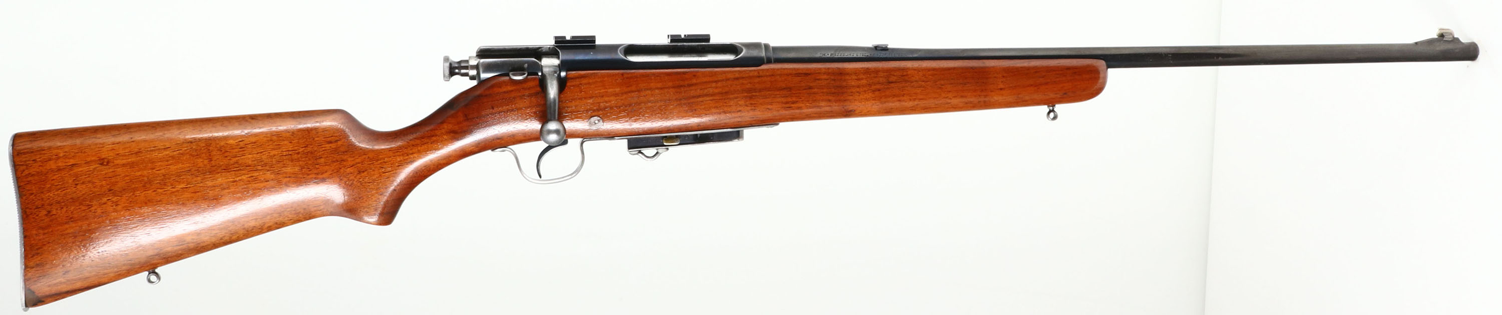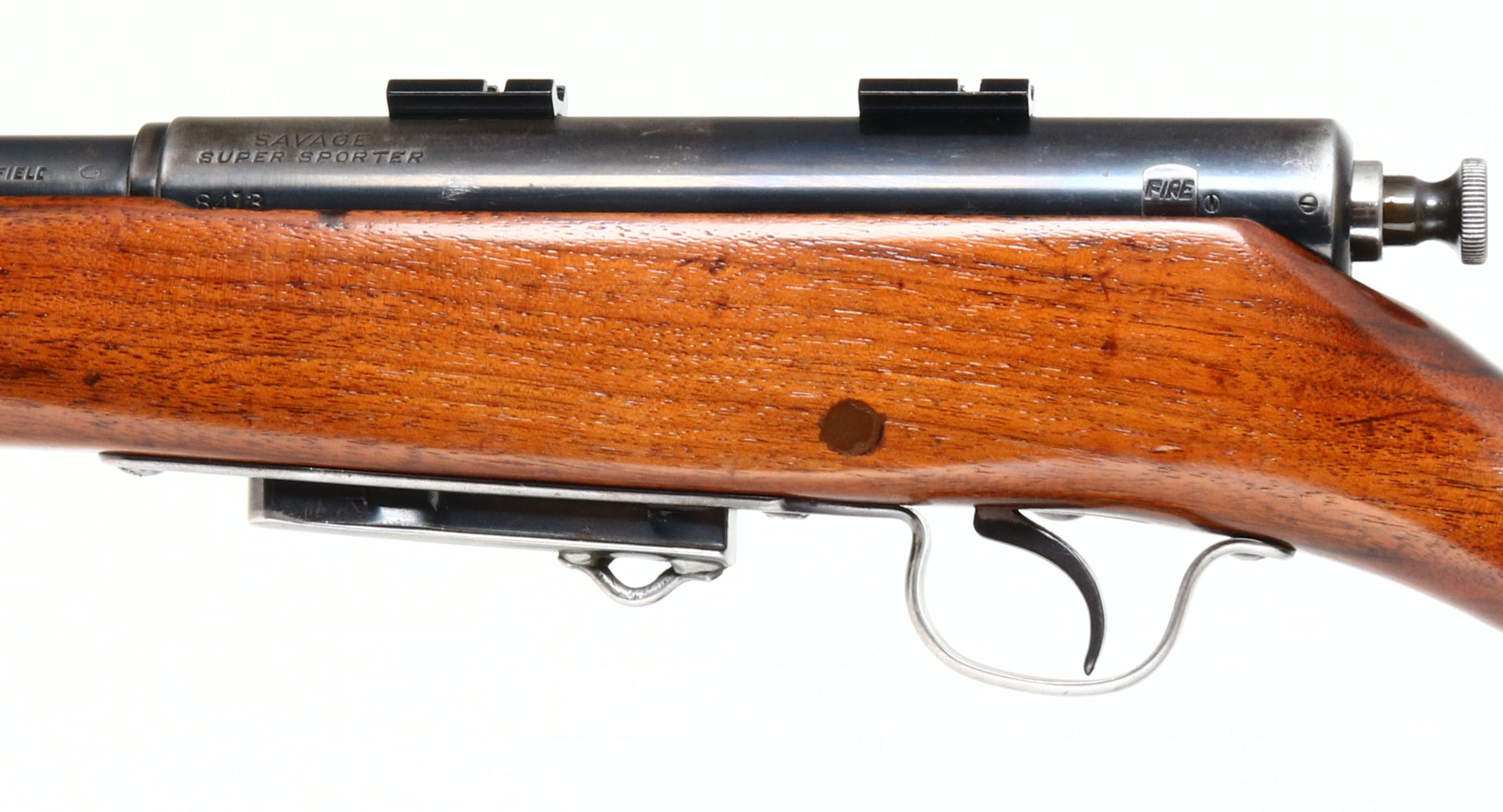 Savage, Super Sporter, CAL: 30-06, MFG: 1928-40, SN: 8413, Bolt Action Rifle, 23 1/2'' barrel. The original flat pistol grip wood stock is excellent, having been sanded & refinished. The toe has a small fill repair & the dowel insert above the trigger guard has been filled too. The restored metal blue finish rates 75% overall, with scuffs, scrapes, spotting & areas worn to metal grey. Bore is very good, with proud rifling, but appears rough throughout. The receiver has been tapped & drilled, it carries a set of scope bases. The barrel has a blank filled rear dovetail & ramp elevated blade front sight. Stock carries a SVG grooved metal buttplate. Sling studs present. Original ''30-06 Springfield''detachable mag, with a retention loop soldered to the bottom. FFL or C&R Req. - Value: 200 to 400