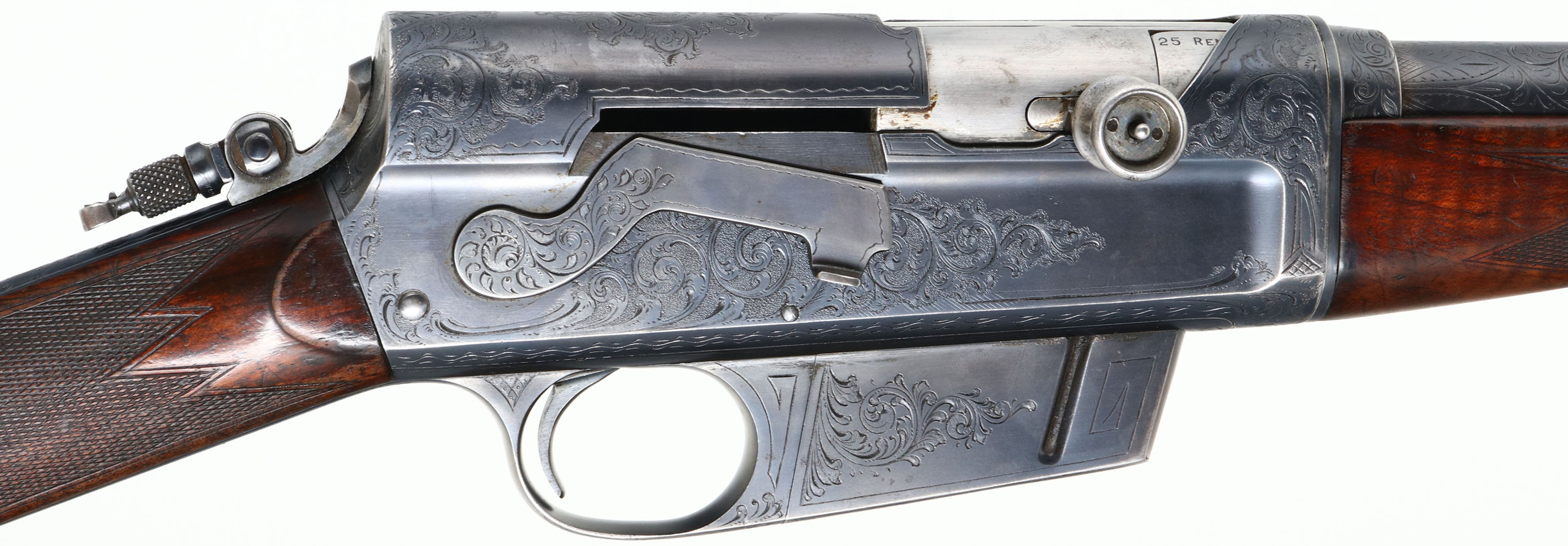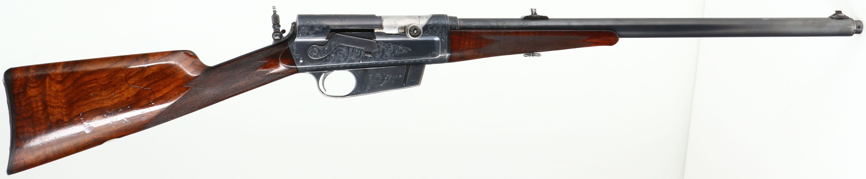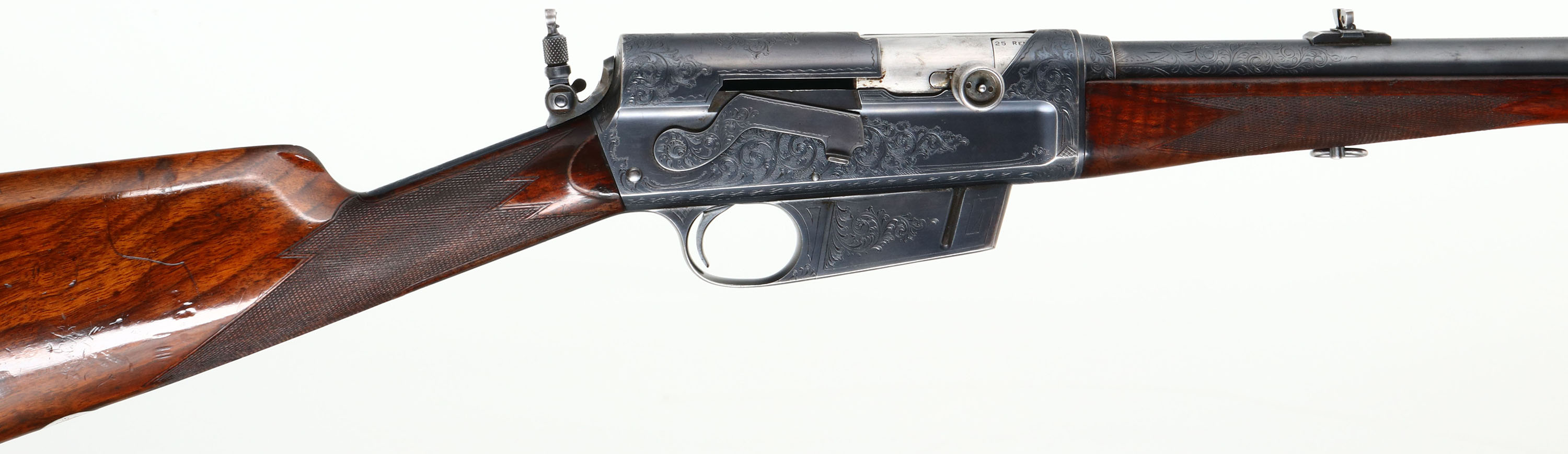 FANTASTIC ENGRAVED Remington, Model 8 No. 5 Expert Grade or later known as an ''E'' Grade, Custom Shop Rifle, marked .25 Rem., MFG. 1909, SN: 13359, Semi-Auto Rifle, 22'' barrel, This rifle, invented by John Browning, was America's first successful semi auto high-power rifle. 5 shot fixed magazine. These take down rifles were often broken down into the 22'' & 20'' halves & placed into leather cases for train rides to countryside hunts & shoots. The special order rifle has high grade English walnut wood stock & forearm, which are excellent, with nice figure to the grain. Factory checkering is 22 lines-per-inch. The stocks carry the original factory finish, with added oils & show minor handling scuffs, scratches & dings. The inlaid silver initial plate in the belly of the stock is inscribed with art deco initials ''RES''. The original metal blue finish rates 90%, with blue thinning at the carry points of the receiver & barrel. The large receiver side panels are covered with what Remington marketed as ''rich scroll hand engraving & game scenes''. The left side of receiver is engraved with a large standing buck in a grassy meadow. Engraving also found on base of magazine, safety, trigger guard, tangs & barrel jacket. Bore is excellent & bright, with high lands & grooves. Rifle fitted with a Lyman tang sight, folding leaf rear sight & silver bead front blade sight. Tight action & functions as it should. A very rare & highly collectible example of Remington's custom shop talents.* FFL or C&R Req. - Value: 7500 to 12500