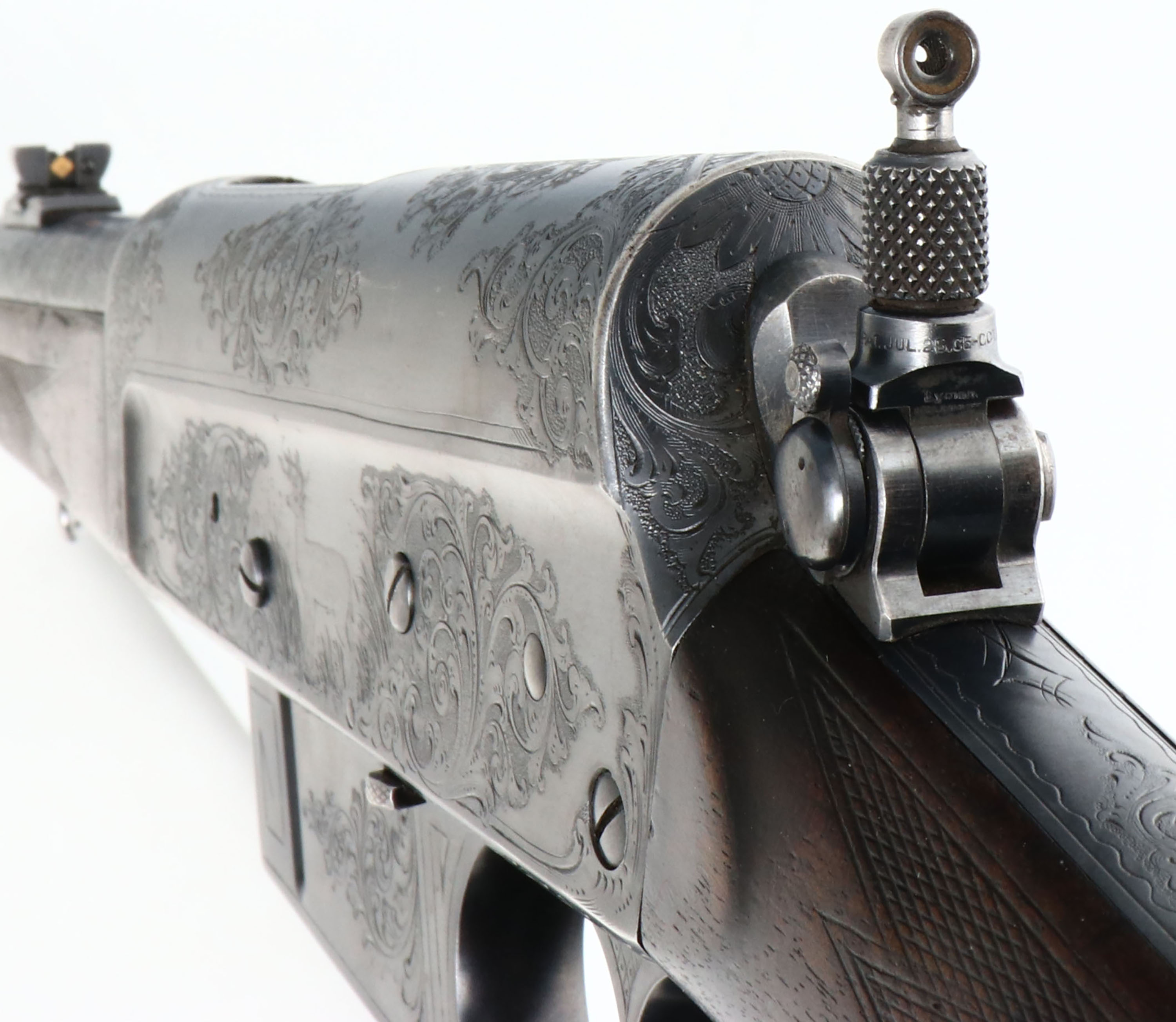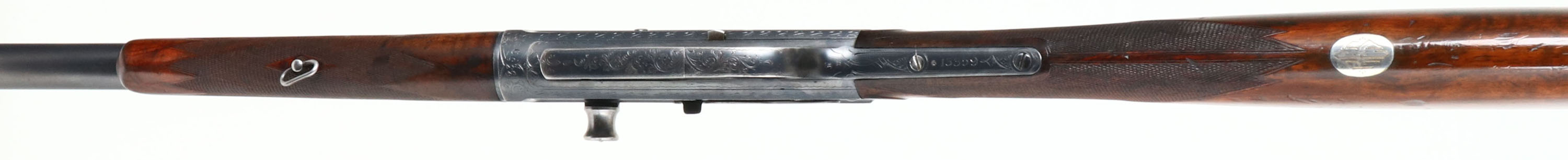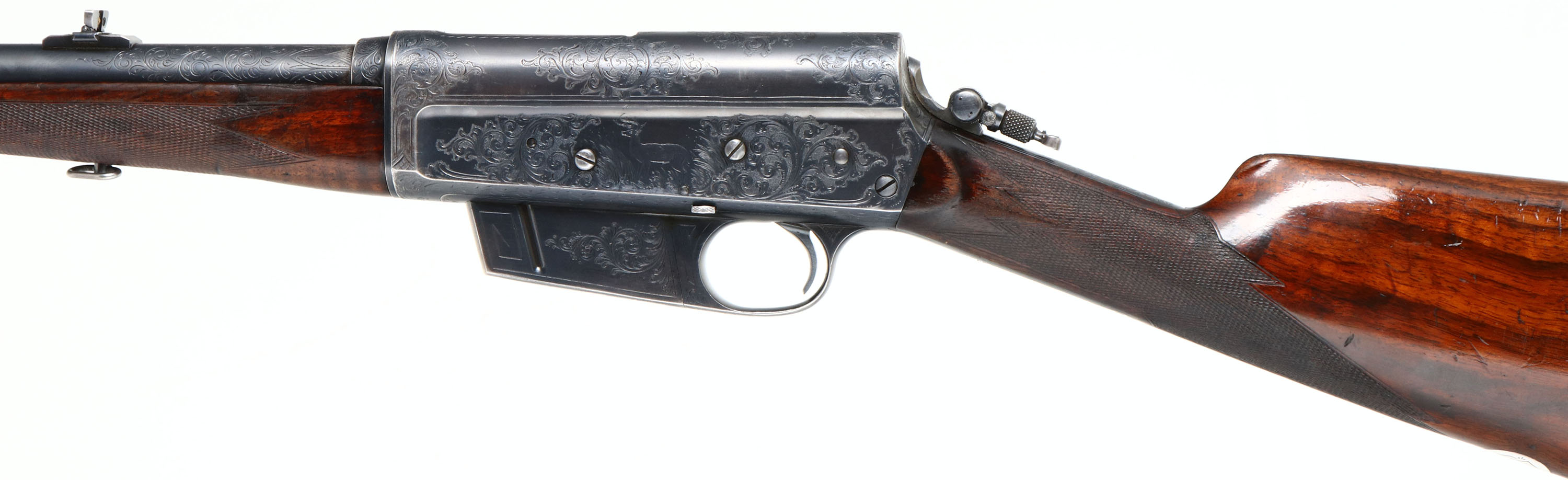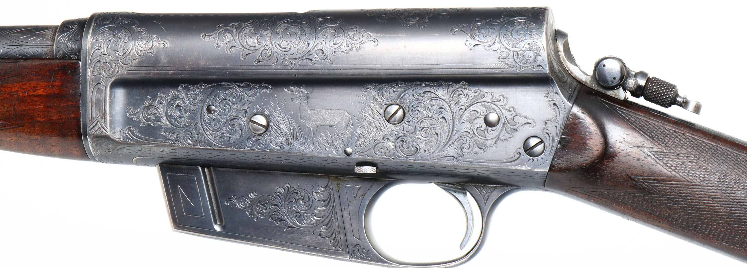 FANTASTIC ENGRAVED Remington, Model 8 No. 5 Expert Grade or later known as an ''E'' Grade, Custom Shop Rifle, marked .25 Rem., MFG. 1909, SN: 13359, Semi-Auto Rifle, 22'' barrel, This rifle, invented by John Browning, was America's first successful semi auto high-power rifle. 5 shot fixed magazine. These take down rifles were often broken down into the 22'' & 20'' halves & placed into leather cases for train rides to countryside hunts & shoots. The special order rifle has high grade English walnut wood stock & forearm, which are excellent, with nice figure to the grain. Factory checkering is 22 lines-per-inch. The stocks carry the original factory finish, with added oils & show minor handling scuffs, scratches & dings. The inlaid silver initial plate in the belly of the stock is inscribed with art deco initials ''RES''. The original metal blue finish rates 90%, with blue thinning at the carry points of the receiver & barrel. The large receiver side panels are covered with what Remington marketed as ''rich scroll hand engraving & game scenes''. The left side of receiver is engraved with a large standing buck in a grassy meadow. Engraving also found on base of magazine, safety, trigger guard, tangs & barrel jacket. Bore is excellent & bright, with high lands & grooves. Rifle fitted with a Lyman tang sight, folding leaf rear sight & silver bead front blade sight. Tight action & functions as it should. A very rare & highly collectible example of Remington's custom shop talents.* FFL or C&R Req. - Value: 7500 to 12500