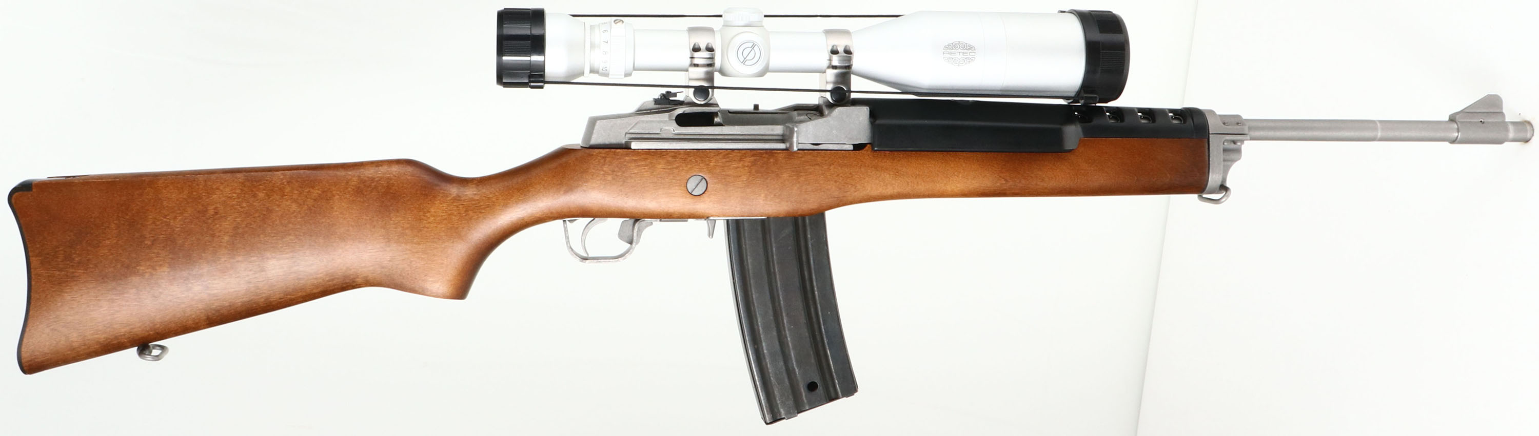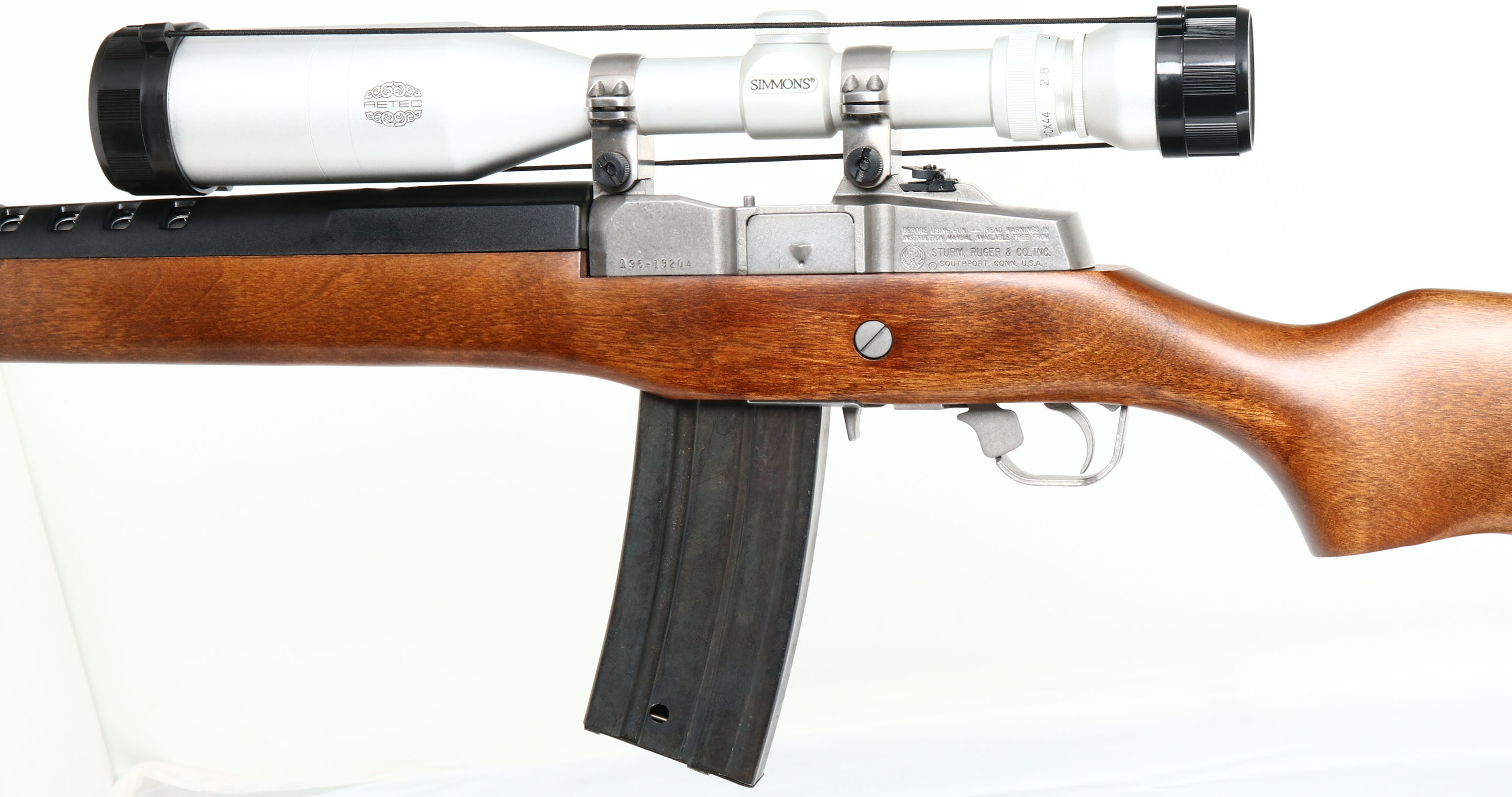 Ruger Model ''Mini 14'', CAL: 223, MFG: 2000, SN:196-13204, Semi-Auto Rifle, 18'' round barrel. The original flat pistol grip wood stock & factory finish are near mint. The stainless steel barrel & receiver are also near mint. Bore is excellent. The rifle is fit with a Simmons RETEC 2.8-10 X 44 scope & the original flip receiver sight & large blade front sight. Stock carries a smooth plastic carbine buttplate. Sling swivels. Comes with two Ruger standard capacity mag, one 30 Rd. mag, factory instruction manual, sight adjusting tool & lock. Near mint overall, & nicely equiped with a great scope & extra mags. FFL Req. - Value: 800 to 1200