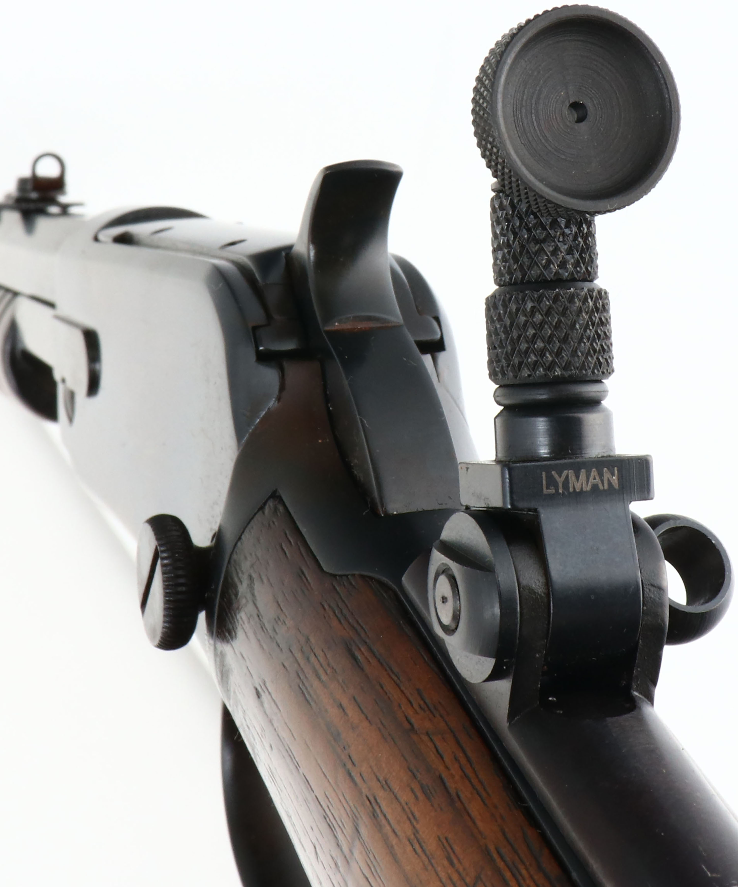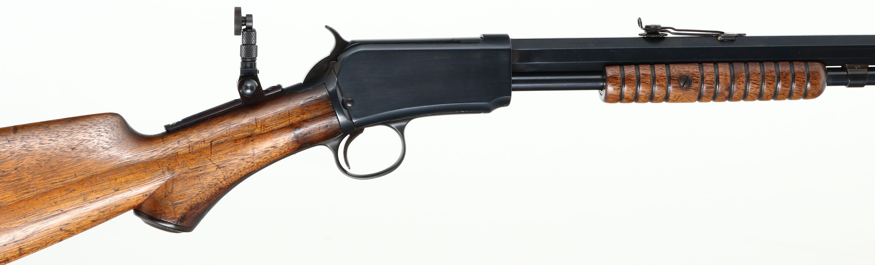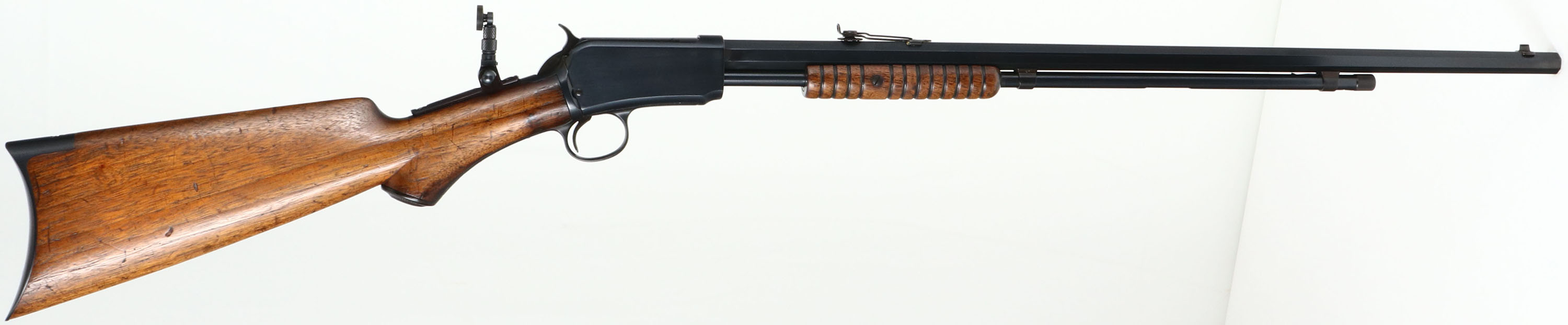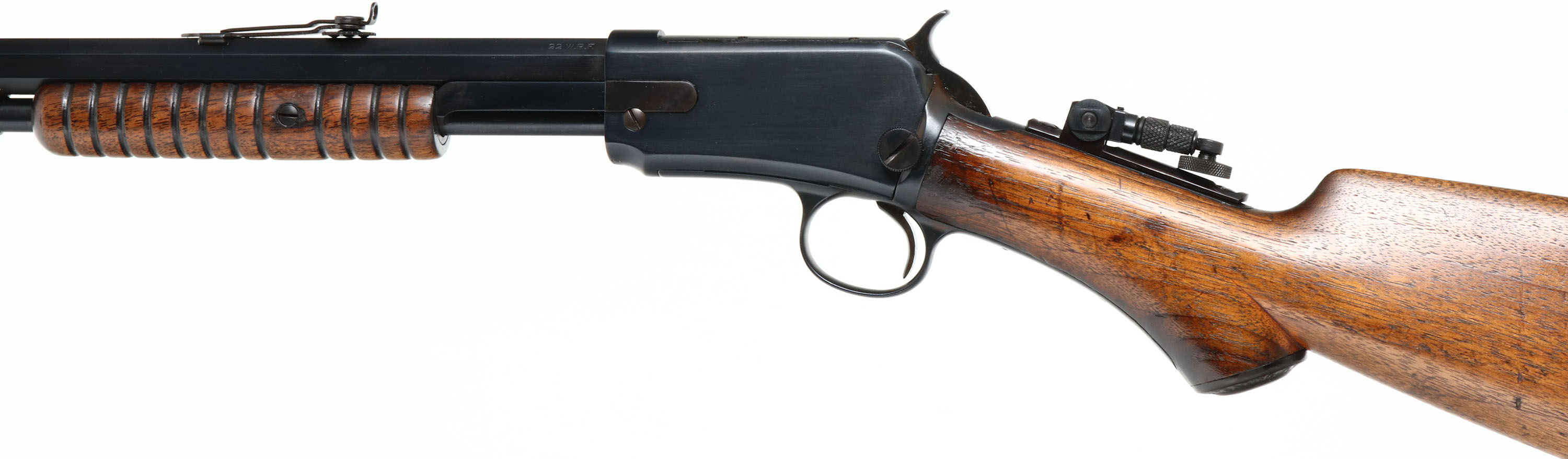 RARE SEMI-DELUXE Winchester, Model 1890 2nd variation, .22 WRF Cal., MFG. 1907, SN: 326270, Pump Action Rifle, 24 3/8'' Octagon barrel. The original, semi-deluxe, non-checkered & capped pistol grip wood stocks are very good. The original finish is very good, thinning some at the handling points & with small scuffs, scratches & contusions. The refinished metal blue/black finish has 99% coverage, with a few spots toning to a plum/brown patina. The rifle is fitted with a Lyman tang sight, with large aperture disk. Barrel carries a wheel adjusting rear sight & a standard front sight. The bore is very good, but with spots of roughness amongst strong rifling. Crescent metal buttplate. Tight smooth action. A fairly rare non-checkered semi deluxe WRF rifle, nicely configured. FFL or C&R Req. - Value: 1000 to 2000