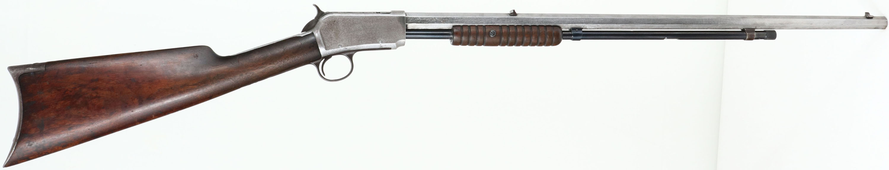 RARE Winchester, Model 1890, 1st Variation, CAL: 22 SHORT, MFG: 1891, SN: 8958, Pump Action Rifle, 24 3/8'' Octagon barrel. Early 2nd yr case-hardened gun. The original straight grip stock & corncob forend are very good & solid, with the original finish wearing thin & darkened with age & use. There are some minor, with scrapes, nicks & dings. The metal blue finish on the barrel has worn & been heavily buffed to silver leaving abrasions & scarring. Ironically, the roll stamp & caliber marking remain. The non-professional who did this appears to have tried to prepare the barrel for restoration, but left it very rough & did not proceed further. The case-hardened receiver has also worn & been polished silver, but mostly smooth & without the scarring like the barrel. The top of the bolt & trigger guard have natural brown patina. Mag tube has 75% of original blue. Bore is poor, with some visible rifling amongst heaving pitting & roughness. The barrel holds a fixed rear sight & blade front sight. The buttstock carries a smooth crescent metal buttplate. Early production rifle, in short only, which would benefit from a completed restoration. Antique, No FFL Req. - Value: 300 to 600