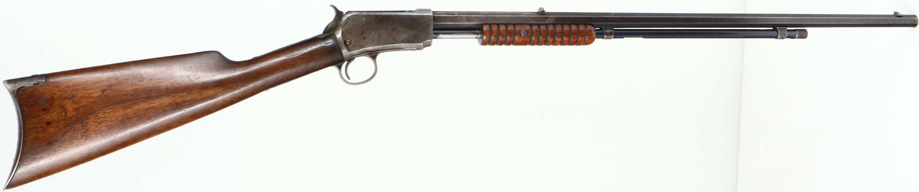 Winchester, Model 1890 2nd variation, .22 SHORT Cal., MFG. 1894, SN: 30930, Pump Action Rifle, 24 3/8'' Octagon barrel. The original straight grip wood stocks are very good & solid, appearing to carry the original finishes. Due to swelling & shrinkage, there is some fill at the wrist where the stock meets the receiver. There is also minor handling marks & light scratches. The original metal blue finish has worn & faded to a gray, toning brown finish remaining at 50% on the barrel, 70% on the mag. The case-hardened receiver displays the faint remains & outlines of original case-colors. The barrel holds a fixed rear & blade front sights. The bore is good, with some roughness amongst strong rifling. Crescent metal buttplate. Tight smooth action. Mag tube has LR sized feeding slot. The rifle has a nice appearance as an early case-colored, 2nd variation, Short only rifle. Antique No FFL Req. - Value: 500 to 1000