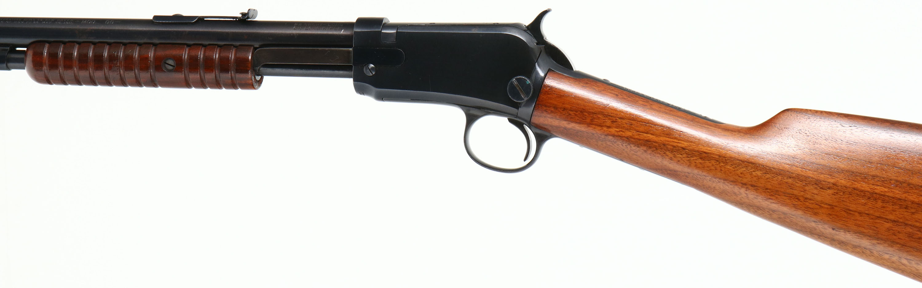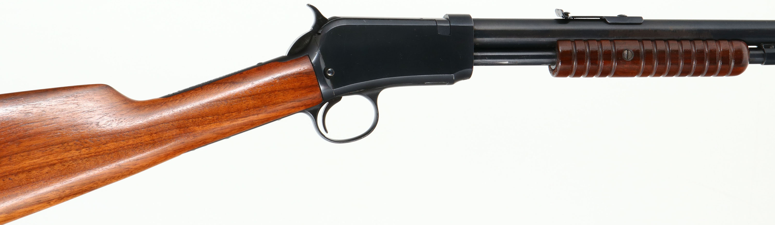 FANTASTIC Winchester, Model 06 , .22 S. L. LR., MFG: 1923, SN: 656731, Pump Action Rifle, 20'' Round barrel, The original straight grip walnut stocks are excellent, with wonderful straight grain. The forearm is of the corn cob style of the model 1890. The original finish is excellent, with virtually no rubs or handling marks. The original metal blue finish on the barrel is 95%, with a handful of spot of flakey finish loss toning to a brown patina. The receiver & mag tube display 98% of the original blue. Bore is excellent. Fitted with standard barrel sights. Winchester plastic buttplate, with engraved screws. A truly excellent, original & collectible condition example.* FFL or C&R Req. - Value: 2500 to 4000