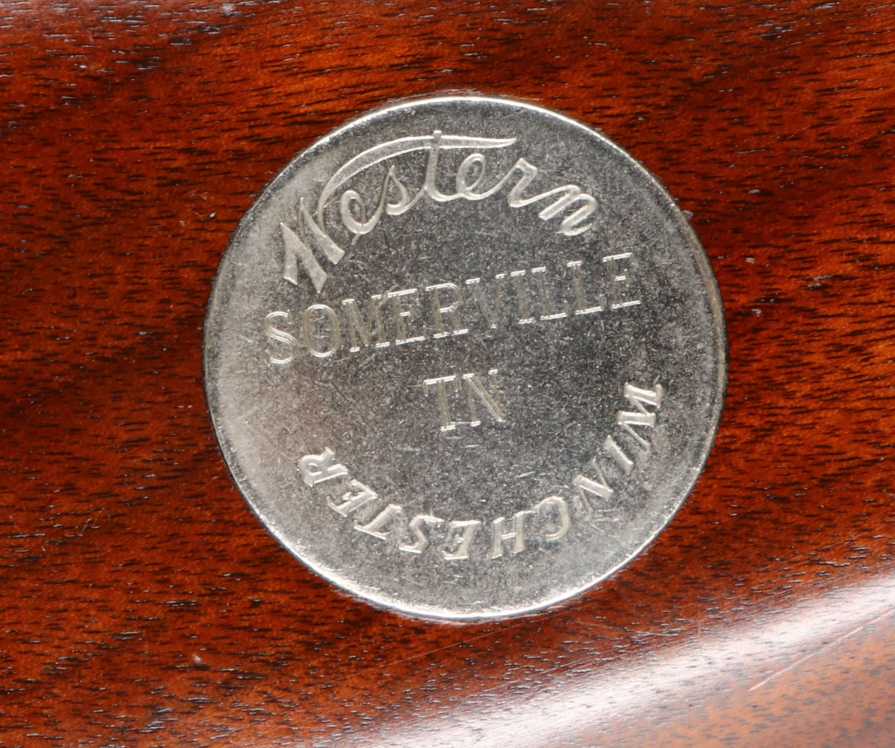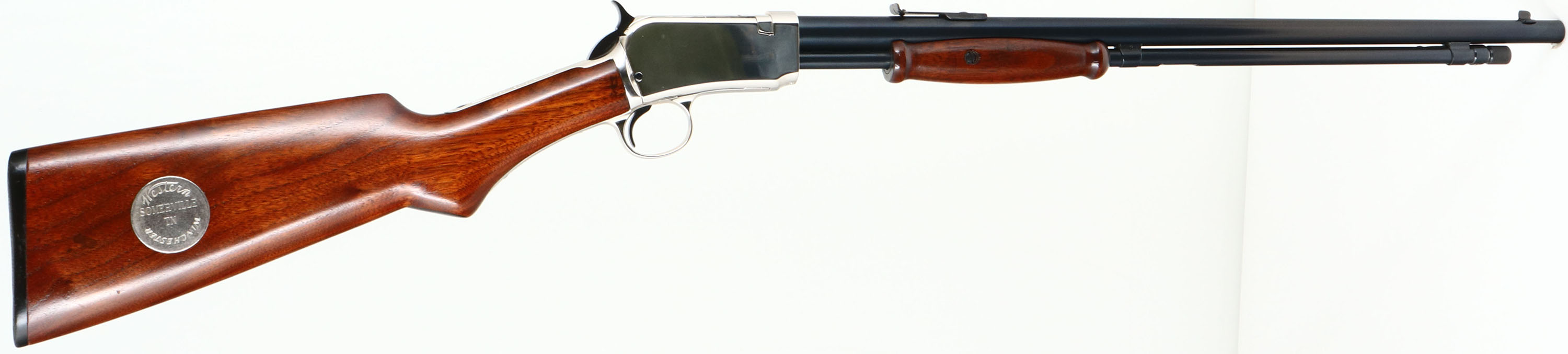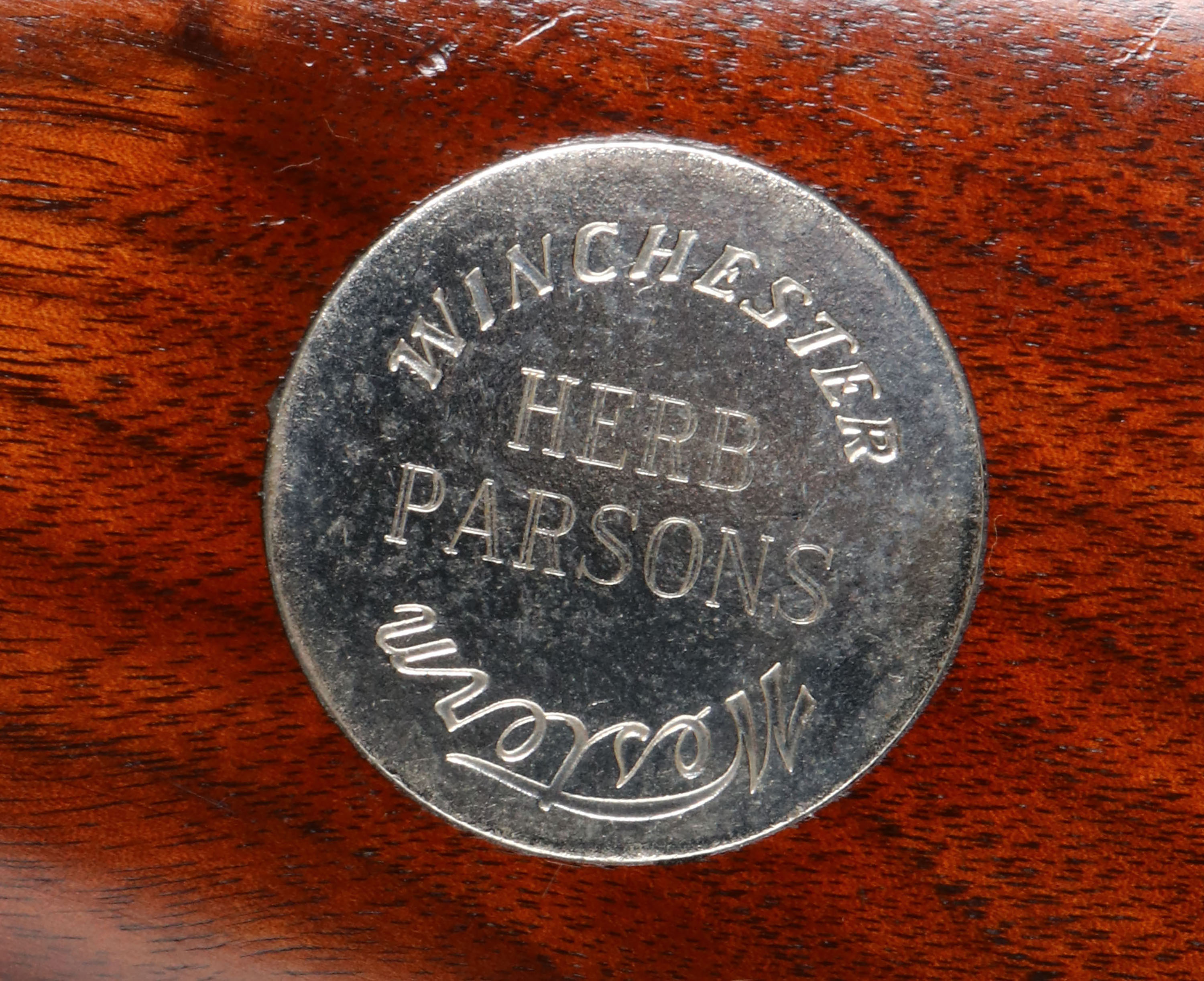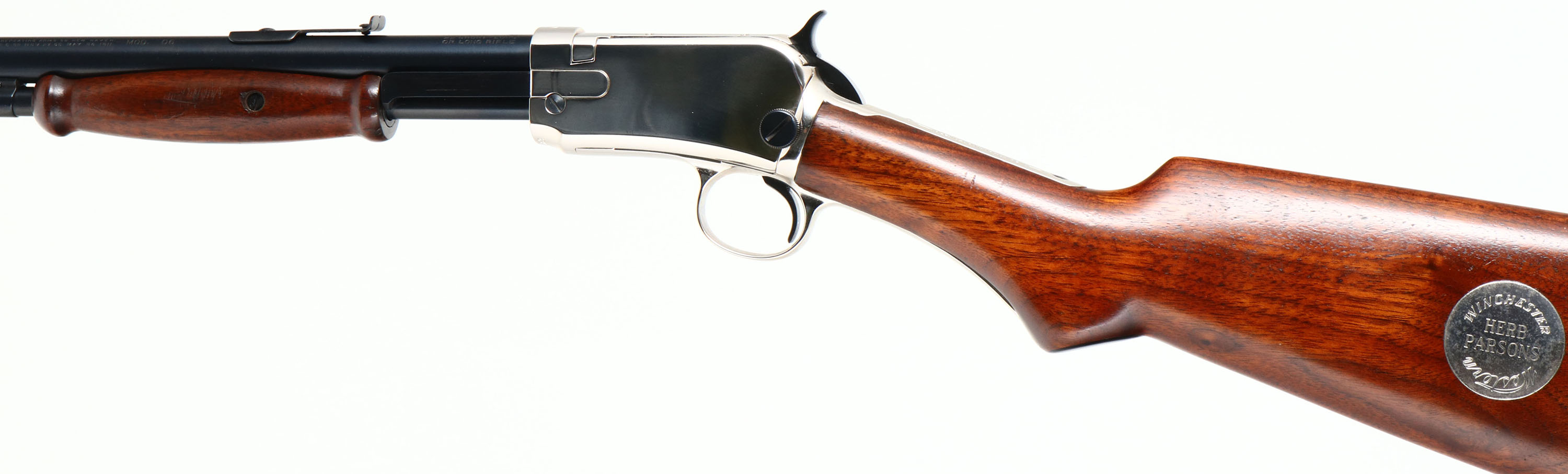 UNIQUE & RARE Winchester, Model 1906 Expert, 1/2 Nickeled, .22 S. L. LR., MFG: 1919, SN: 584523, Pump Action Rifle, 20'' Round barrel. This rifle was presented to Herb Parsons, who was a famous Winchester trick shooter. The rifle was sold to the current consignor back in the late 80's or 90's from the Herb Parsons estate by his son. Unfortunately, a letter from the son authenticating it was never obtained & it was recently discover that the son also passed some 5 years ago. Expert models are similar to the standard 1906 models, but with pistol grip & a hour-glass smooth forearm. Approximately 70,000 Experts were made from 1917-25, but only a small percentage were nickeled. This rifle was fully & professionally restored before it prepared for presentation to Herb. The original pistol grip wood stocks are excellent, having been lightly sanded & very nicely refinished. The stocks have very few handling marks. There is a black diamond shaped inlay in the pump forend & a matching inlaid black cap on the pistol grip. The sides of the stock has been inlaid with vintage Winchester / Western target tokens with ''SOMERVILLE TN'' (Herb's hometown) being engraved on the one on the right side & the left side engraved with his name ''HERB PARSONS''. The restored metal blue finish on the barrel & mag is excellent rating 98%. The restored nickeled finish on the receiver & trigger guard is like wise excellent, rating 100%. Bore is excellent. Fitted with standard barrel sights. Winchester plastic buttplate. A very nicely restored & upgraded Expert rifle, which presents fantastically. FFL or C&R Req. - Value: 1000 to 3000