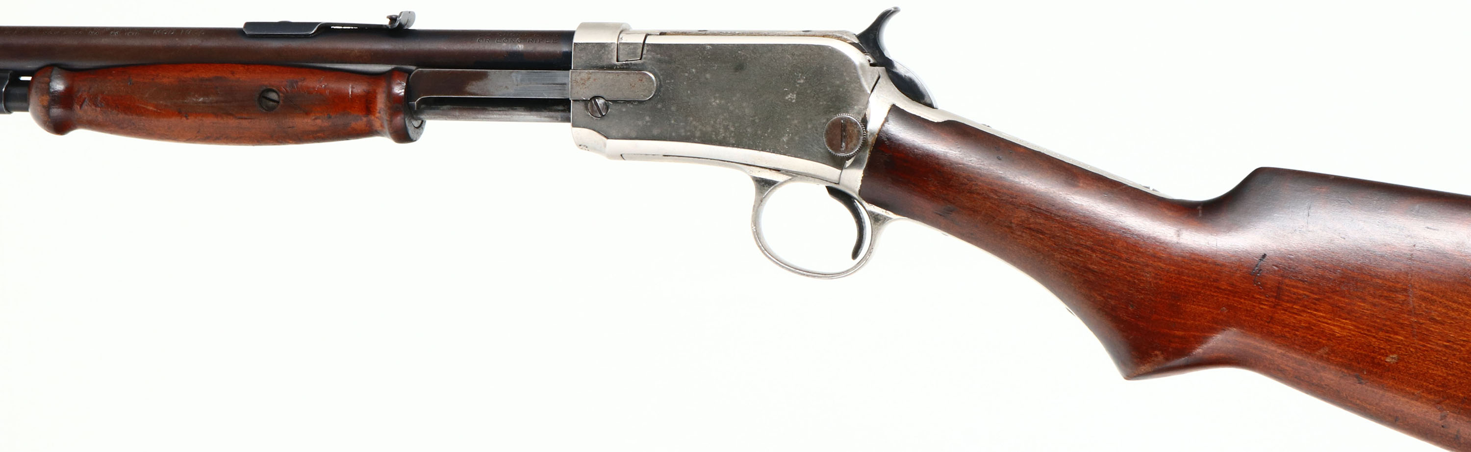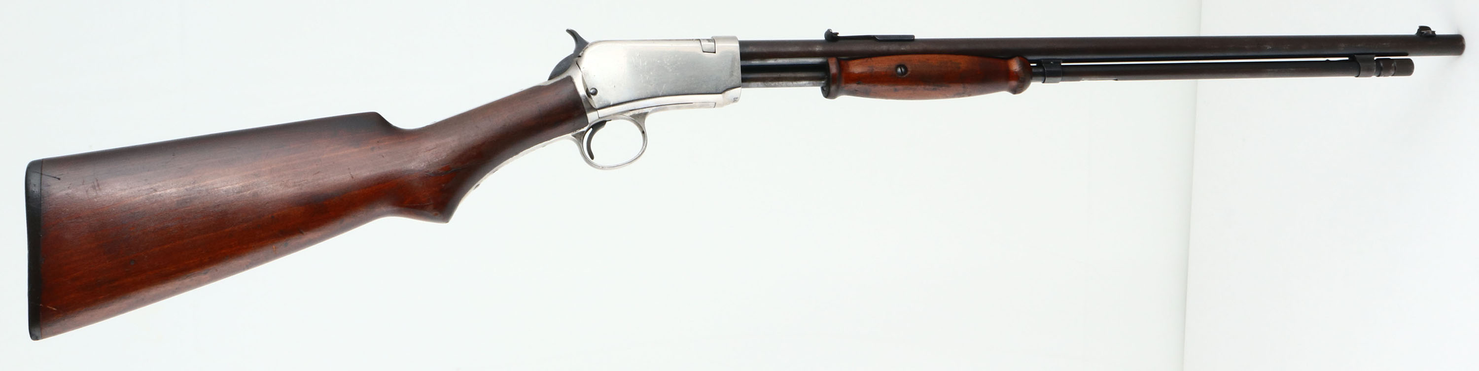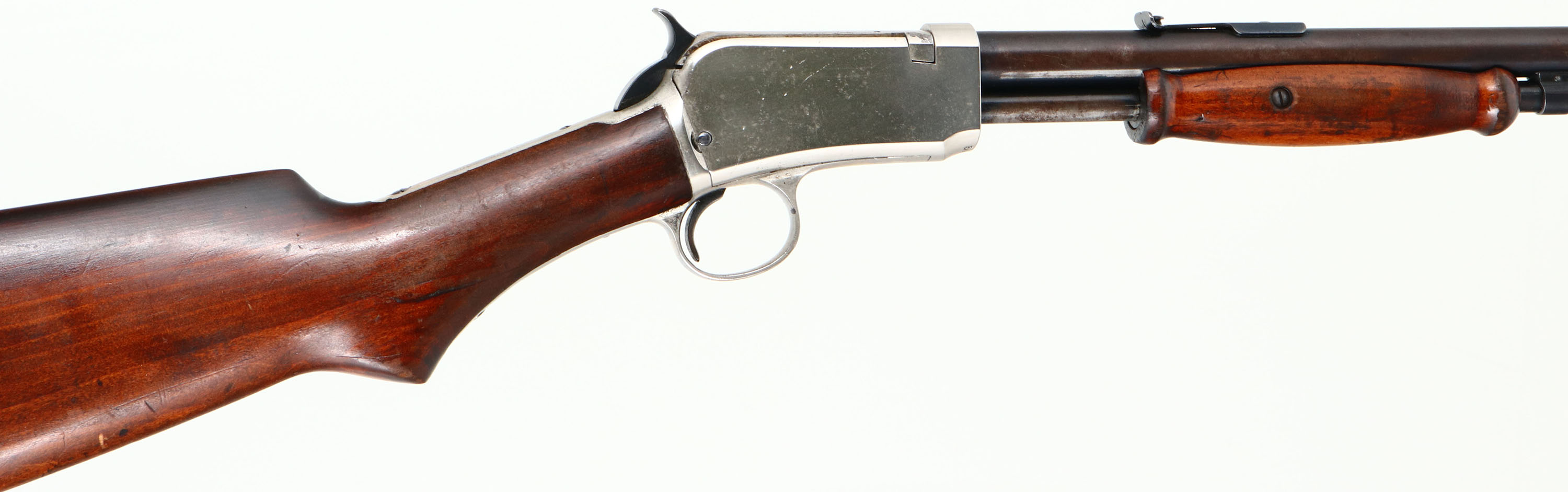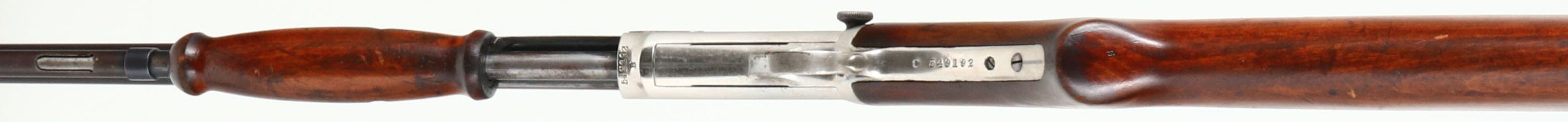 RARE Winchester, Model 1906 Expert, 1/2 Nickeled, .22 S. L. LR., MFG: 1919, SN: 549192, Pump Action Rifle, 20'' Round barrel, Expert models are similar to the standard 1906 models, but with pistol grip & a hour-glass smooth forearm. Approximately 70,000 Experts were made from 1917-25, but only a small percentage were nickeled. The original gum wood stocks are very good, with the original finish thinning at the wrist & pump forend from normal use. The stocks also display several minor scratches, rubs & minor contusions. The original metal blue finish on the barrel & mag has worn mostly gun metal gray, with a thin layer of brown patina & some original blue remaining in protected areas. The receiver carries the original special ordered nickeled finish, which is excellent with some speckling. Bore is excellent. Fitted with standard barrel sights. Winchester plastic buttplate. A fairly rare & collectible original condition rifle. FFL or C&R Req. - Value: 800 to 1500