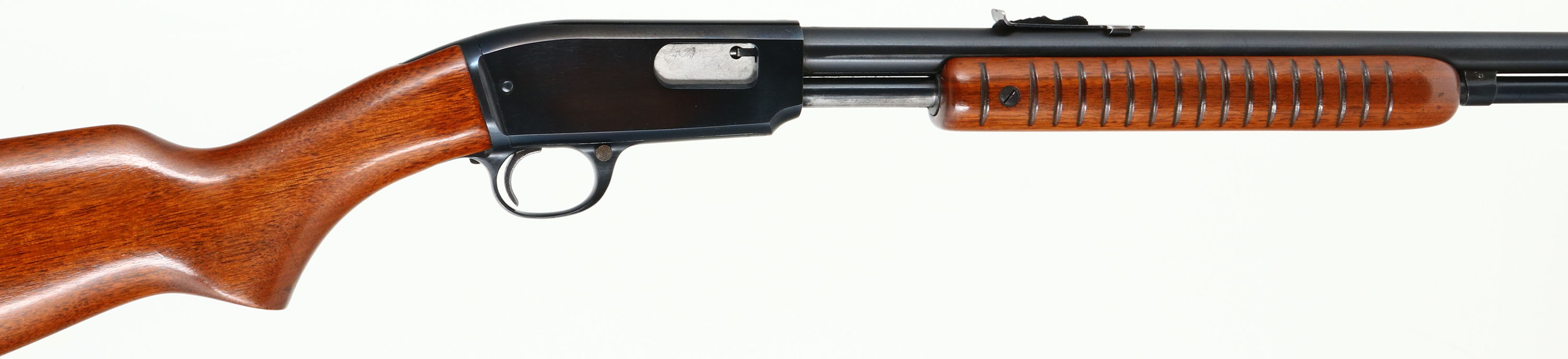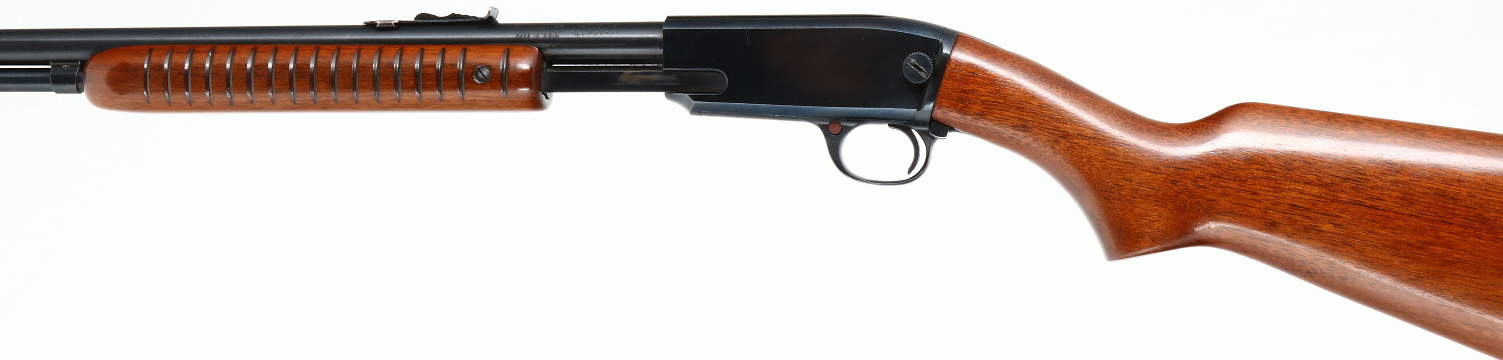 Winchester, Model 61, CAL: .22 S. L. or L.R., MFG: 1959, SN: 265285, Pump Action Rifle, 24'' Round barrel. Grooved receiver. The original flat pistol grip wood stock & grooved forend are excellent, with excellent original fining & a couple of minor contusions. There are two tiny letters lightly scratched into the flat of the pistol grip. The original metal blue finish rates 98% overall. Bore is excellent. The barrel holds the original adjustable rear & small blade front sights. Buttstock carries the earlier checkered metal buttplate. Smooth action. Excellent, original & collectable example.* FFL or C&R Req. - Value: 1000 to 1600