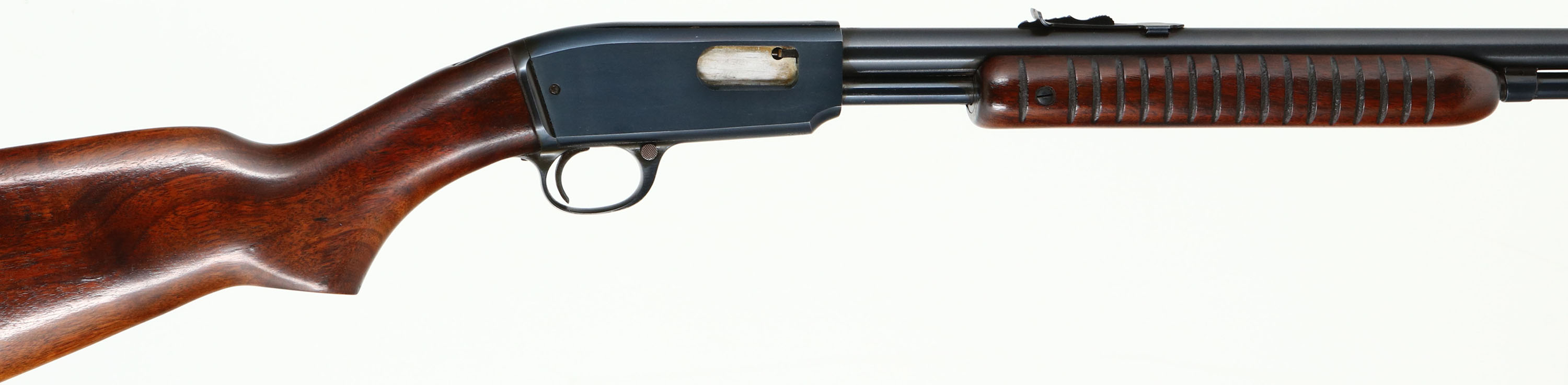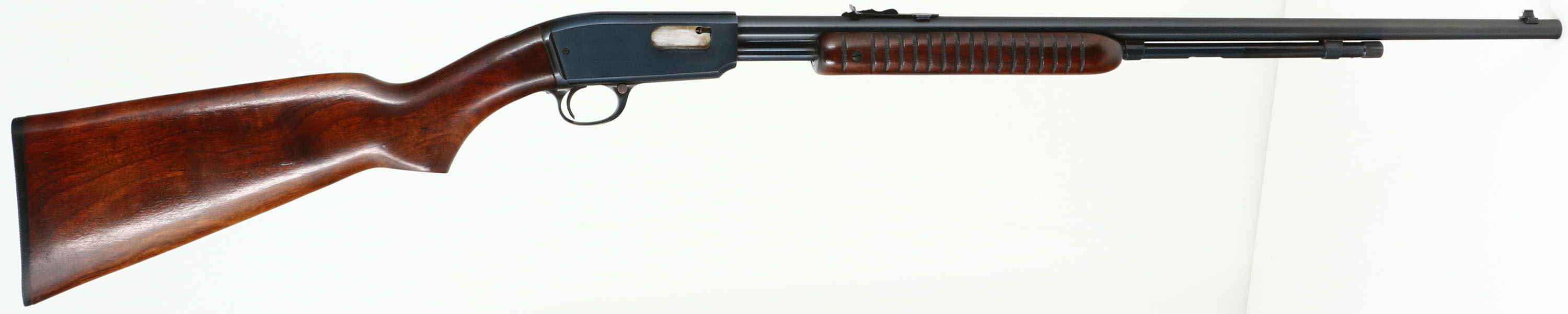 Winchester, Model 61, CAL: .22 S. L. or L.R., MFG: 1959, SN: 264768, Pump Action Rifle, 24'' Round barrel. Grooved receiver. The original flat pistol grip wood stock & grooved forend are excellent, displaying very few minor, contusions, scrapes & scratches to the original finish. The original metal blue finish rates 97% overall. Bore is excellent. The barrel holds an adjustable rear & small blade front sights. Buttstock carries a plastic Winchester logo buttplate. FFL or C&R Req. - Value: 600 to 1200