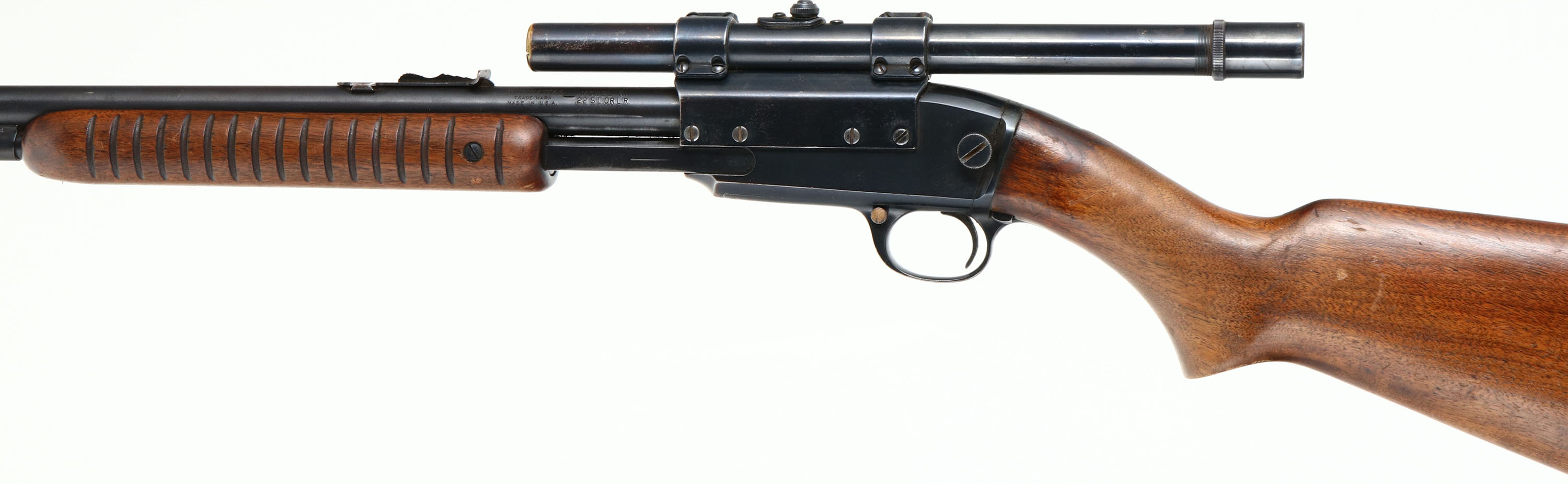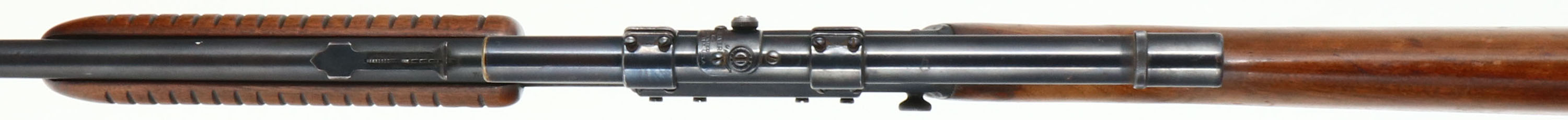 Winchester, Model 61, CAL: .22 S. L. or L.R., MFG: 1951, SN: 176052, Pump Action Rifle, 24'' Round barrel. The original flat pistol grip wood stock & grooved forend are very good, displaying numerous small, contusions, scrapes & scratches to the original finish, which is wearing thin at the wrist & forend. The original metal blue finish rates 80% overall. Bore is excellent. The receiver is fitted with a side mounted Weaver G4 scope, while the barrel holds an adjustable rear & small blade front sights. Buttstock carries the earlier checkered metal buttplate. Smooth action. Likely a good shooter FFL or C&R Req. - Value: 300 to 600