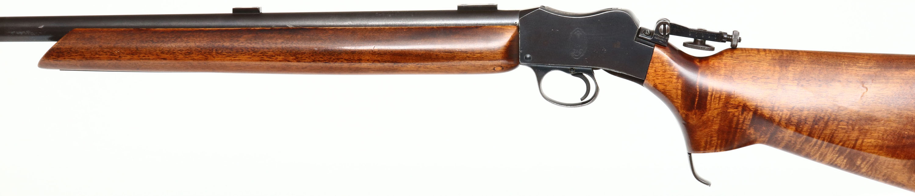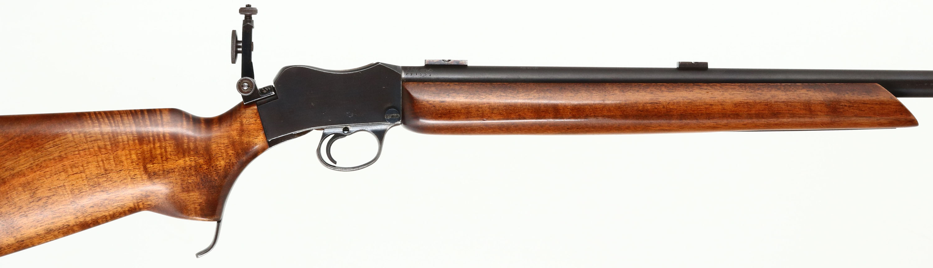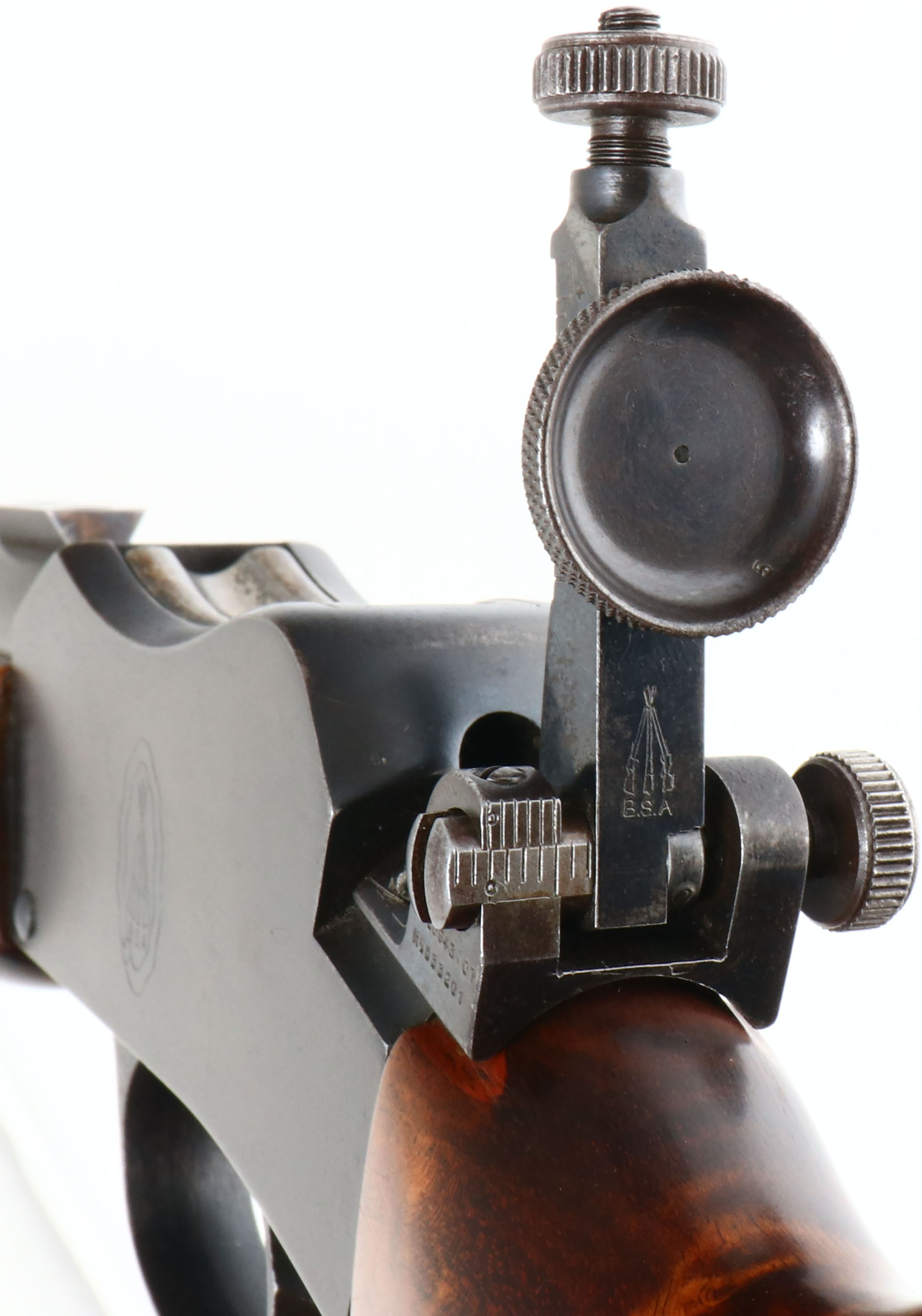 The Birmingham Small Arms Co. (BSA), Martini Henry Target Rifle, CAL: marked 220 Long Rifle & 22 LR, MFG: Circa the turn of the century, SN: P71509, Single Shot Breech Loading Rifle, 29'' barrel. The cheeked, flat pistol grip wood stock & target style forend are very good & solid. There are (4) dowel fills on the receiver end of the forend, (2) small & (2) tiny. The stocks were lightly sanded & refinished, likely after the dowel placement. There is a 5 1/2'' accessory rail on the bottom of the forend, frequently used for hand rests for these types of rifles. The metal blue finish rates 90% overall, beginning to tone to a smooth gray/brown patina. Bore is excellent. The receiver holds an adjustable flip-up sight, with large aperature disc. The barrel is tapped & drilled with two mounted bases for optics & a large hooded disc front sight. Stock has a BSA marked grooved black plastic buttplate. Adjustable trigger (very light) >1lb. A very good bench shooting target rifle. FFL or C&R Req. - Value: 300 to 600