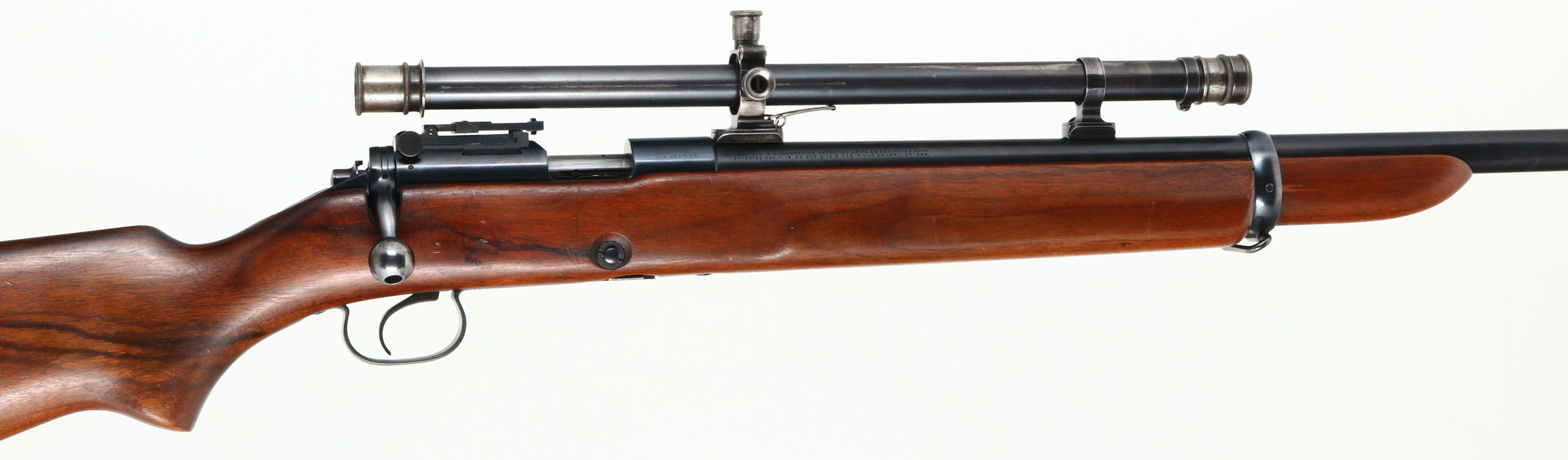 Winchester, Model 52 Target Rifle, CAL: 22 LR, MFG: 1930, SN: 19999, Bolt Action Rifle, Rare 28'' Stainless barrel. The original flat pistol grip & later variation non-groove forend wood stock is excellent, with light scrapes, scratches & dings to the original finish. The metal blue refinish rates 90% overall, with some splotchy areas of thinning on the barrel. Bore is excellent. The receiver holds the correct flip-up ladder sight & the barrel holds a raised front blade sight. No rear sight provision, instead the barrel is fitted with factory scope blocks, which carry Winchester scope rings & a Winchester A5 scope. Proof stamping on receiver & barrel were correctly stamped to the left side allowing for the factory mounted scope. Buttstock carries a checkered metal buttplate. Sling loop on stock & front barrel band. Original Winchester stamped detachable mag. An excellent & very good condition, factory scoped 52 target. Very collectible. FFL or C&R Req. - Value: 800 to 1500
