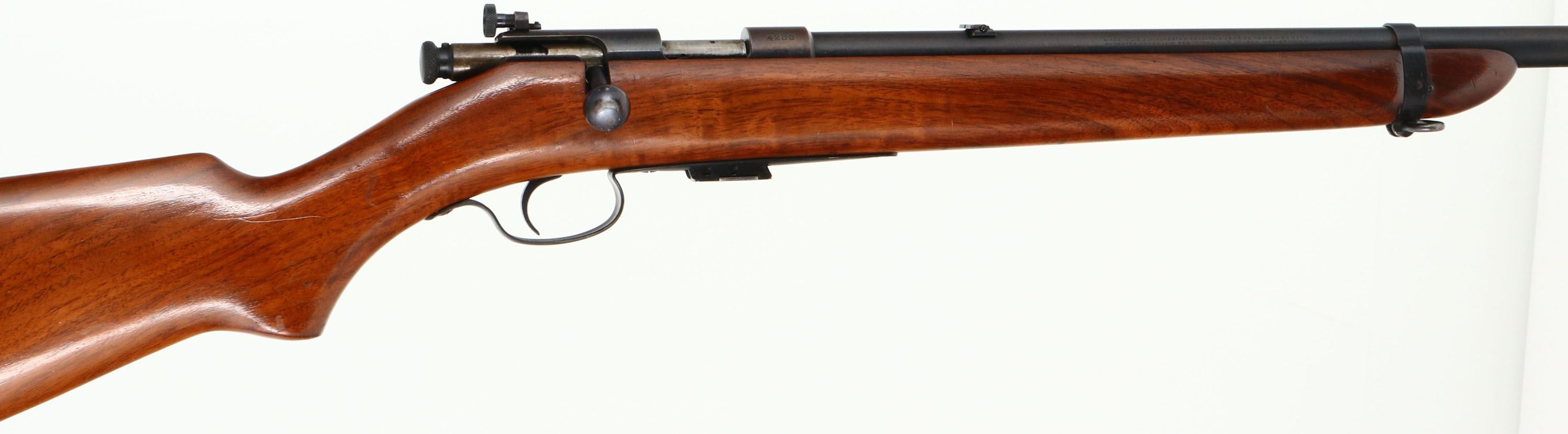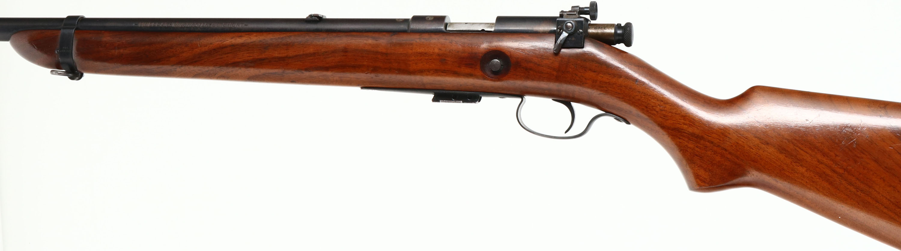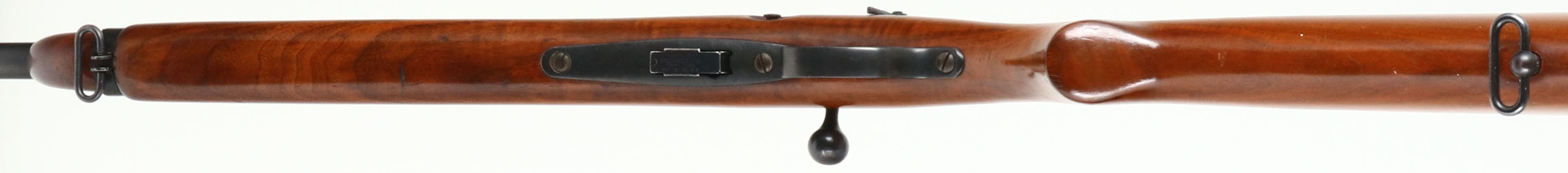 BOXED Winchester, Model 57 Target, .22 SHORT Cal., MFG. 1928, SN: 4283, Bolt Action Rifle, Mag fed, 22'' barrel, with barrel band. The model 57 was made from 1927-36, but the .22 Short only was discontinued in 1930. The original flat pistol grip wood stock is excellent & solid, with very few handling marks to the finish. There is some edge staining on the edge near the toe. The original metal blue finish rates 80% overall, with areas of thinning toning to a brown patina. Bore is excellent, Military style target rifle, with correct Lyman peep sight, factory sling swivels & ''Winchester'' stamped mag. Barrel fitted with a folding leaf rear & blade front sight. Stock carries a checkered steel buttplate. Come in the correct, nearly 100 year old, factory box, with dividers & paper wrap. An very nice rifle & very collectible with its original box.* FFL or C&R Req. - Value: 2500 to 3500