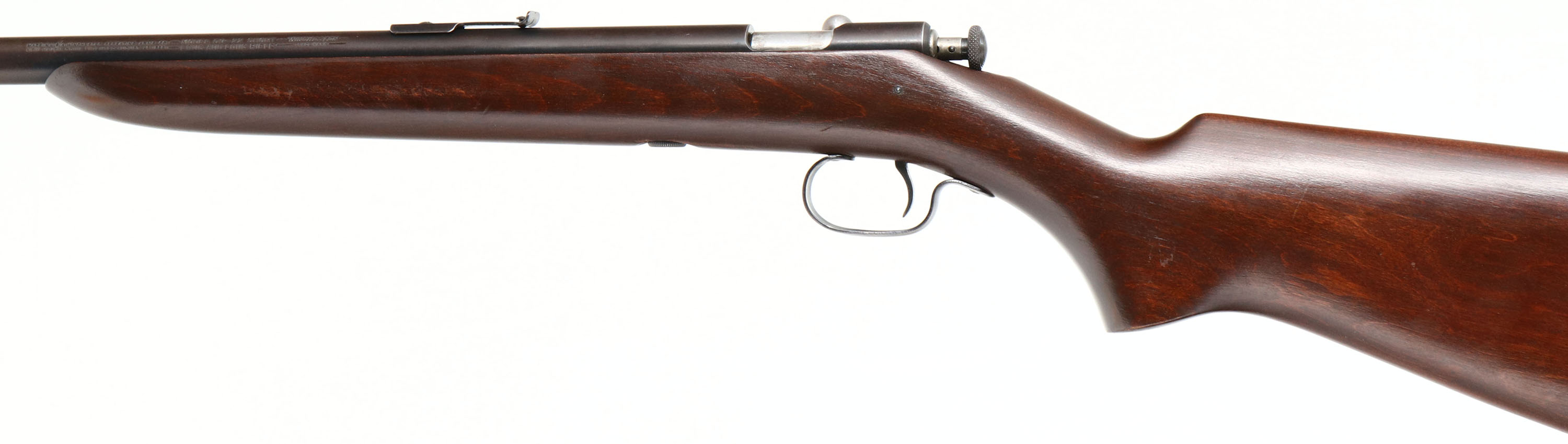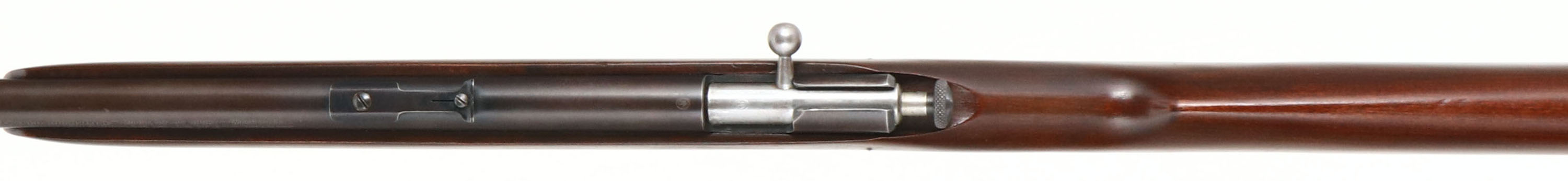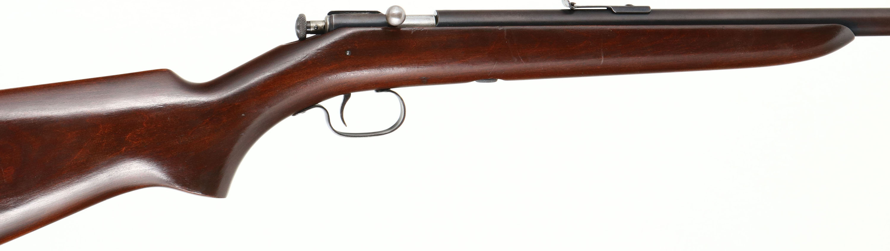 Winchester, Model 59, .22 S. L. LR. Cal., MFG. late 1930-31 SN: none, Bolt Action Rifle, 23'' barrel, Improved upon model 58. The original pistol grip wood stock is excellent & solid, with a few minor contusions & scratches to the original finish. The metal finishes have toned to an even chocolate brown patina. Bore is excellent. Barrel holds an adjustable rear & standard front sights. Winchester marked plastic buttplate. Very nice original condition & rare with production limited to two years & approx. 9,200 mfg. FFL or C&R Req. - Value: 400 to 800