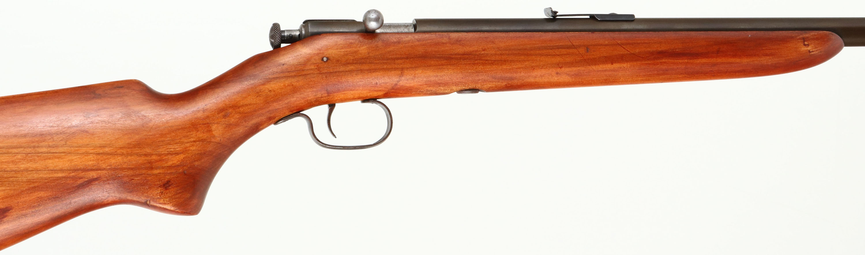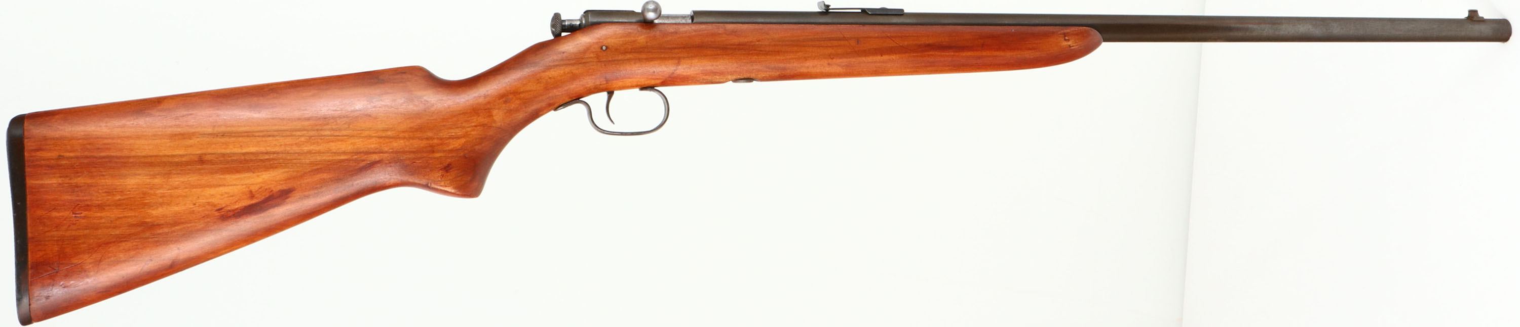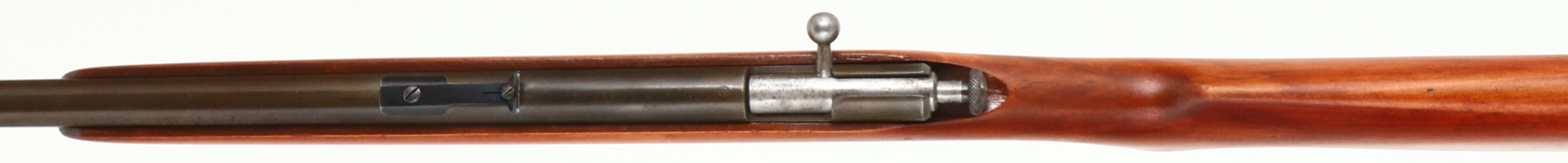 Winchester, Model 59, .22 S. L. LR. Cal., MFG. late 1930-31 SN: none, Bolt Action Rifle, 23'' barrel, Improved upon model 58. The original pistol grip wood stock is very good & solid, having been lightly sanded & refinished. There remains a few minor contusions & scratches. The metal finishes have toned to a thinning gray/brown patina. Bore is excellent. Barrel holds an adjustable rear sight & standard front sight. Winchester marked plastic buttplate. Fairly rare & nice over all condition. Limited two year production of approx. 9,200 mfg. FFL or C&R Req. - Value: 300 to 600