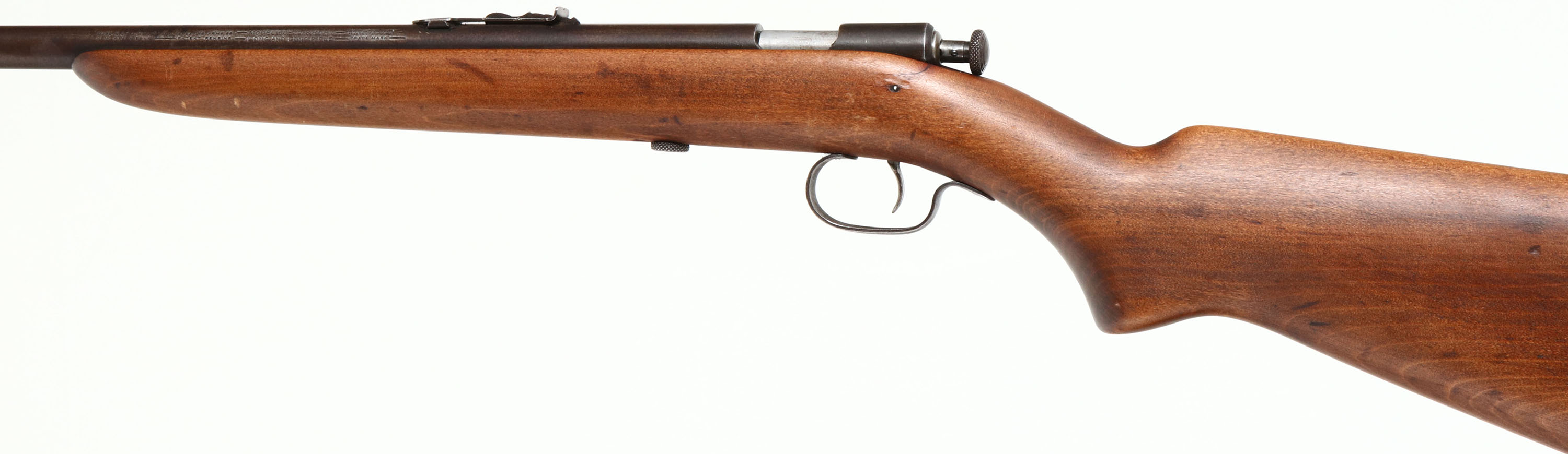 Winchester, Model 60, Early Variation, .22 S.L.& LR. Cal., MFG. 1930-32, SN: None, Bolt Action Rifle, 23'' Tapered round barrel. Single shot. An improved Model 59, This 23'' round barrel was produced in the first 2 yrs, later barrels were increased to 27'' for the last 2 yrs. This rifle also has the early original flat pistol grip petite gumwood stock, which is excellent. It has excellent finish, with a few light scratches, scuff & dings. The metal finishes have toned to a thinning brown patina. Bore is excellent. Original Winchester buttplate. Factory sights. A collectible early example. FFL or C&R Req. - Value: 400 to 800
