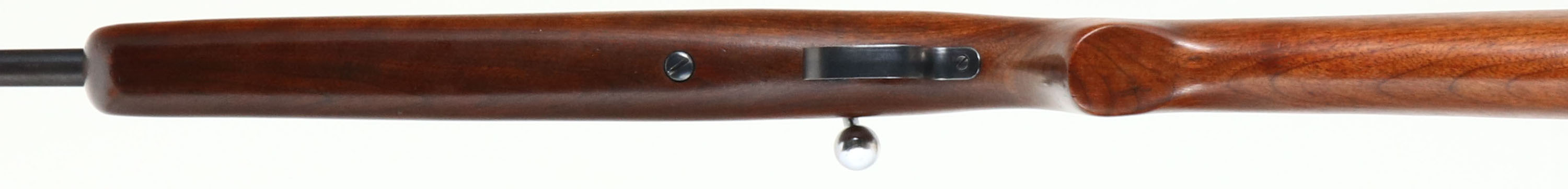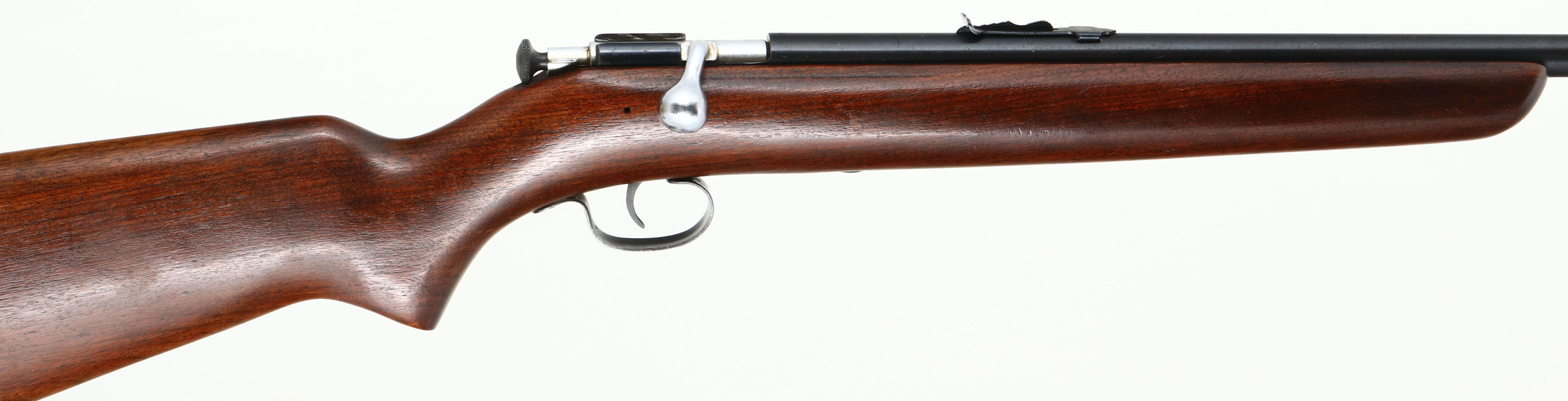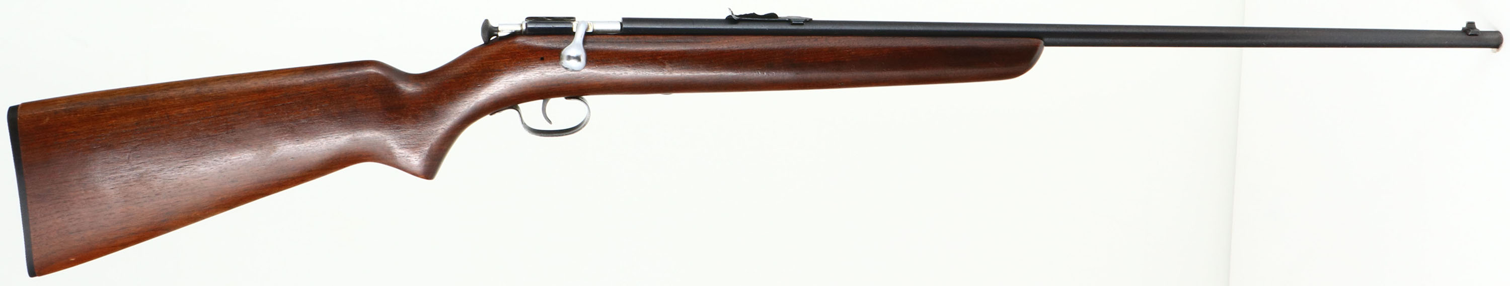VERY RARE Winchester, Model 67 SMOOTH BORE, 3rd Issue, .22 SHORT, LONG AND LONG RIFLE Cal., MFG. 1937-63, SN: None, Take-down Bolt Action Rifle, 27'' Tapered round barrel, Sporting model, Marked ''SMOOTH BORE'' on left side of barrel. This 3rd issue rifle has the factory heavier (no groove), flat pistol grip stock, with the tapered forend, slanted forend tip, flush take-down screw, blued trigger & the earlier chamber marking. The factory flat pistol grip wood stock is excellent, with several small contusions & light handling marks. The metal finish is 97% overall. Bore is excellent. Mounted with original factory sights. Winchester plastic buttplate. A rare smooth bore example & in excellent original condition. FFL or C&R Req. - Value: 600 to 1200