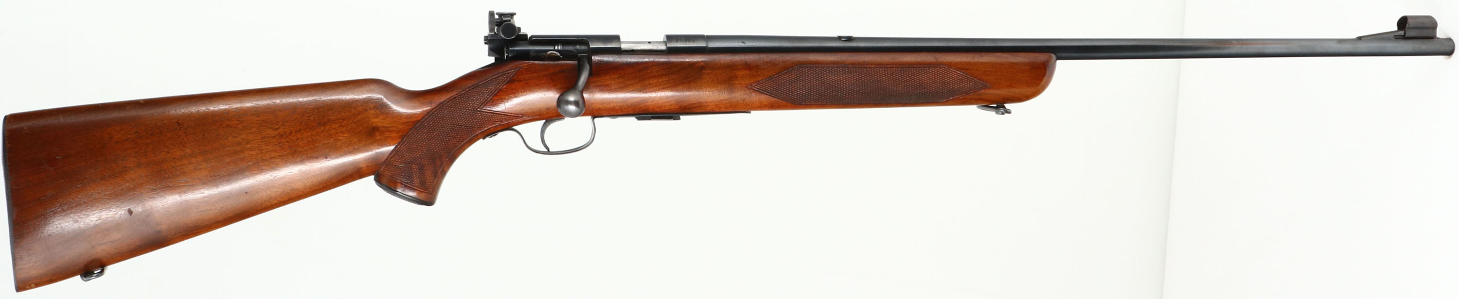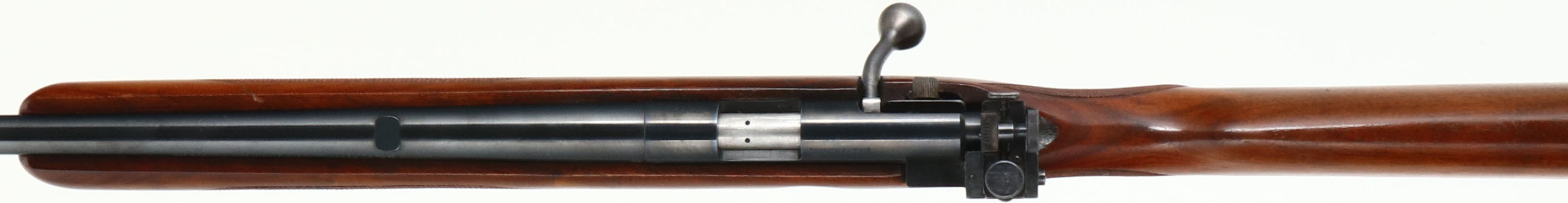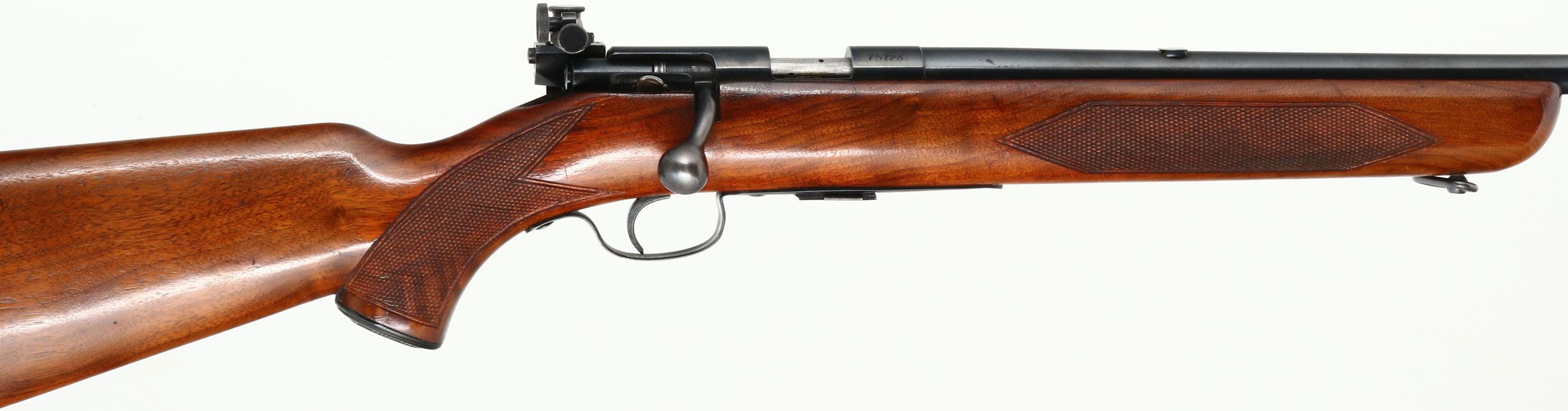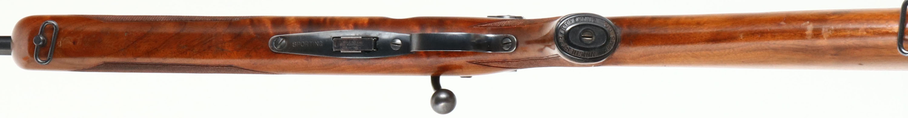 Winchester, Model 75 Sporter, .22 LONG RIFLE Cal., MFG. 1950, SN: 75723, Bolt Action Rifle, 24'' Tapered round barrel, Civilian sporting variation of the Model 75 Target rifle. The factory checkered & capped pistol grip, select walnut stock is excellent & original. Original factory finish is excellent, with sharp checkering & few tiny handling marks. The factory original metal blue finish is 98%. Bore is excellent. Mounted with the correct Lyman 57ES adjustable receiver sight, blank filled rear dovetail & hooded front blade sight. Side push button mag release & correct Winchester marked detachable mag. Winchester metal serrated buttplate. Sling swivels. Comes with a period ''Straight Shooter'' leather sling. Collectible & overall excellent, original condition Sporter example. FFL or C&R Req. - Value: 1000 to 2000