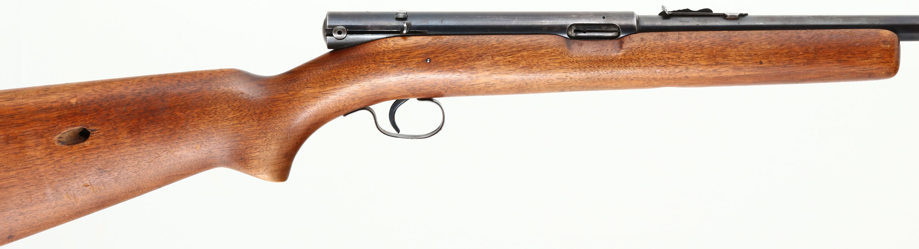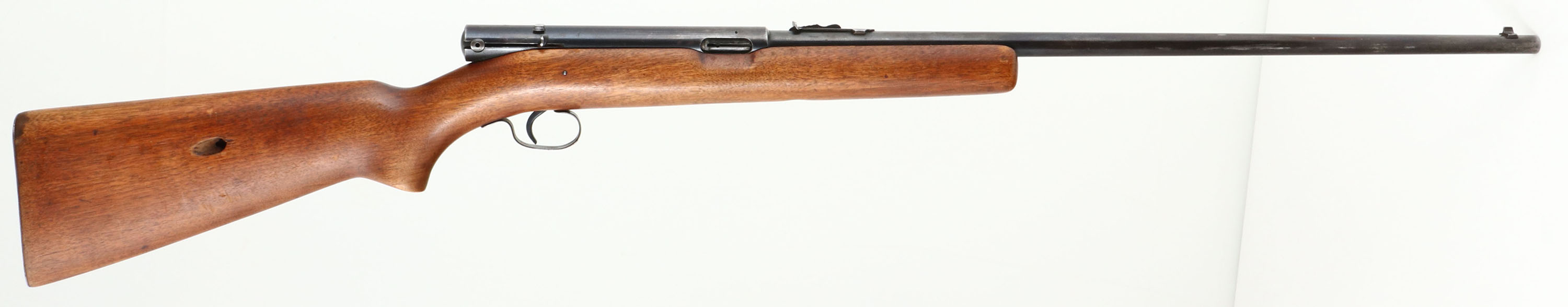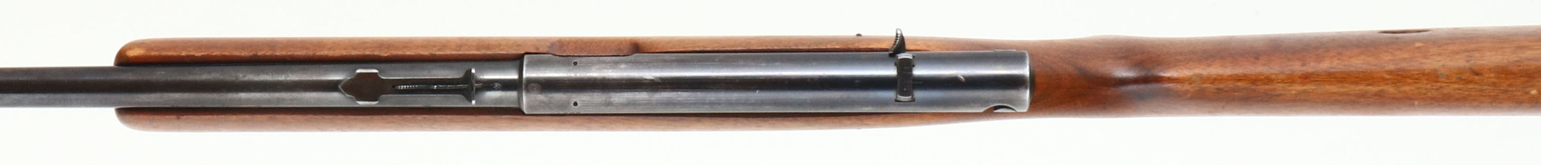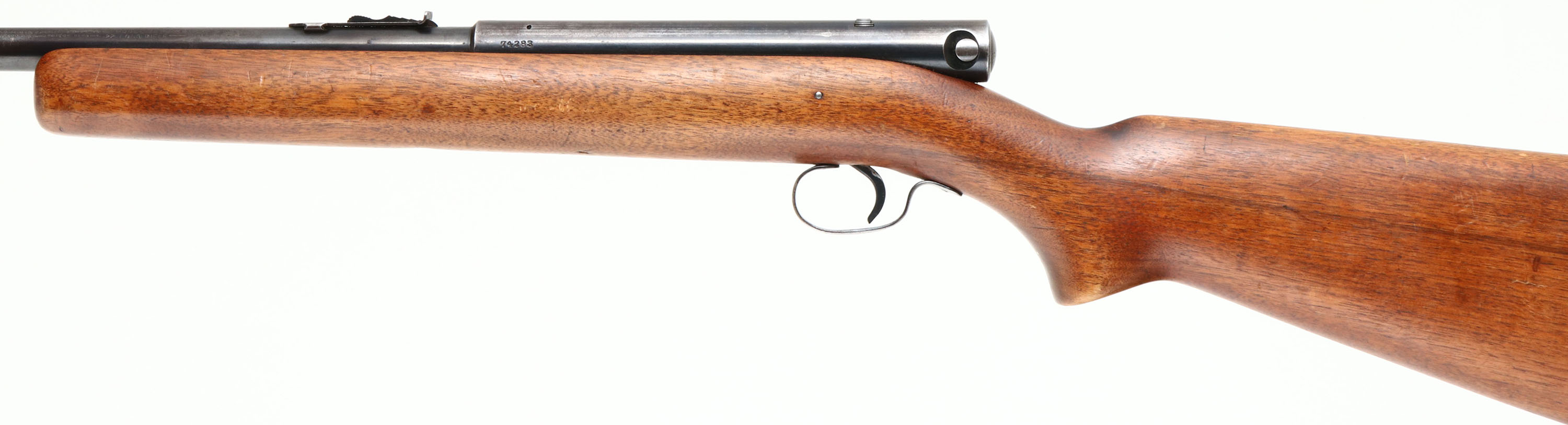 Winchester, Model 74, Marked .22 LONG RIFLE Cal., MFG. 1941, SN: 74283, Semi-Auto Rifle, 24'' Tapered round barrel, This is an example of the early Pre-War variation with a 2'' longer barrel & the blunt forend tip to the stock. The original flat pistol grip wood stock is very good, with several minor scuffs & dings to the thinning original finish. Factory metal blue is 80% on barrel. 70% on the receiver. Bore is excellent. Factory sights. Loads through mag located in the stock. Pre-War variation normally commands a 25% premium. Original semi-auto .22. FFL or C&R Req - Value: 250 to 500