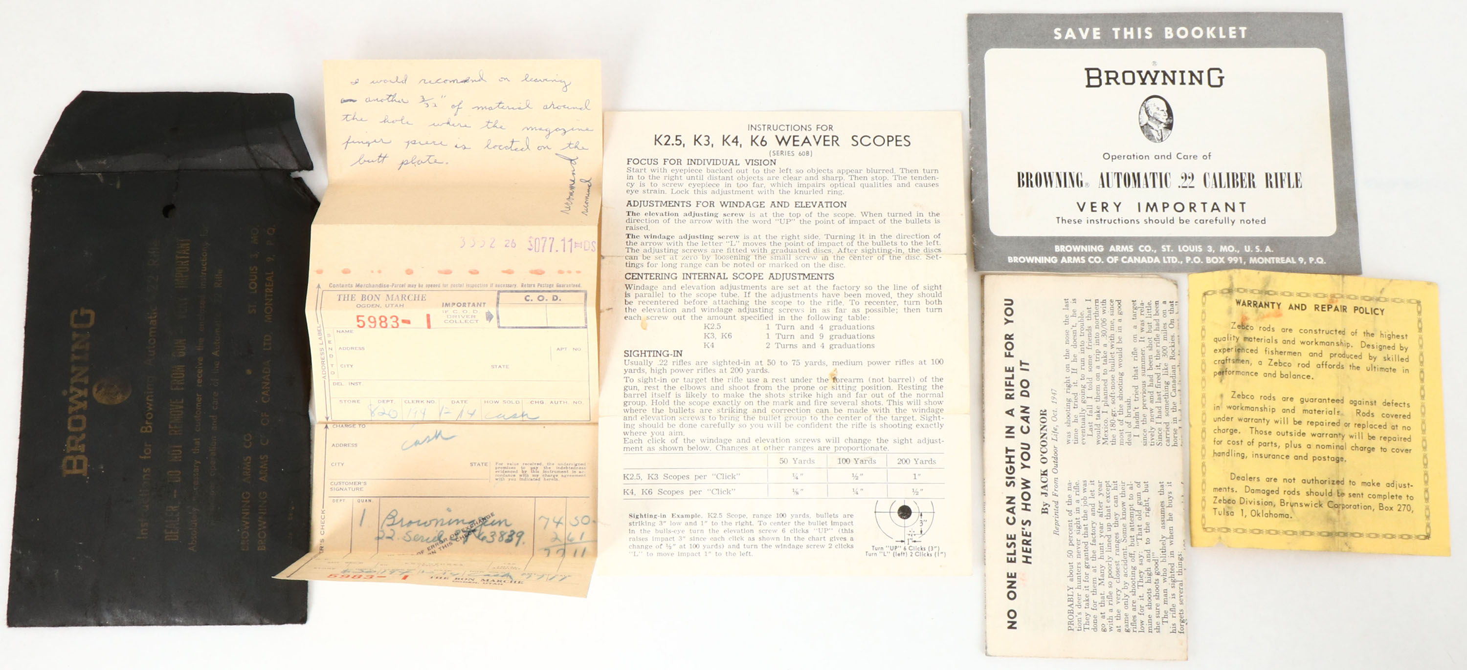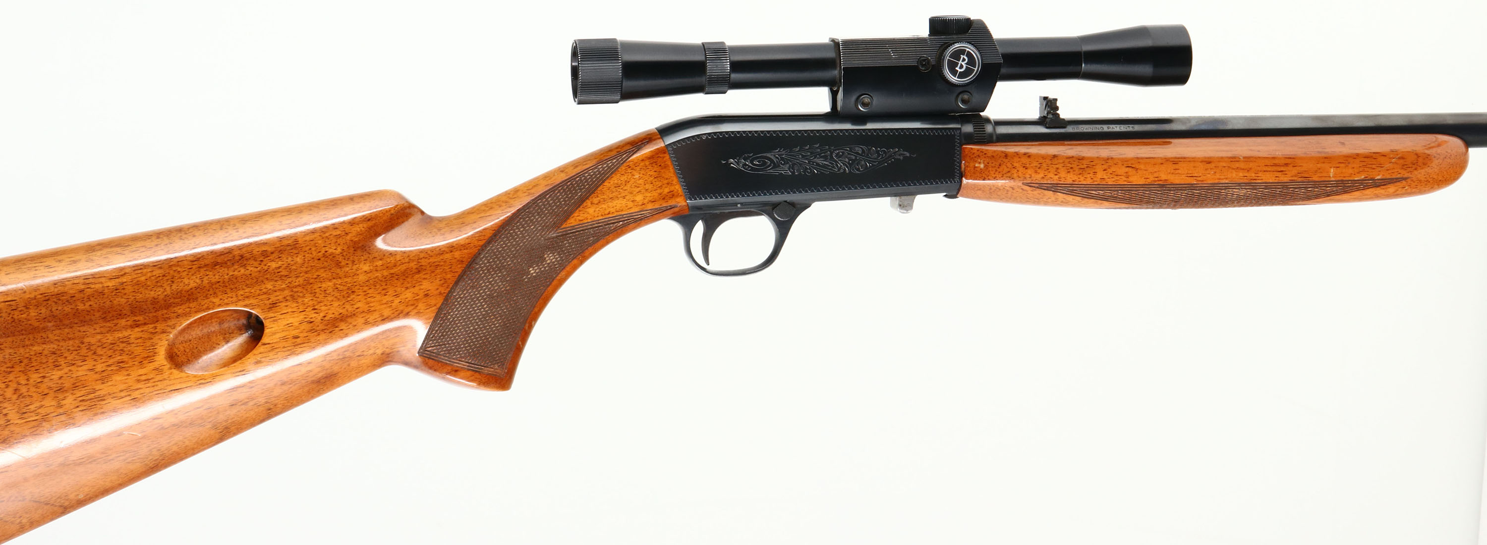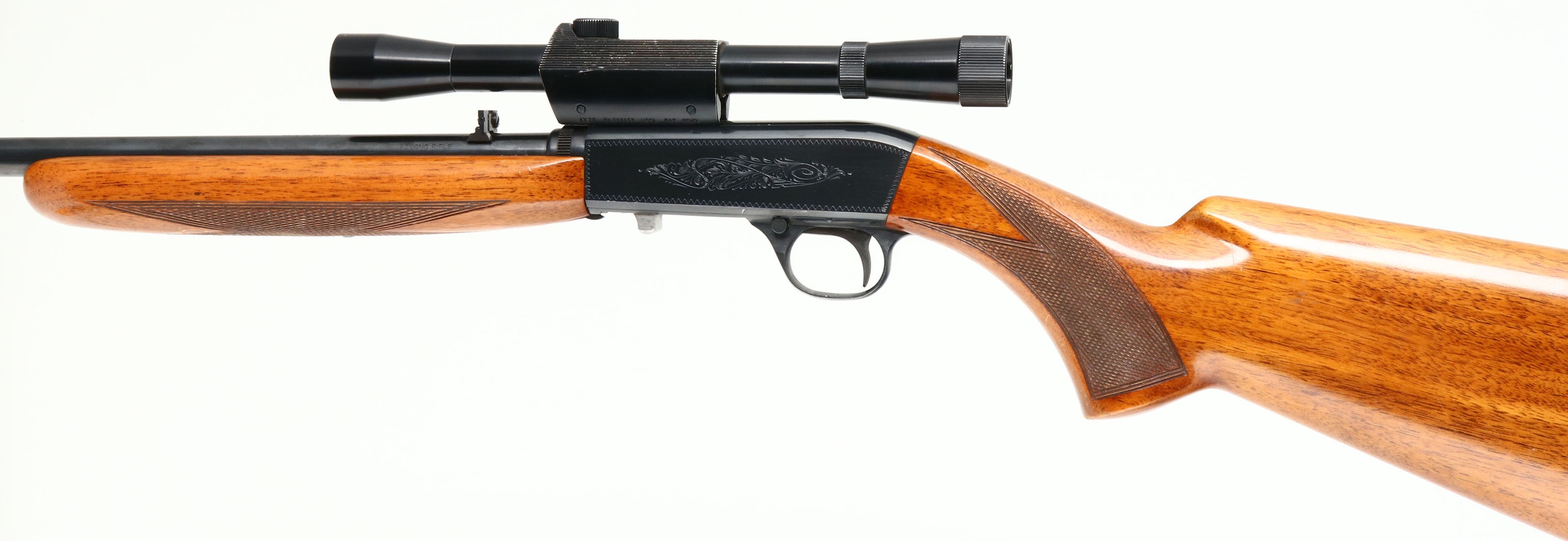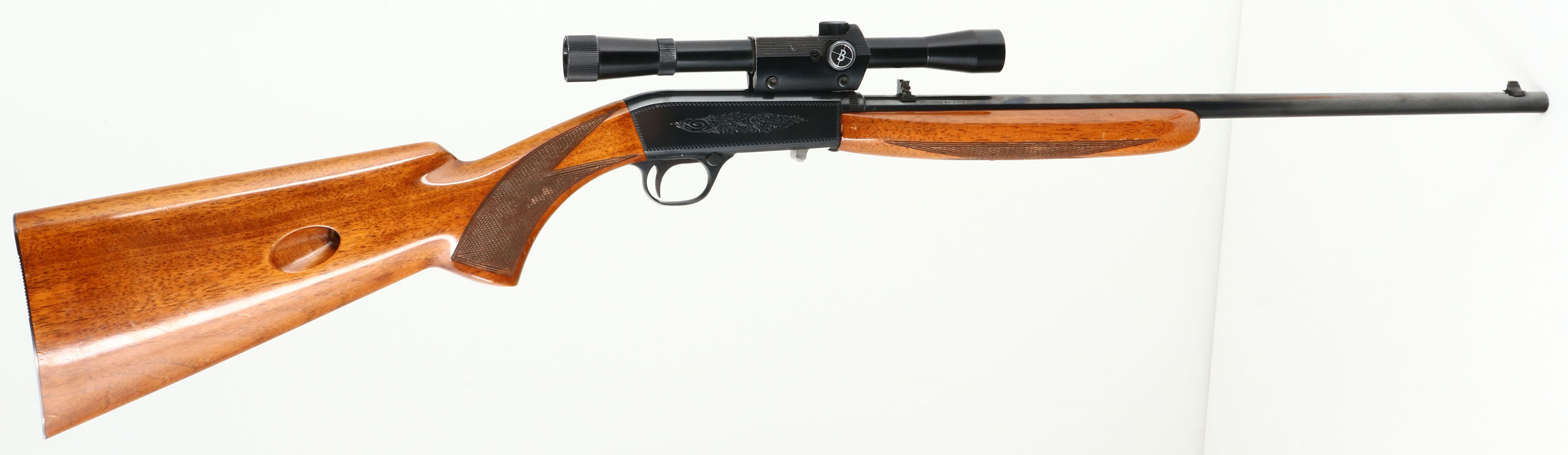 Browning Model SA-22, Grade 1, CAL: .22 LR, MFG: 1963 (Belgium), SN: 3T63839, Semi Auto Rifle, 19'' round barrel. The original checkered & flat pistol grip walnut stocks are excellent, with very few scuffs or dings to the original high gloss finish. The original metal blue finish rates 98% overall. Bore is excellent. The grooved receiver is fitted with a Bushnell Scopechief 4x32 scope, while the barrel carries a flip rear sight & blade front sight. The receiver & trigger guard carry hand engraved floral/swirl pattern, with a border. Metal buttplate. Comes with the original black Browning envelope packet, with owners manual & other paperwork inside. FFL or C&R Req - Value: 600 to 1000