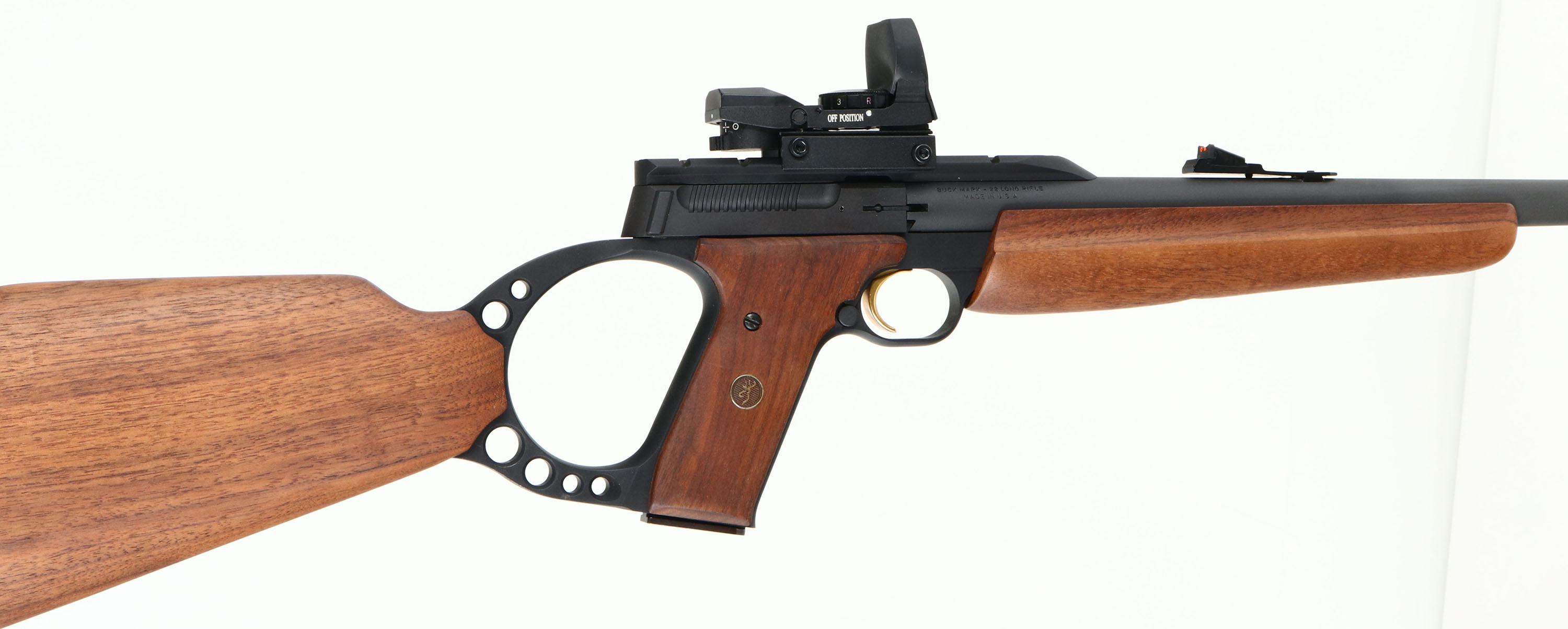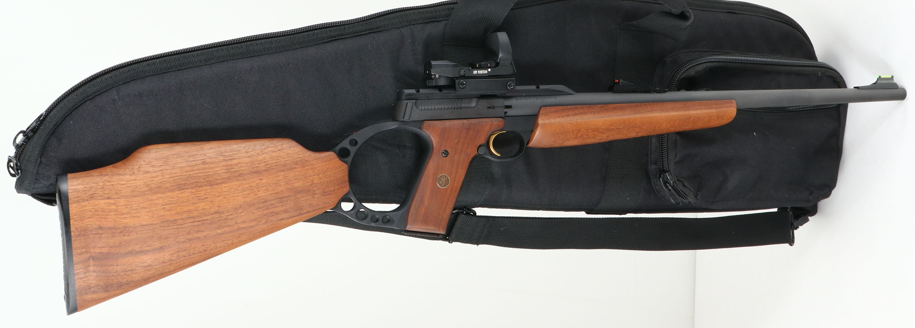 Browning, Model Buckmark, CAL: 22 LR, MFG: Modern, SN: 213ZM01577, Semi Auto Rifle, 18'' barrel. The 3 piece stock, pistol grip & foregrip wood stocks are excellent. The factory metal finish rates 99%+. Bore is excellent. Receiver carries a MSC INTL holographic red-dot, while the fiber optic rear & front sights. Original buttplate. Detachable mag. Sling stud & loop, with sling. 4 extra mags. Comes in soft carry case with Hoppe's Cleaning kit, nylon sling & multi-tool. Better than new considering extras. FFL Req. - Value: 600 to 1200