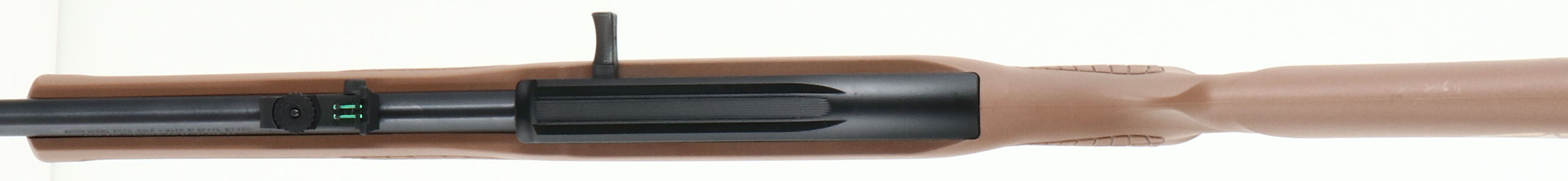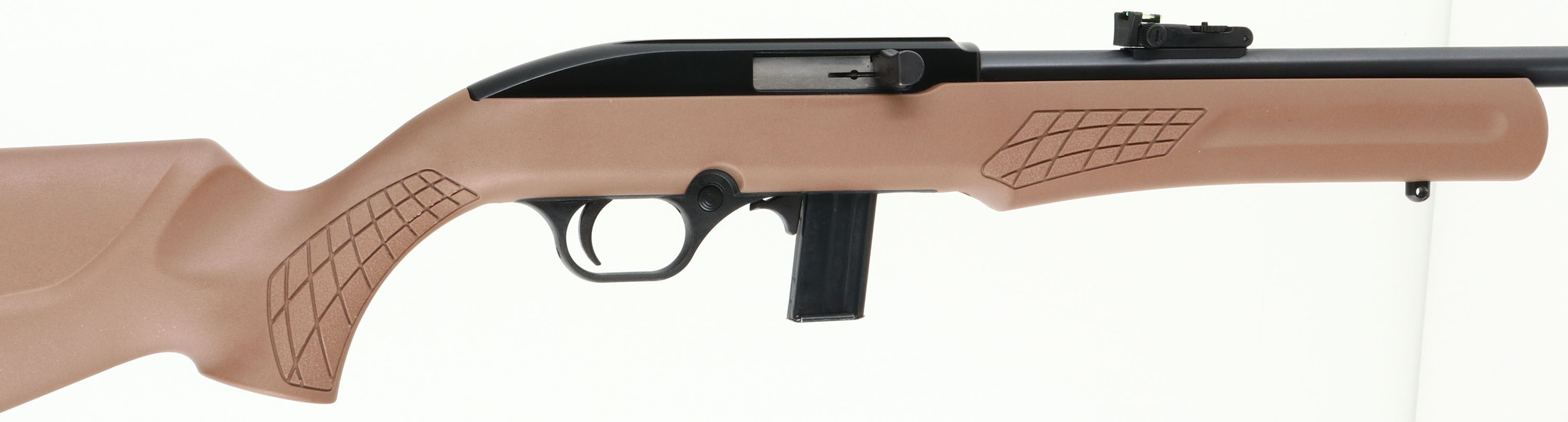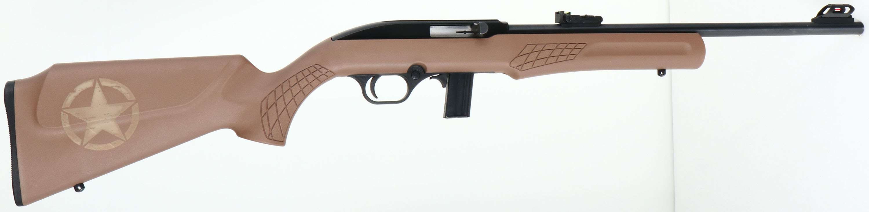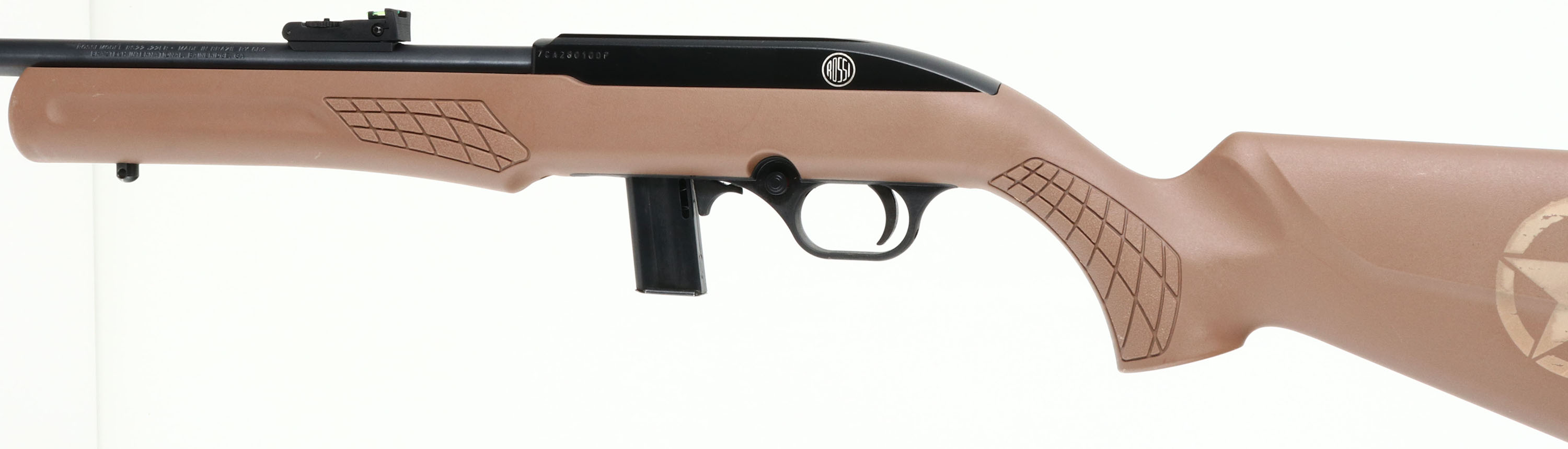 Rossi, Model RS22, CAL: 22 LR, MFG: Modern, SN: 7CA280100P, Semi Auto Rifle, 18'' barrel. The pistol grip, tan synthetic stock, with textured grips, raised cheek & grooved forend is excellent. Circled stars on both sides of stock. The metal blue finish on the barrel rates 98% & the matte black finish on the receiver rates 99%. Bore is excellent. The barrel holds a turn dial adjustable two-rail green fiber optic rear sight & a hooded red rail fiber optic front sight. Stock carries a grooved plastic buttplate. Sling studs. FFL Req. - Value: 100 to 200