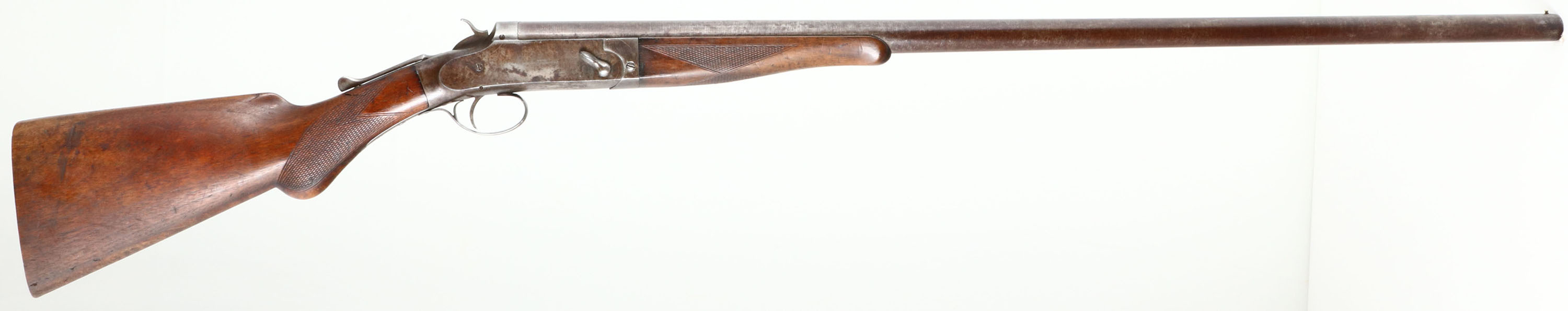 W.H Davenport, ''Goose Gun'', CAL: 10 Bore, MFG: 1896-1909, SN: 5073, Break Action Single Shot Shotgun, 36'' barrel. The checkered round knob grip wood stock & forend are excellent & solid, with protective oils added over time. There's a small crack on the right side of the wrist. The twisted steel barrel carries the original browned finish, with spots worn to metal grey. The receiver is case-hardened, with visible, but faint case colors. It is mostly worn to metal grey & toned to a brown patina, with intermittent rust spotting. Bore is excellent. The barrel holds a single front bead. No buttplate or recoil pad. FFL or C&R Req. - Value: 700 to 1200