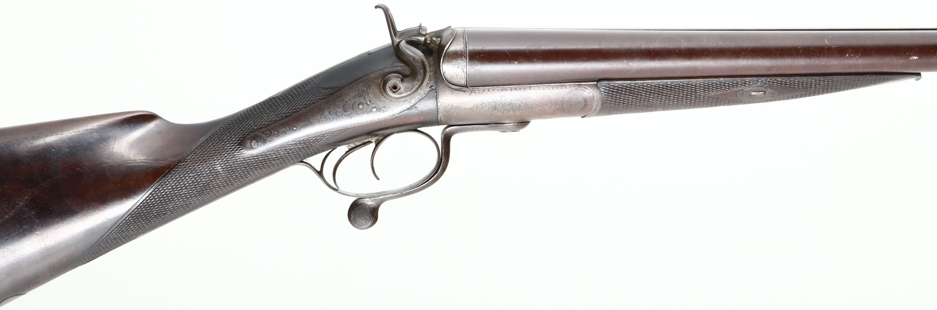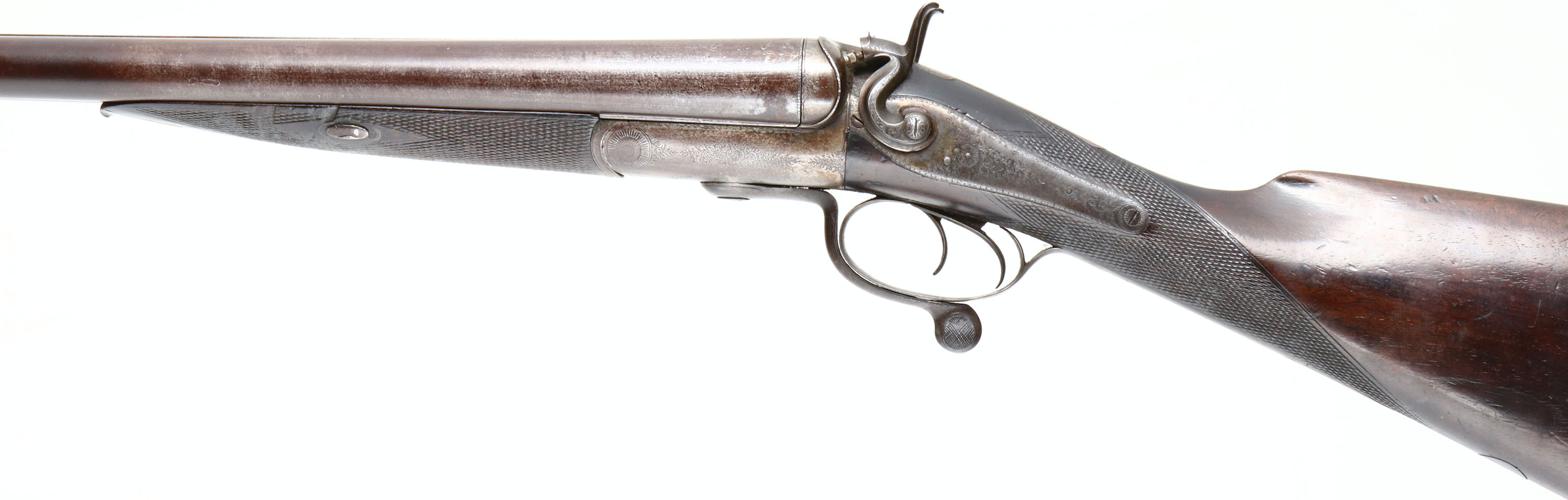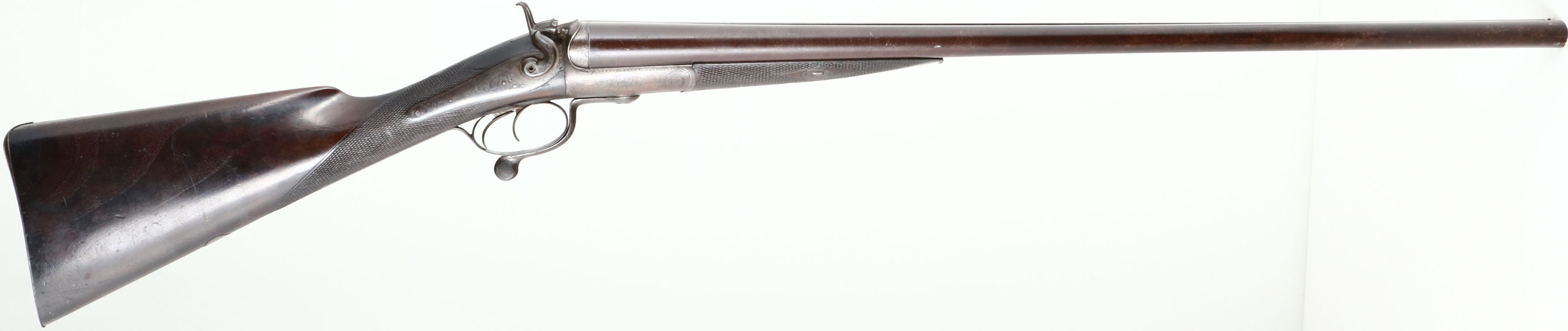 W.C Scott & Son, Hammer Double, CAL: 8 Bore, MFG: 1872, SN: 16935, Rotary Underlever Break Action SxS Shotgun, 32 1/4'' barrels. The rib is stamped ''W&C SCOTT & SON LONDON'' & both side lock plates are marked ''W&C SCOTT & SON''. The original, checkered straight grip wood stock & forend are excellent. There are contusions, scrapes & dings. The belly of the stock has a blank silver circle initial plate. At one point the stock may have been lightly sanded, the buttplate & initial plate are slightly proud to the wood, but the rest of the wood to metal contact points are flush. The barrels have toned to a brown patina, with small areas worn to metal grey. The receiver & side plates are case-hardened, retaining very faint case-colors only in heavily protected areas. They have mostly worn to metal grey & toned to brown patina. The receiver, barrel ends, hammers, side plates, break lever, trigger guard & screws all display detailed ornamental scroll engraving. Bores are good, consistently rough & a little dark. The solid rib holds a single front bead. Stock carries a widow's peak smooth metal buttplate. For an 1870's shotgun, this example is still in great condition, it would be a nice addition to a double barrel collection. Antique, No FFL Req. - Value: 1500 to 3000