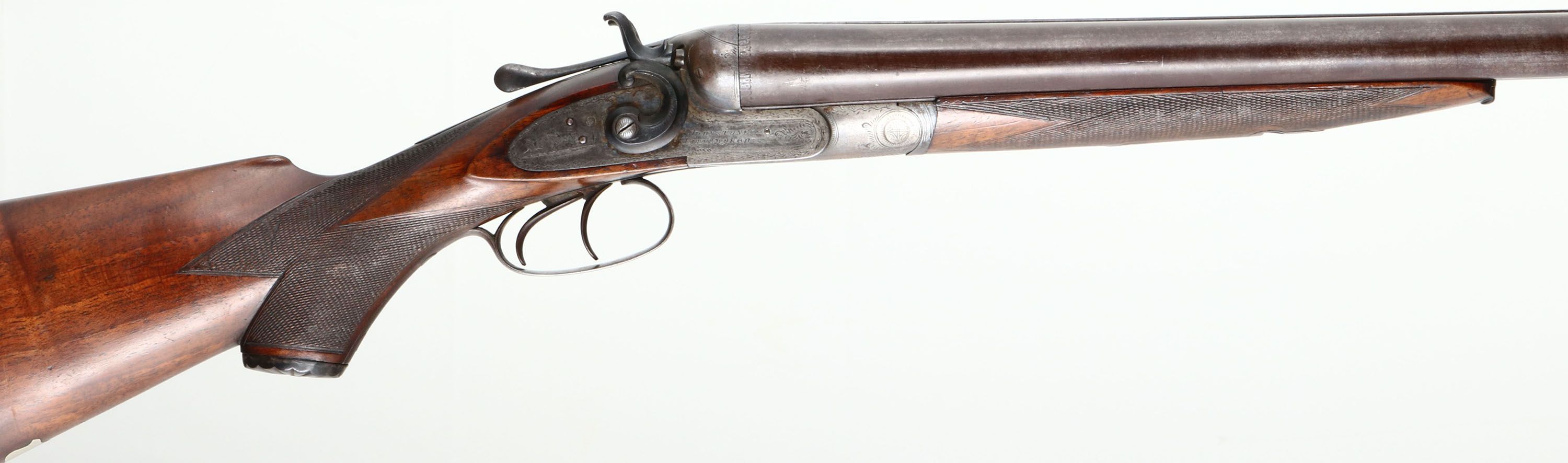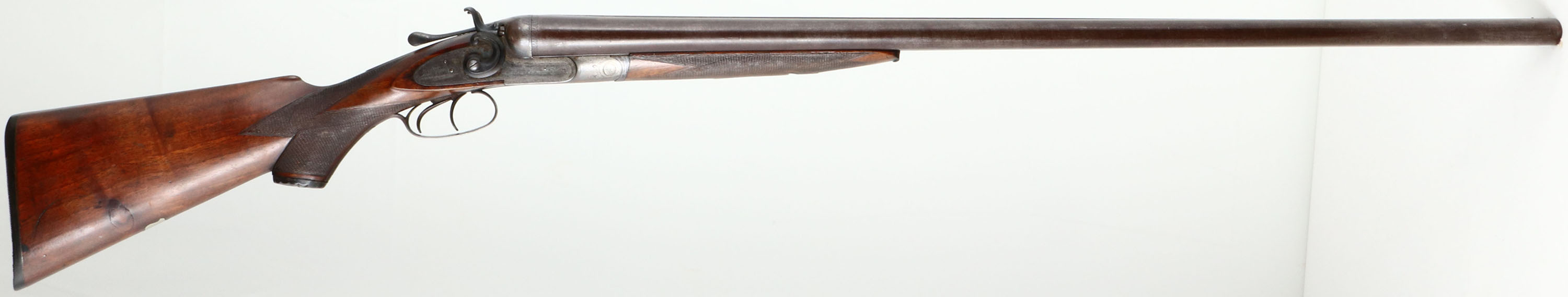Johnstone, Hammer Double, CAL: 8 Bore, MFG: late 19th century, SN: 175, Break Action SxS Shotgun, 35 5/8'' barrels. The original, checkered & capped pistol grip stock & forend are excellent. There are contusions, minor scrapes & dings. The grip cap & forend inlay appear to be horn & there is a blank silver shield initial plate on the belly of the stock. The thumbprint damascus pattern on the barrels is visible, but faded, revealing a wire twist. The browned finish on the barrels has worn to a mix of original finish & metal grey. The receiver & hammers are case-hardened, retaining faint case-colors in heavily protected areas. The receiver, barrel ends, hammers, break lever, trigger guard, forend metal components & screws all display simple ornamental engraving. There are small bird game scenes on both side plates & a bird vignette on the bottom of the receiver. Bores are good, with intermittent pitting towards the muzzle. The solid rib holds a single front bead. Stock carries a grooved buttplate. Double triggers. Another nice large bore shotgun. Antique, No FFL Req. - Value: 1400 to 2800