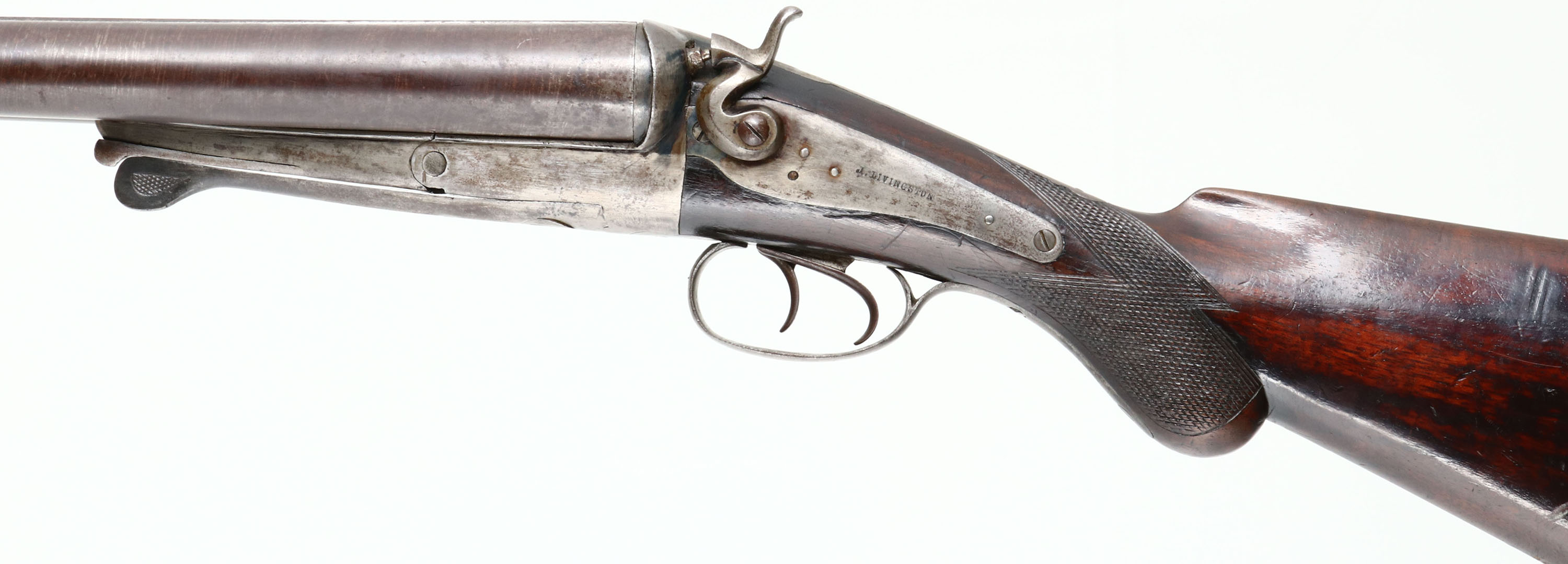J. Livingston, Under Lever Double Hammer, CAL: 8 Bore, MFG: 1880's, SN: 204, Lever Break Action SxS Shotgun, 34 3/16'' barrels. The original, checkered round knob wood stock is very good & solid. The lower portion of the stock was at one time lightly sanded & refinished, with added protective oils & finish contributing to darkening. The buttplate & silver oval nameplate on the belly are slightly proud to the wood, but the wood/metal are flush around the receiver & trigger guard. The laminated steel barrels have a browned finish & the ring laminated pattern is clearly visible. The side plates are case-hardened, with faint tones remaining in heavily protected areas. The lever/receiver has been buffed to gun metal grey, with spotting & speckling toned to a brown patina. Bores are excellent, with intermittent roughness & visible striations from honest use. The solid rib holds a single front bead. Stock carries a widow's peak smooth metal buttplate. A Belgian made shotgun from the 1880's. Antique, No FFL Req. - Value: 1000 to 3000