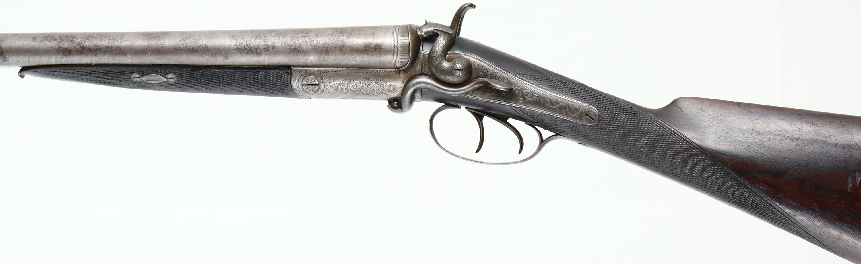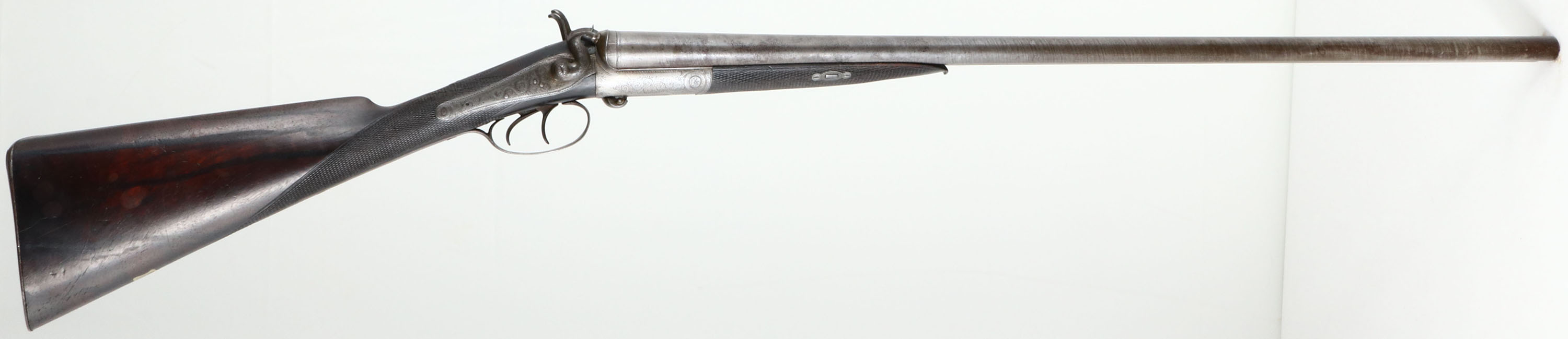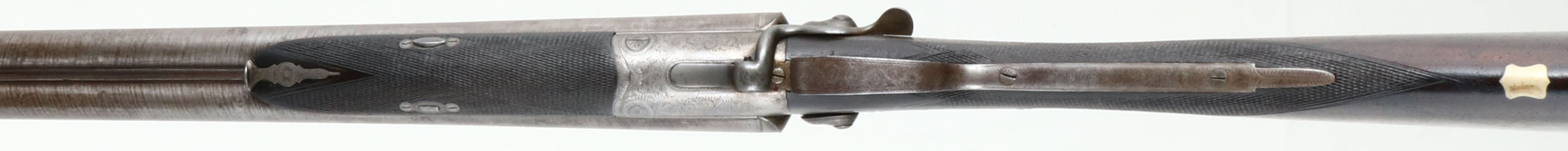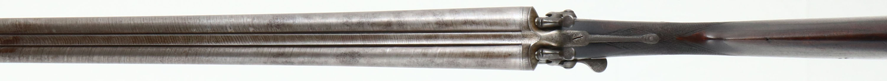 J.P Clabrough & Bros, English Hammer Double, CAL: 20GA, MFG: 1871-1893, SN: 902, Side Lever Break Action Shotgun, 30'' barrels. The original checkered straight grip wood stocks are excellent & solid, having been lightly sanded, with oils added over time. The stocks have contusions, scrapes & dings. There is a blank silver shield name plate inlaid in the belly. The ''Stub Twist'' steel barrels have fully worn to gun metal grey, with areas toned to a brown patina & remnants of the original brown finish towards the muzzle. The receiver has worn to metal grey, with an aged patina. The receiver, hammers, trigger guard & forend metal components & screws are all engraved with a simple ornamental scroll pattern. Bores are excellent & bright. This rifle appears to have started it's life as a 12GA, but since has been re-lined to 20GA, with screw-in Briley Choke Tubes. The solid rib holds a single front bead. Stock carries a smooth metal buttplate. Comes with an additional set of choke tubes, tool, Briley Oil & Warranty booklet. LOP: 13 7/8'', DAH: 3 5/8'', DAC: 2 1/4''. Antique, No FFL Req. - Value: 400 to 800