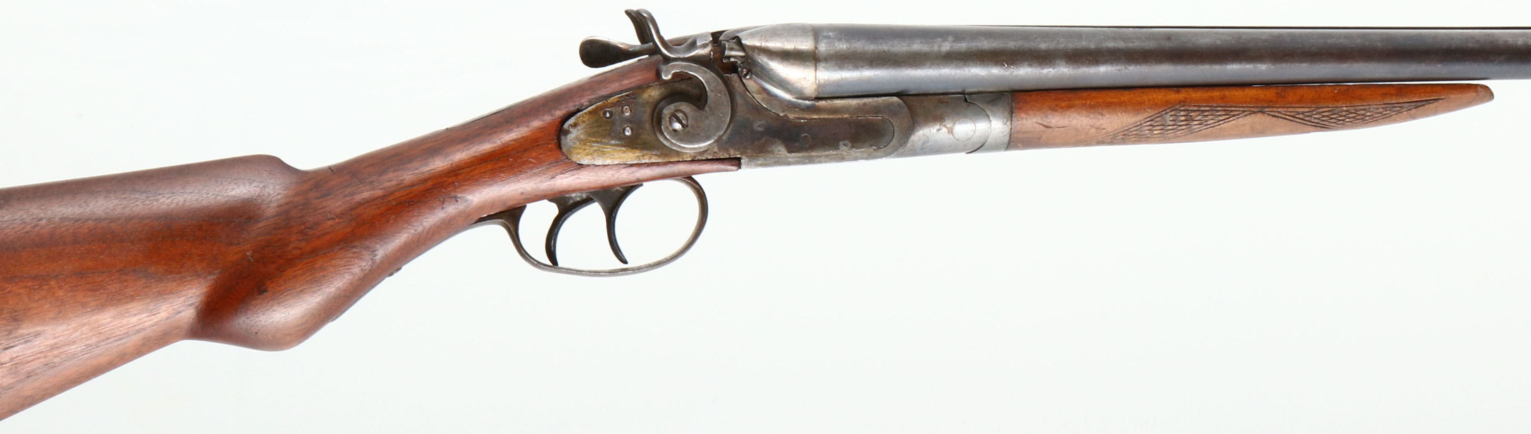 American Gun Co., Hammer Double, CAL: 20GA, MFG: early 1900's, SN: 350671, Break Action SxS Shotgun, 26 3/4'' barrel. The round knob wood stock & checkered forend are very good & solid. The stock is a replacement. There are handling marks, scrapes, dings & the checkering is worn smooth on the forend. The metal blue finish on the barrels is a mix of remaining blue, brown patina & gun metal grey. The receiver is case-hardened, with remnants of case-colors in protected areas. Bores are very good, with normal wear from use. The barrel holds a single front bead. Stock carries a worn checkered buttplate. Right firing pin housing is broken & the top of the left one is cracked. Barrel & receiver connection has a little bit of play. LOP: 14'', DAH: 2 3/8'', DAC: 1 3/8''. FFL or C&R Req. - Value: 150 to 300