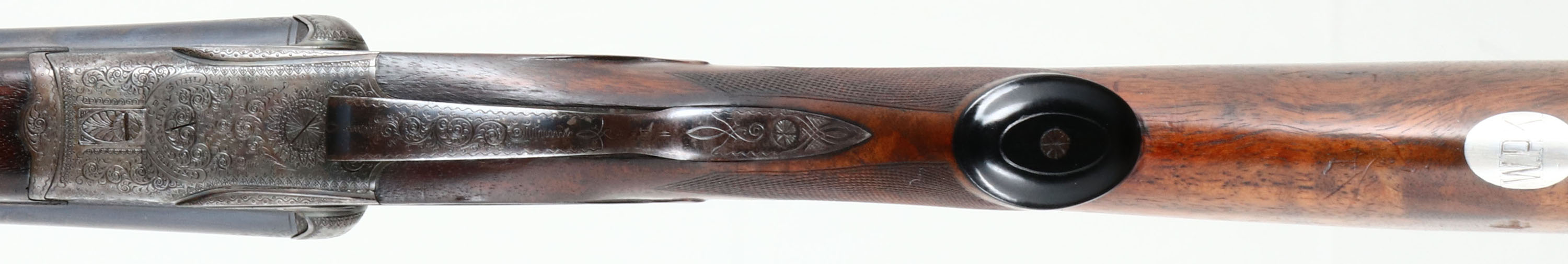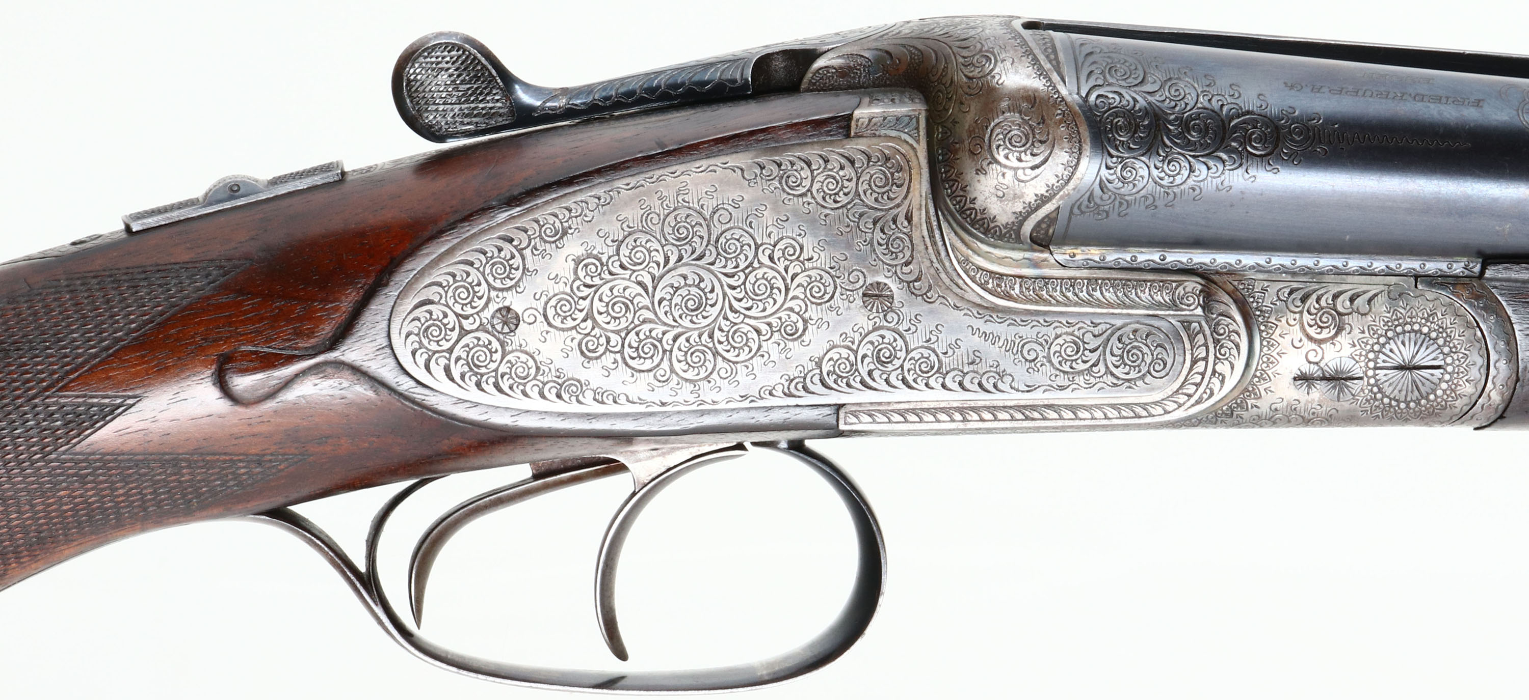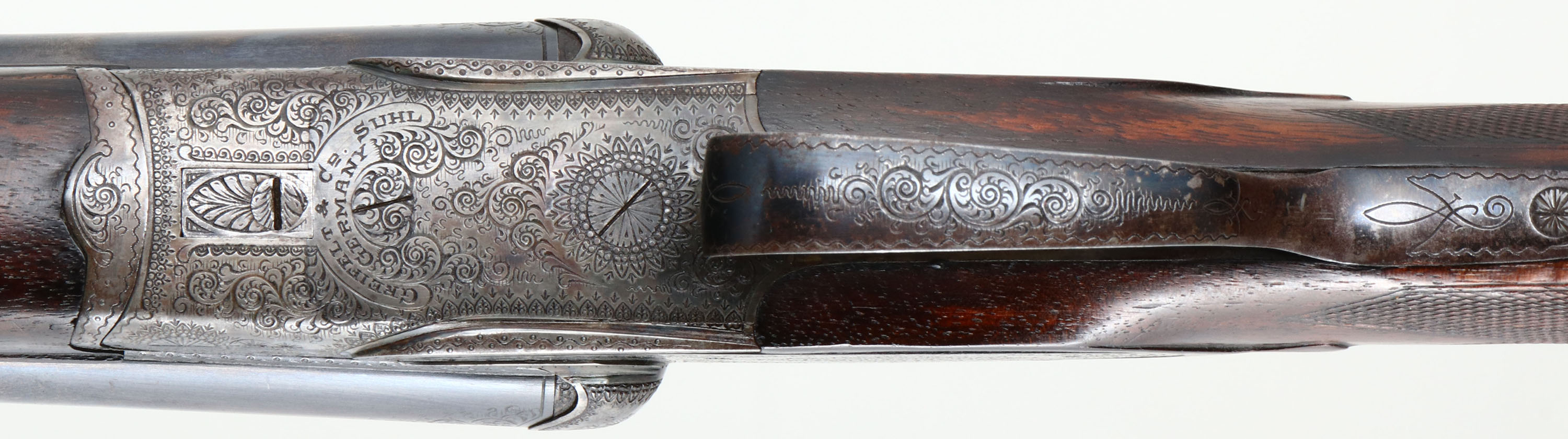 Greifelt & Co. Suhl, Sidelock Shotgun, CAL: 12GA, MFG: N/A, SN: 46814, Break Action SxS Shotgun, 30'' barrels. The original highly figured, checkered & capped pistol grip stock is excellent & solid. There are minor contusions, scrapes & dings to the finish. The stocks have had protective oils added over time, contributing to some darker areas. There is a small 2'' crack fill on the left side of the forearm. The silver oval initial plate is marked ''W.P.K''. The metal blue finish on the barrels rates 95% & is a mix of original blue & applied blue. There is handling wear & a couple small areas of pitting that have been touched up. The receiver is case-hardened, retaining faint, but visible case-colors. The entirety of the receiver, along with barrel ends, break lever, trigger guard, forend release lever & screws are all beautifully hand engraved with ornamental scroll work. Bores are excellent & bright. The solid rib holds a single front bead. Stock carries a ventilated brown rubber recoil pad. Double triggers. Greifelt & Co used to be a major German gunmaker. Founded in 1885 in Suhl, the company went under in 1945 at the end of WWII. They were well known for producing high class shotguns & rifles.* FFL or C&R Req. - Value: 3000 to 6000