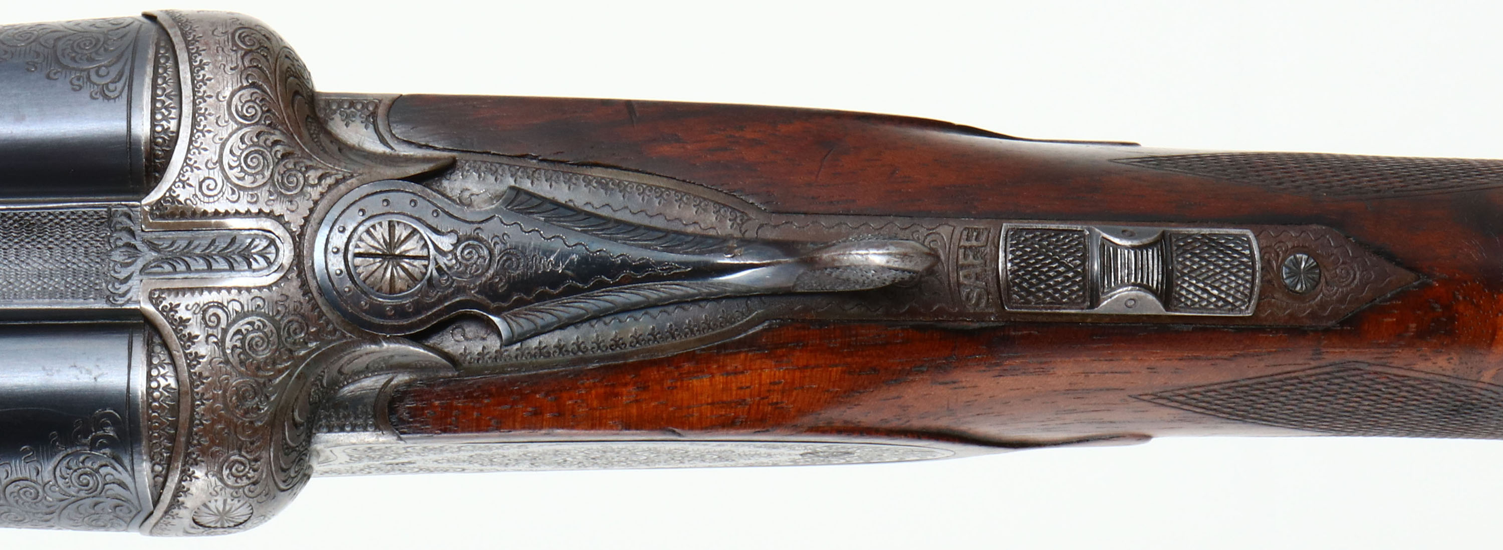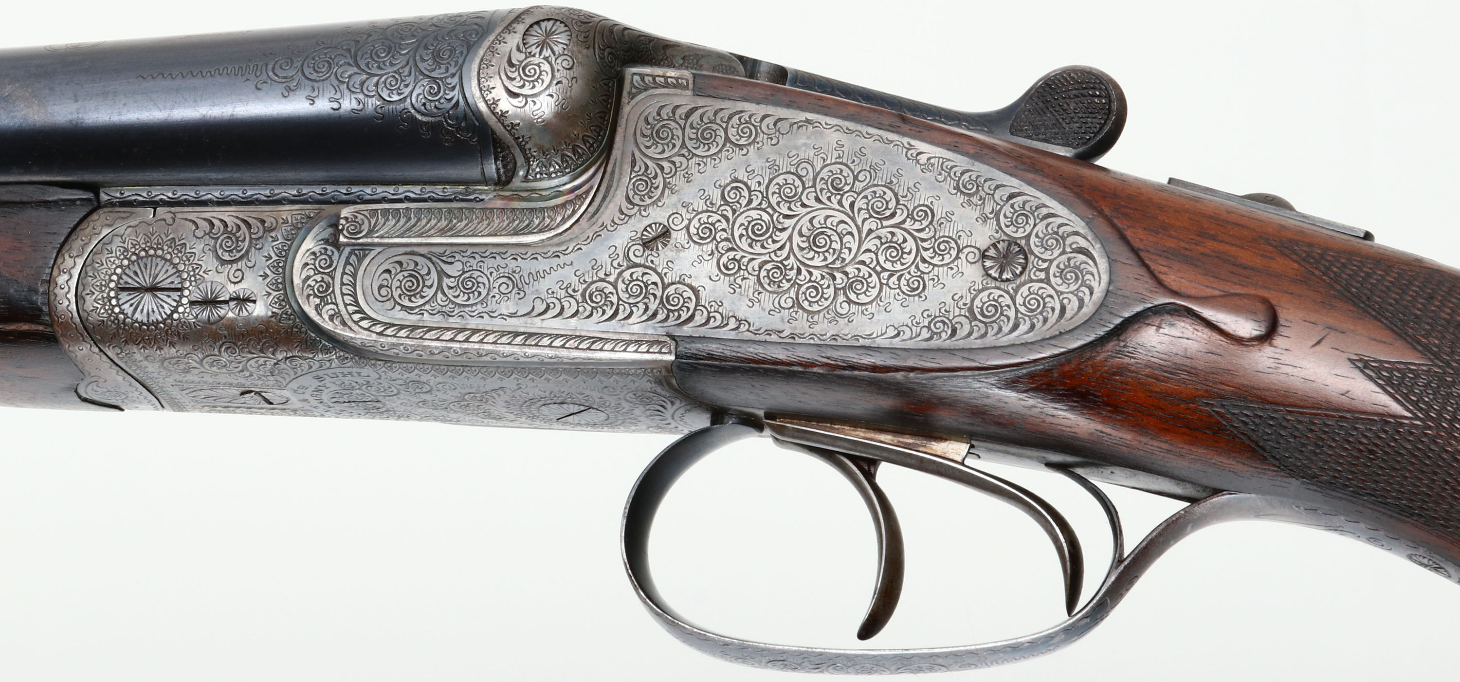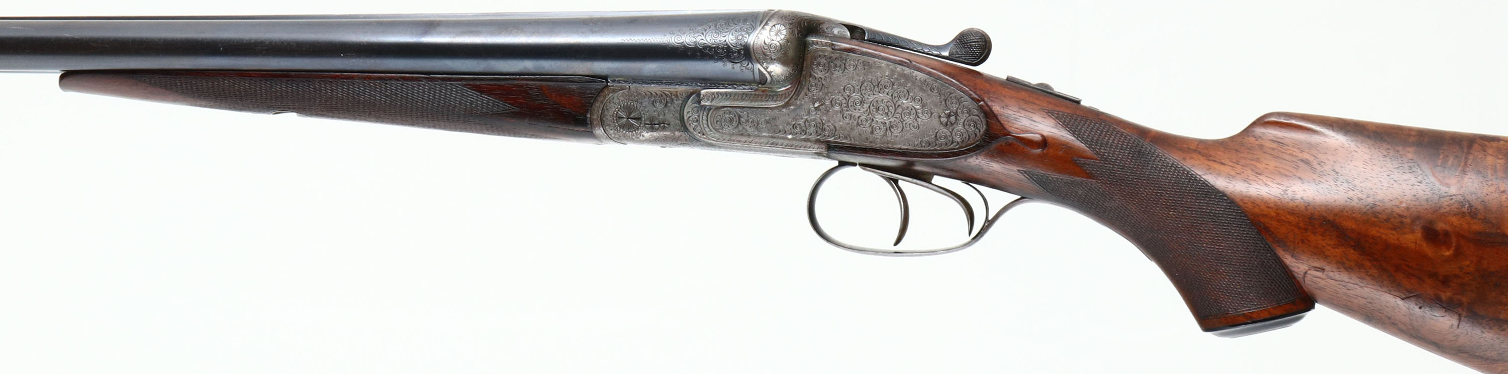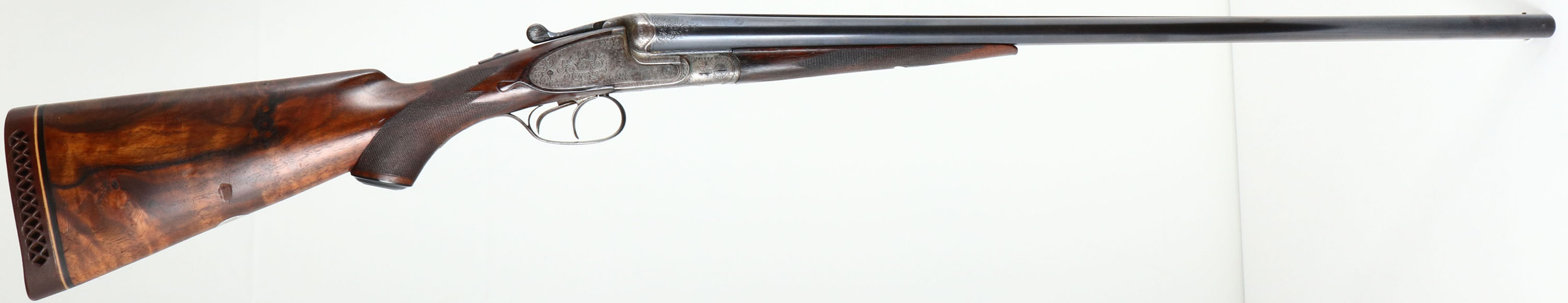 Greifelt & Co. Suhl, Sidelock Shotgun, CAL: 12GA, MFG: N/A, SN: 46814, Break Action SxS Shotgun, 30'' barrels. The original highly figured, checkered & capped pistol grip stock is excellent & solid. There are minor contusions, scrapes & dings to the finish. The stocks have had protective oils added over time, contributing to some darker areas. There is a small 2'' crack fill on the left side of the forearm. The silver oval initial plate is marked ''W.P.K''. The metal blue finish on the barrels rates 95% & is a mix of original blue & applied blue. There is handling wear & a couple small areas of pitting that have been touched up. The receiver is case-hardened, retaining faint, but visible case-colors. The entirety of the receiver, along with barrel ends, break lever, trigger guard, forend release lever & screws are all beautifully hand engraved with ornamental scroll work. Bores are excellent & bright. The solid rib holds a single front bead. Stock carries a ventilated brown rubber recoil pad. Double triggers. Greifelt & Co used to be a major German gunmaker. Founded in 1885 in Suhl, the company went under in 1945 at the end of WWII. They were well known for producing high class shotguns & rifles.* FFL or C&R Req. - Value: 3000 to 6000