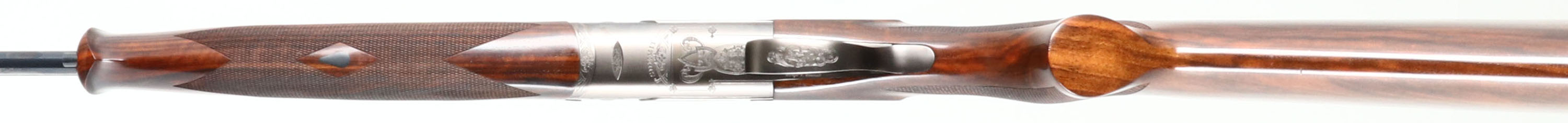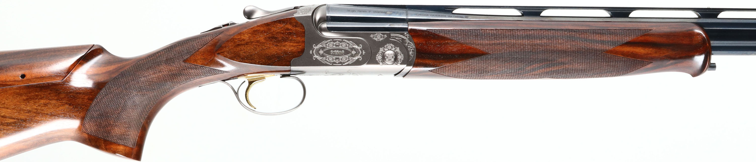CASED, Caesar Guerini, Model ''Summit Sporting'', CAL: 410GA, MFG: Modern, SN: 118199, O/U Break Action Shotgun, Choke: Selectachoke System, 32'' barrels. The high grade checkered stock, with schnabel forend, adjustable comb & hand rubbed oil finish is excellent, displaying minor handling & storage marks. The hand polished silver finish on the receiver is excellent. The receiver, break lever & trigger guard all display ornamental engravings & patterns alongside the wording ''Caesar Guerini'' & ''SUMMIT''. The metal blue finish on the barrels rates 99% overall, with very minor handling & storage marks. Bores are excellent, displaying light wear from use. The ventilated & matted rib holds a small steel mid-rib bead & white ''Bradley'' style front bead. Stock carries a C.G black rubber recoil pad. Gold tone trigger. Comes in factory hard case, with velvet sleeves for stock & barrel, choke set, owners manual, tools & C.G stickers. This set retails for over $5000 & is without a doubt an efficient tool designed to withstand a lifetime of competitive shooting. FFL Req. - Value: 3000 to 5000