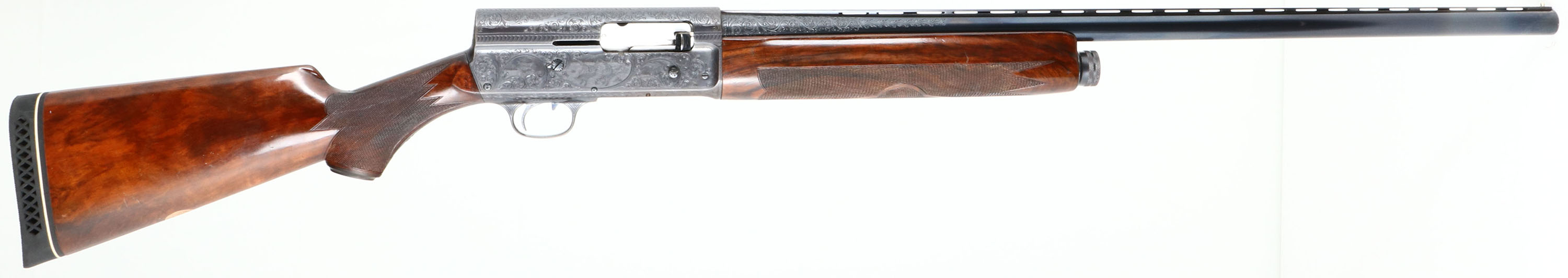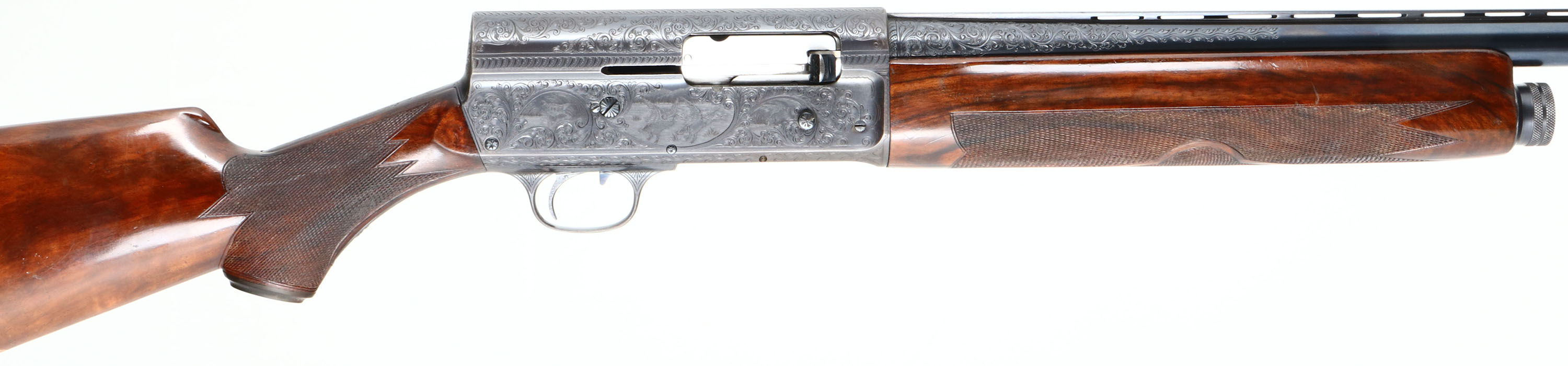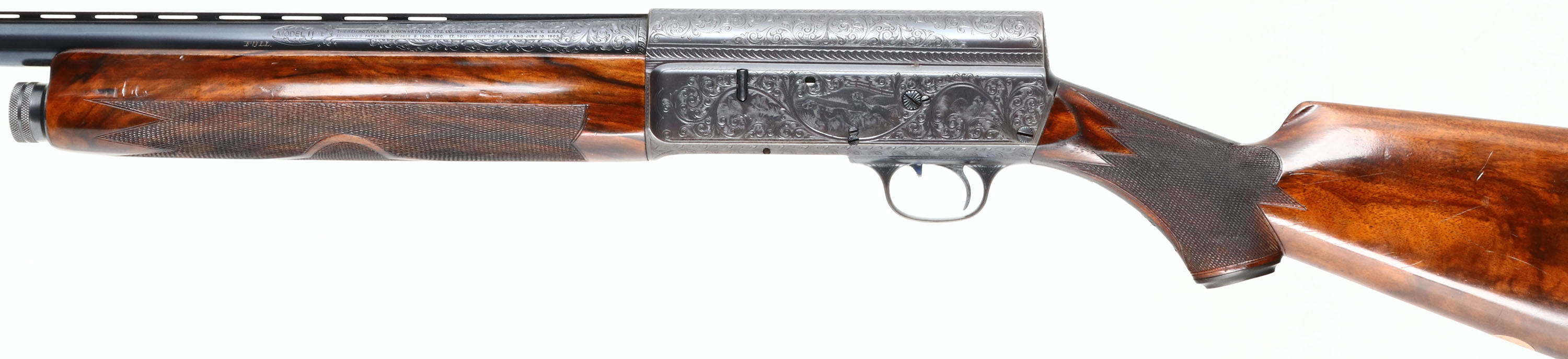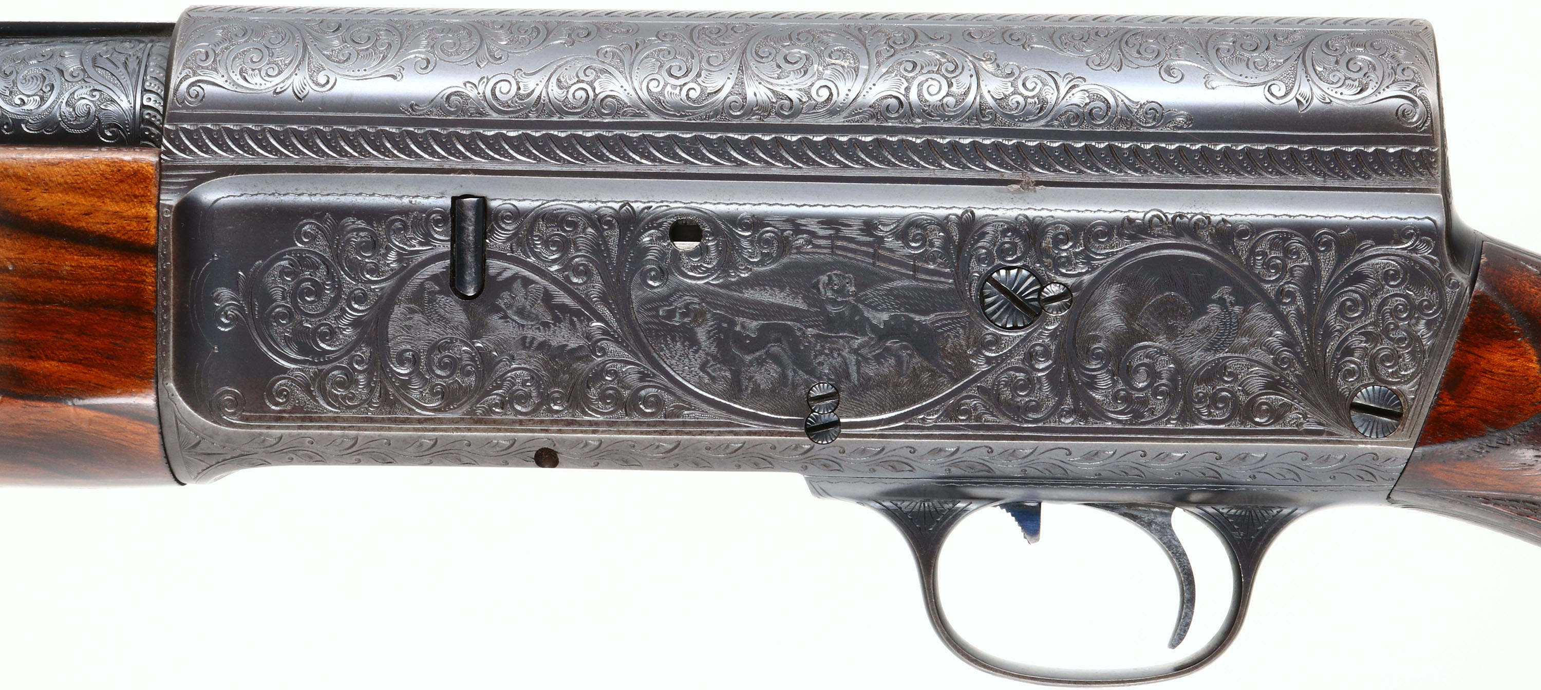 RARE ENGRAVED Remington UMC, Model 11, ''F' PREMIER GRADE or GRADE 6, 12 GA., MFG. 1920, SN: 236639, Semi Auto Shotgun. Marked FULL, 2 3/4'', 28'' Ventilated rib single bead barrel. John Browning presented this design (which he called his best achievement) to Winchester, where he had sold most of his previous designs. When Winchester refused his terms, Browning went to Remington. Tragically, the President of Remington died of a heart attack as Browning waited to offer them the gun. This forced Browning to look overseas to produce the shotgun. It was manufactured by FN (a company that had already produced Browning-designed pistols) starting in 1902 as the Auto 5. Browning would later license the design to Remington, who produced it as their Model 11 (1911-1947). The Remington Model 11 was the first auto-loading shotgun made in America, originally as the ''Remington Autoloading Shotgun (1905-1910)'' before it was changed to the Model 11 in 1911. This is a Special ordered shotgun from Remington's custom shop & master engraved. It displays extensive full coverage engraving, with six separate game scene vignettes featuring pairs of hunting dogs, grouse, snipe & flying mallards. Additional dog's profile engraved on bottom of trigger guard. Remington's Master Engraver at this time was Joseph F. Loy assisted by Simeon S. Rogers. Loy's animal engravings were truly works of art. In those days, Remington did not allow their engravers to sign their work. The engraving details on this example are consistent with Loy's work. The metal blue finish is 97% on barrel, 95% receiver, with loss mainly at the carry point on the belly of the receiver. The fancy, high grade, fine 24 lines per inch hand checkered, capped pistol grip, Circassia walnut stocks are excellent, original & solid, with nice figure. The buttstock has an initial plate that is engraved with ''LS''. The finish is excellent, with a few very minor finish contusions or scrapes. Stock carries a Pachmayr White Line ventilated recoil pad. Bore is excellent, Functionality is excellent & tight. This was the highest grade Model 11 available from the Remington Custom shop in Ilion NY. Fantastic hand craftsmanship.* FFL or C&R Req. - Value: 7000 to 10000