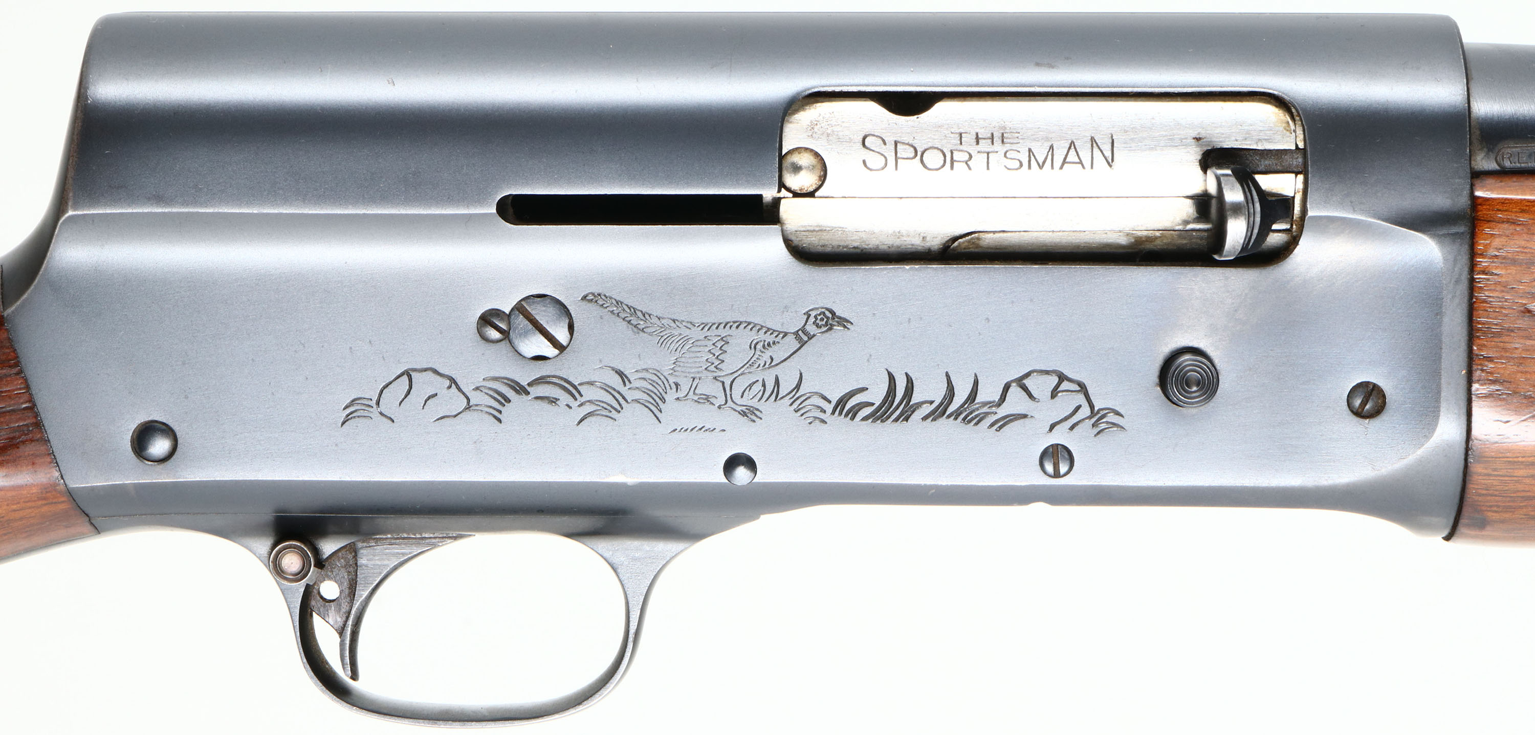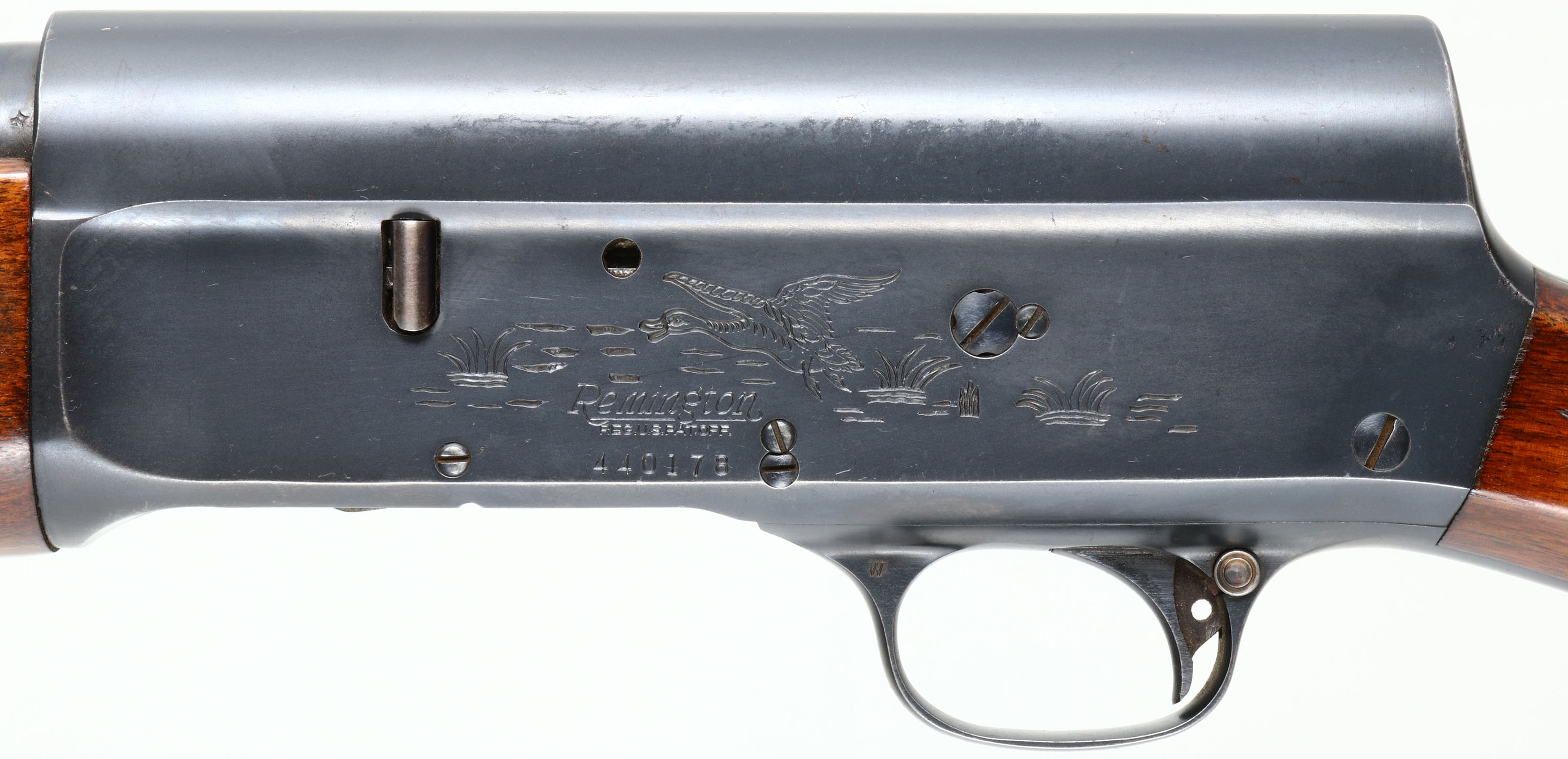 Remington, Model 11 ''The Sportsman'', CAL: 12 GA, MFG: 1941, SN: 440178, Semi-Auto Shotgun, 2+1 shot capacity. 2 3/4, Choke: MOD, 30'' No-rib barrel. The left side of the receiver displays a roll stamp engraving of a flying mallard in a pond setting & the right side displays a pheasant in a grassy area. The orignal checkered & flat pistol grip wood stocks are excellent, displaying some minor finish level scrapes, scuffs & contusions to the original finish. The metal blue finish rates 95% overall. Bore is excellent. The barrel is fitted with a silver bead. Buttstock carries a Remington, black plastic buttplate. Lower tang has an open set-screw hole. LOP: 14''. FFL or C&R Req - Value: 300 to 600