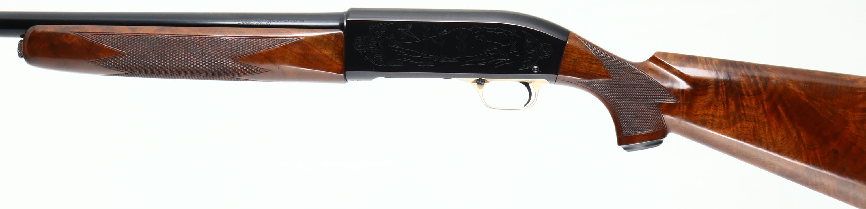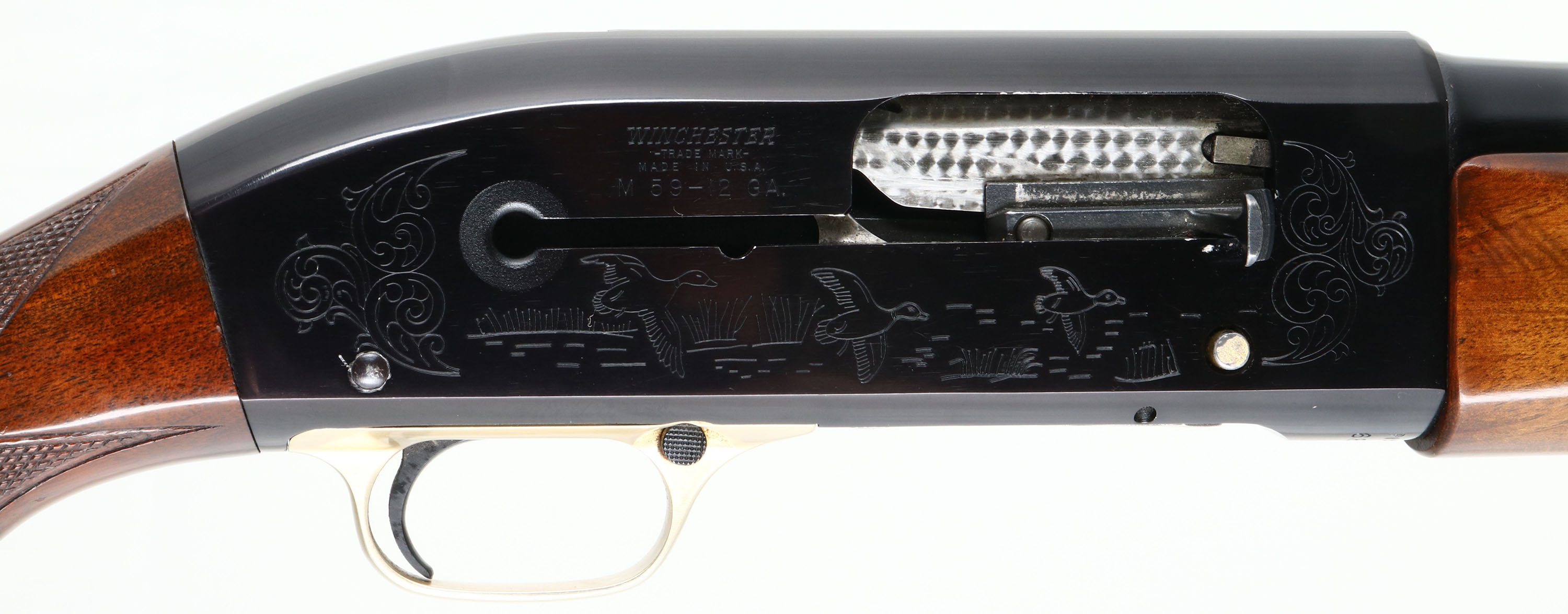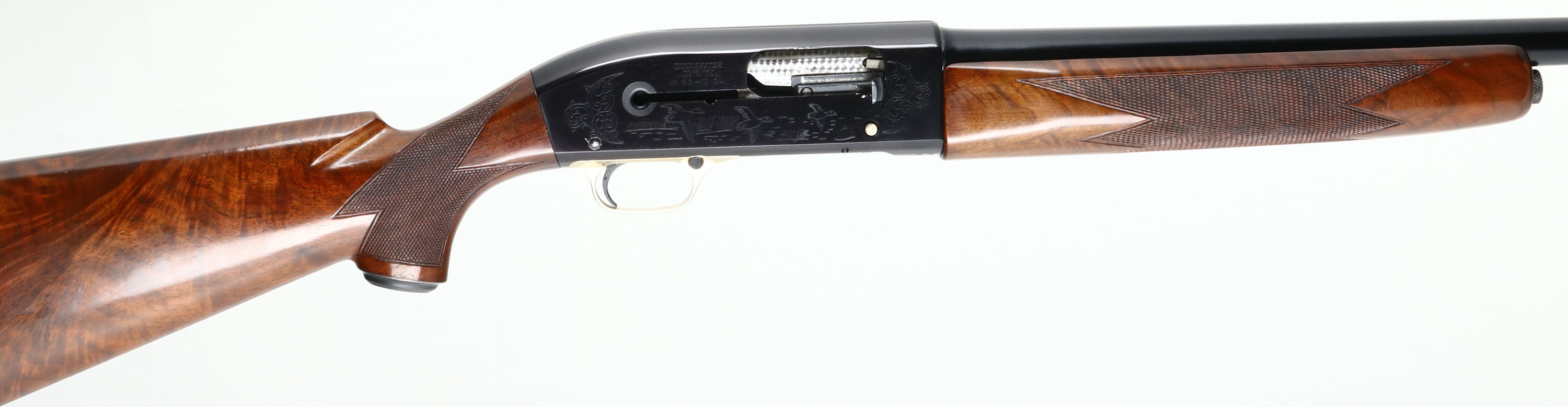 RARE PIGEON GRADE, Winchester Model 59 WIN-LITE, CAL: 12 GA, MFG: 1960-65, SN: 68277, Semi-Auto Shotgun, Choke: Multiple, 26'' Winchester Win-Lite steel/fiberglass barrel. The word ''PIGEON'' is engraved on the underside of the receiver. The alloy receiver is inscribed with hunting scenes, border accent engraving. The deluxe checkered & metal capped pistol grip wood stocks are excellent. The stock displays fantastic feathered & ripped grain, with few minor handling marks to the original finish. The factory metal finishes on the barrel & receiver rate 98% overall, with very little handling wear. Bore is excellent. Barrel is fitted with a single front bead. Buttstock carries a factory Winchester buttplate. Gold tone trigger guard. LOP: 14''. A wonderful & rare Pigeon grade Win-Lite. Very collectible.* FFL or C&R Req. - Value: 2000 to 4000