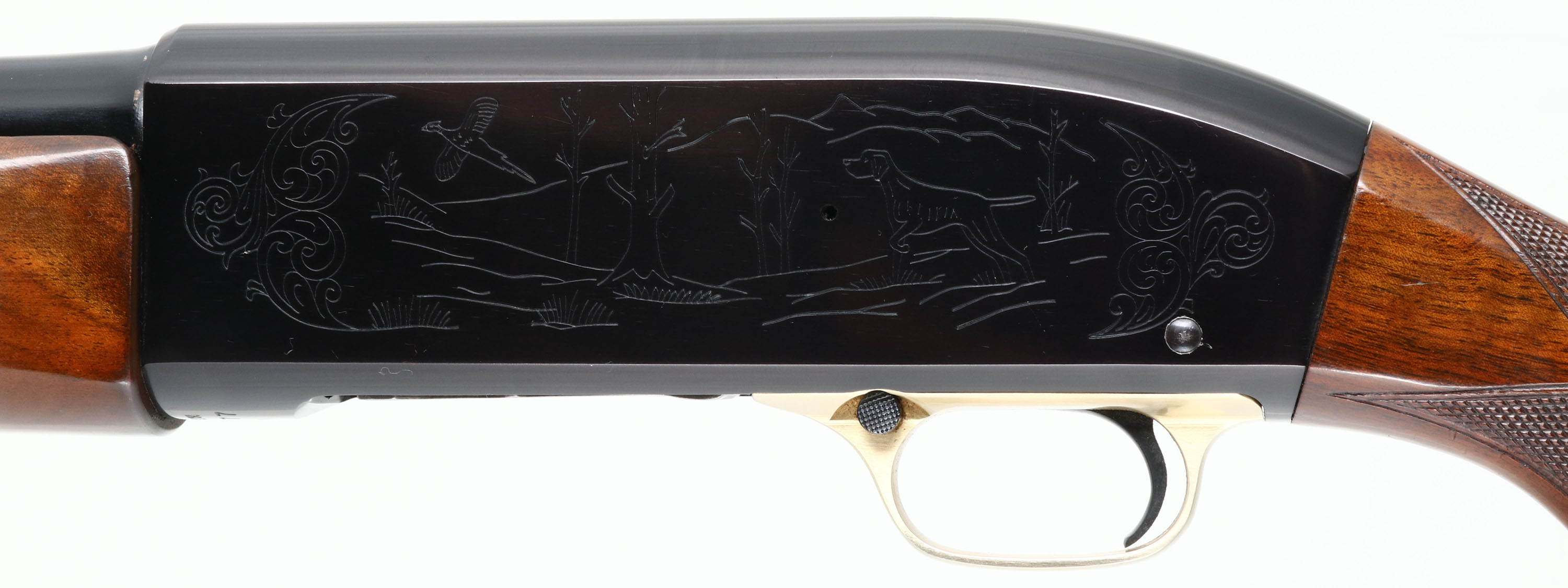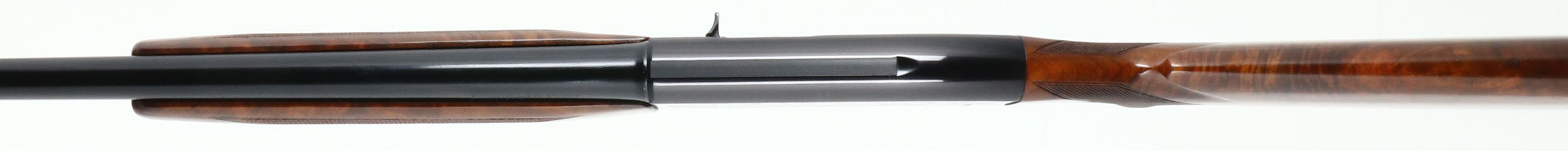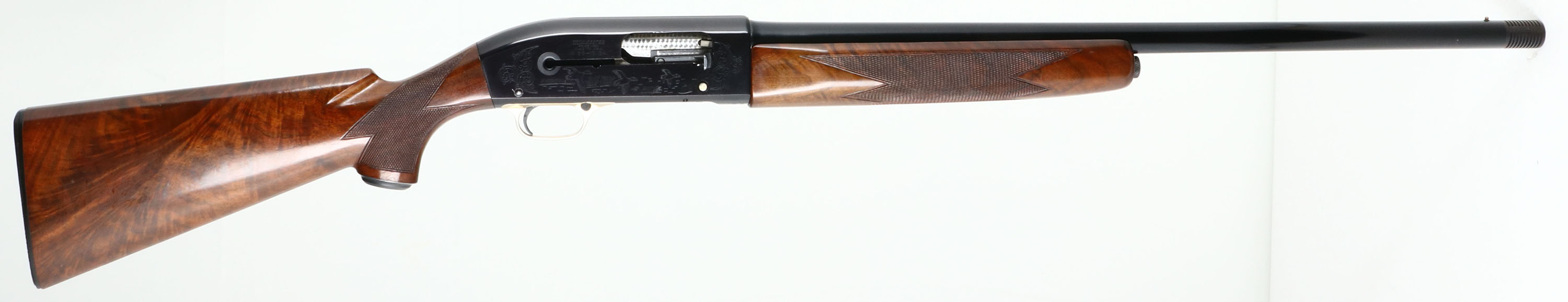 RARE PIGEON GRADE, Winchester Model 59 WIN-LITE, CAL: 12 GA, MFG: 1960-65, SN: 68277, Semi-Auto Shotgun, Choke: Multiple, 26'' Winchester Win-Lite steel/fiberglass barrel. The word ''PIGEON'' is engraved on the underside of the receiver. The alloy receiver is inscribed with hunting scenes, border accent engraving. The deluxe checkered & metal capped pistol grip wood stocks are excellent. The stock displays fantastic feathered & ripped grain, with few minor handling marks to the original finish. The factory metal finishes on the barrel & receiver rate 98% overall, with very little handling wear. Bore is excellent. Barrel is fitted with a single front bead. Buttstock carries a factory Winchester buttplate. Gold tone trigger guard. LOP: 14''. A wonderful & rare Pigeon grade Win-Lite. Very collectible.* FFL or C&R Req. - Value: 2000 to 4000