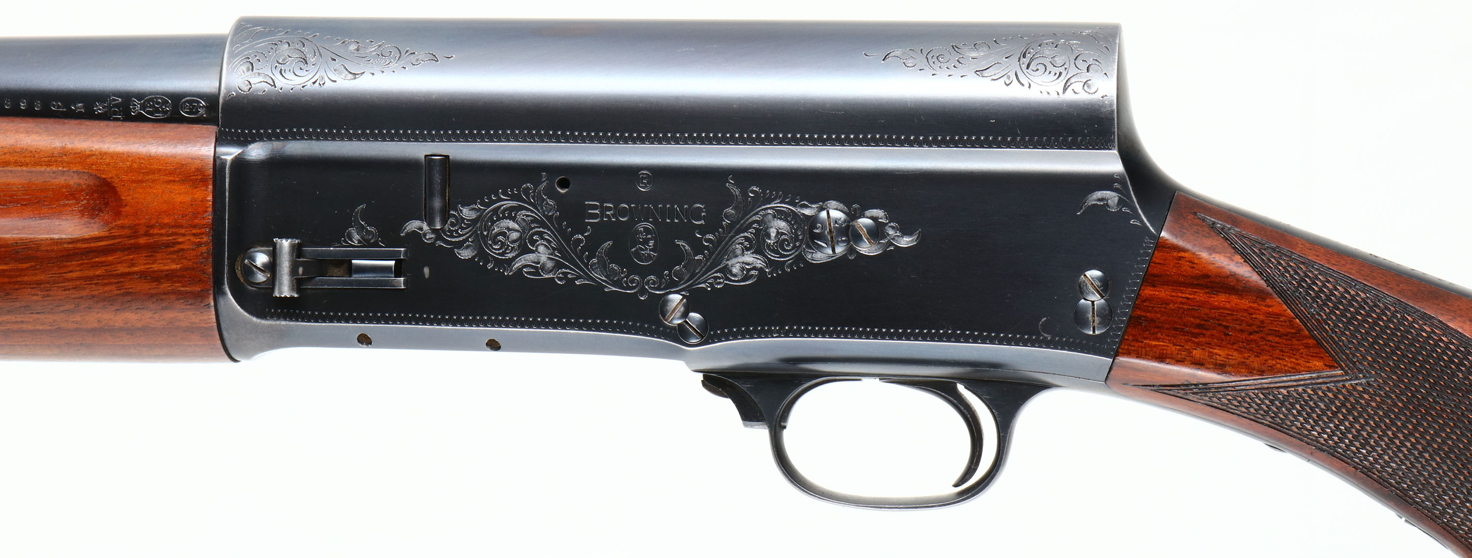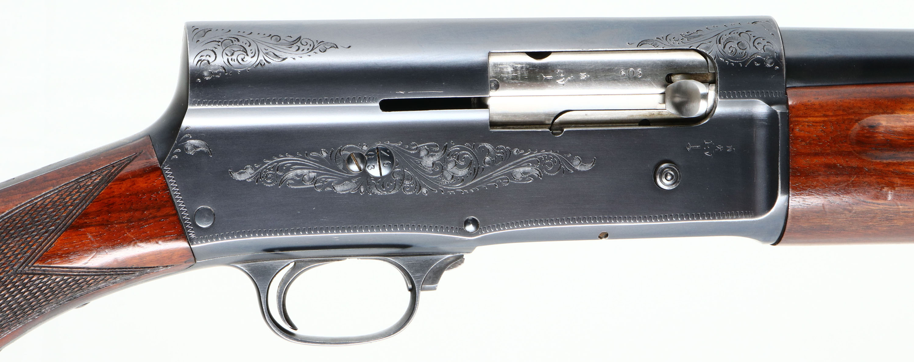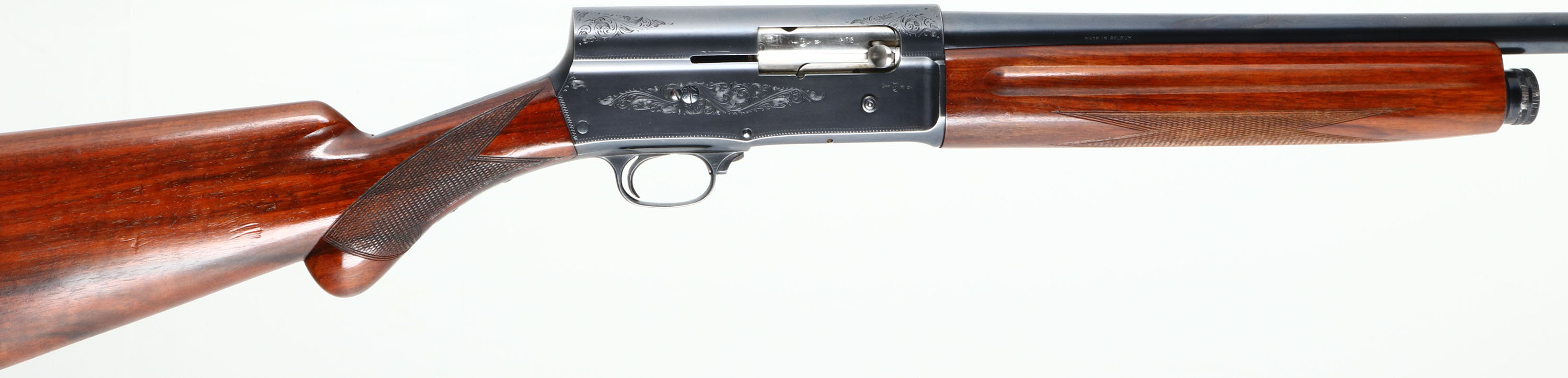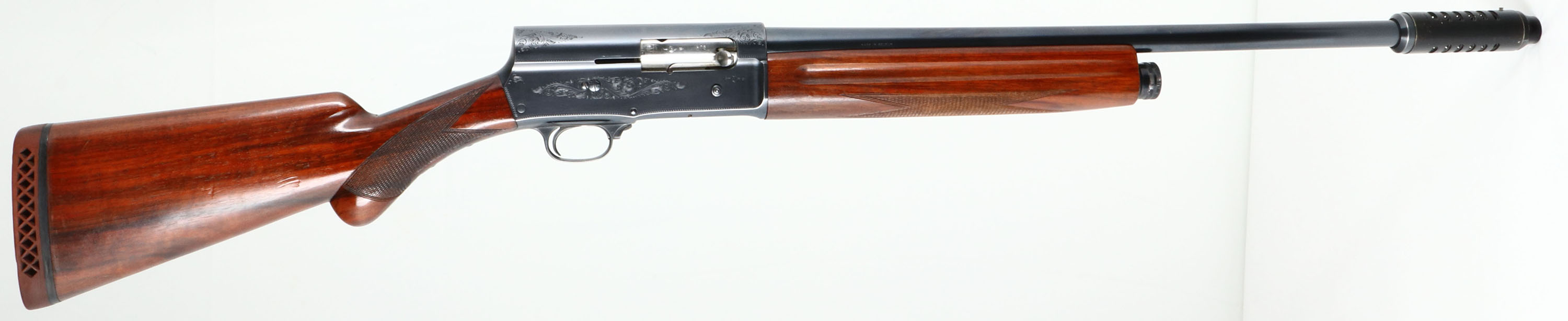 Browning (Belgium), Model A5, CAL: 12 GA, MFG: 1949, SN: 177603, Semi Auto Shotgun, Choke: Cutts, 21 1/2''no-rib barrel, 25 1/5'' with Lyman Cutts choke. The checkered round knob wood stocks are excellent, with the original finish having minor handling marks. The original metal blue finish rates 95% overall. The receiver, upper/lower tang & trigger guard display simple scroll, vine & border engravings. Barrel carries proof marks & stampings. Bore is excellent. Single front bead. The buttstock carries ventilated recoil pad. LOP 14 1/4''. FFL or C&R Req. - Value: 500 to 1000