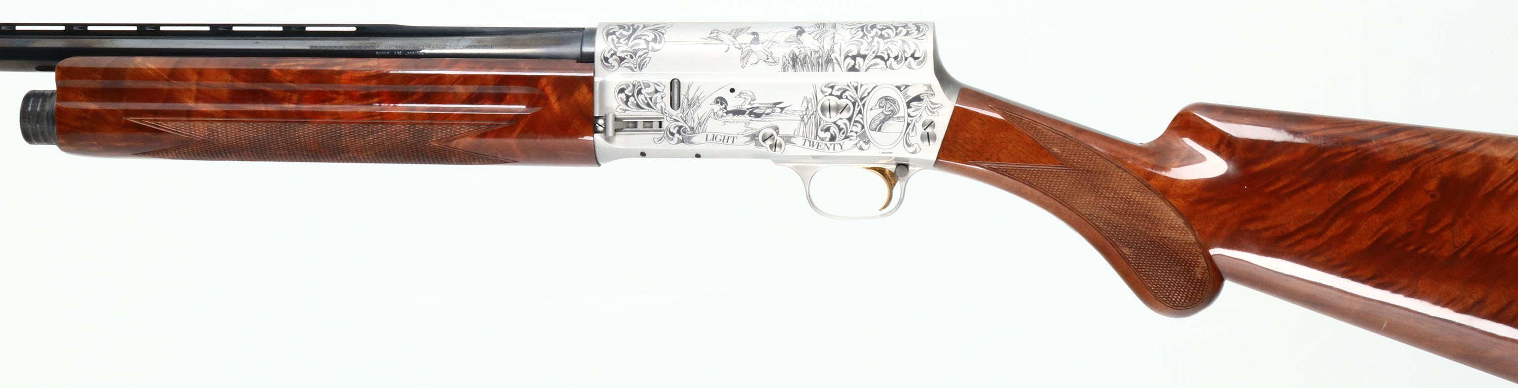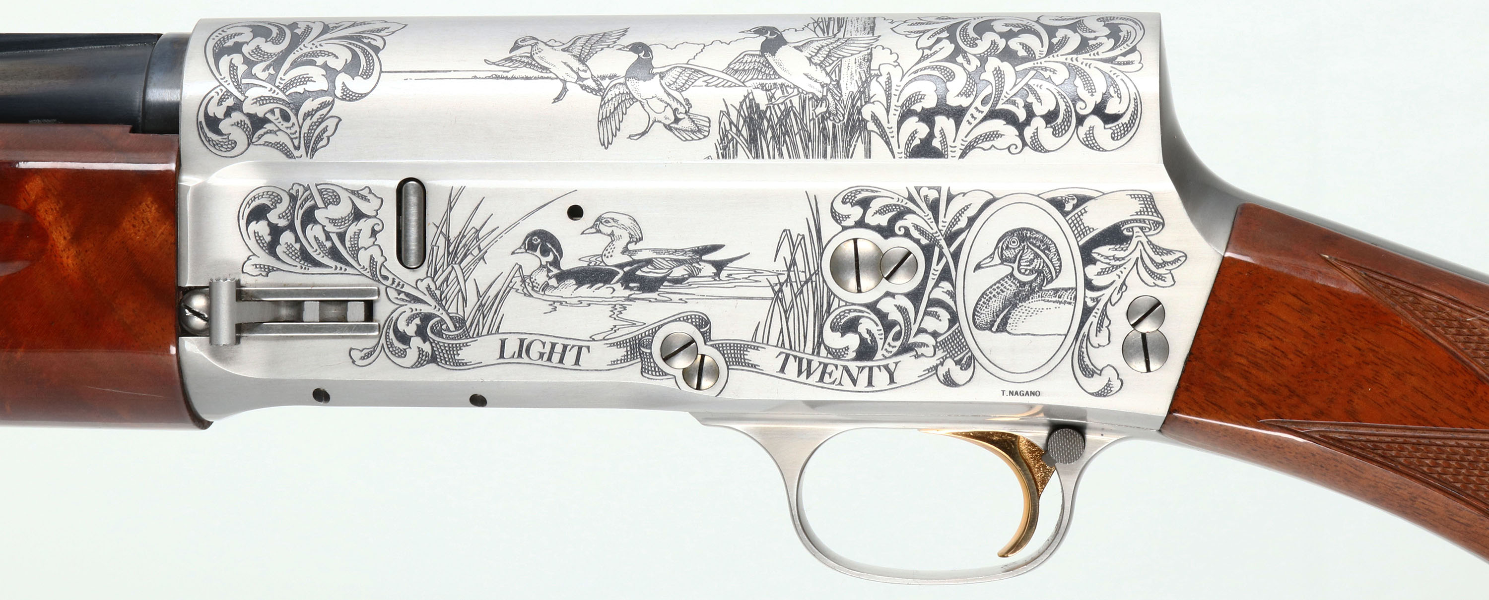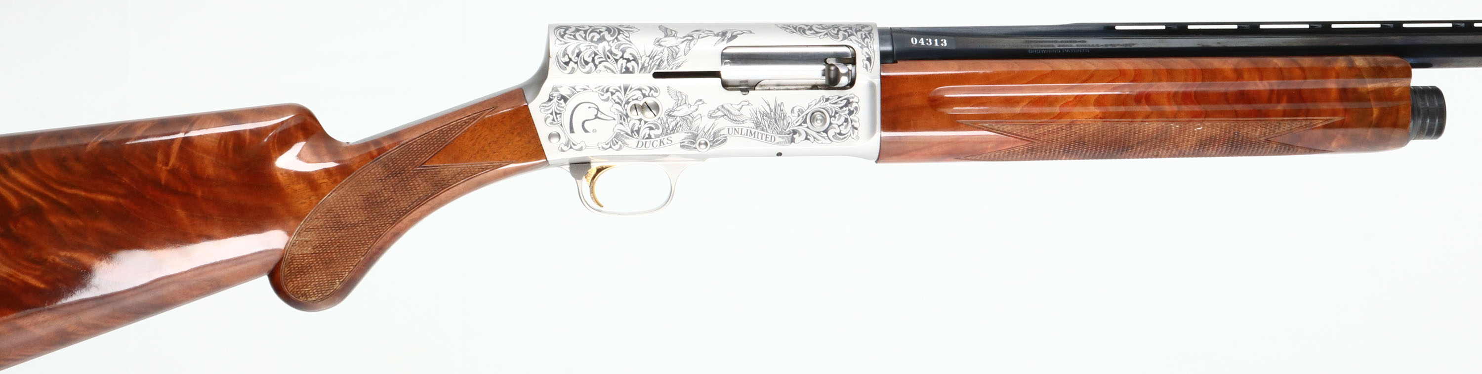 Browning, Auto-5 Ducks Unlimited Light Twenty CAL: 20 GA, MFG: 1990, SN: 90DU004313, Semi-Auto Shotgun, Invector Choke System, 2 3/4'' chamber, 26'' Ventilated barrel. Ducks Unlimited Special Edition. The Miroku factories in Japan built 5,000 of these Auto-5's. Featuring elaborately engraved silver coin receiver & fancy checkered walnut stocks. The words ''DUCKS UNLIMITED'' & ''LIGHT TWENTY'' are engraved in banners across the sides of the receiver, along with numerous ducks in hunting scenes. Engraved trigger guard. Engraved & signed by T. NAGANOI. Both wood & metal finishes are as excellent. Bore is excellent. Barrel holds a single front bead. Buttstock carries Browning buttplate. Gold Trigger. Never shot. Sticker still on barrel. 14'' LOP. Excellent DU & Browning collectible. FFL Req. - Value: 1200 to 2200