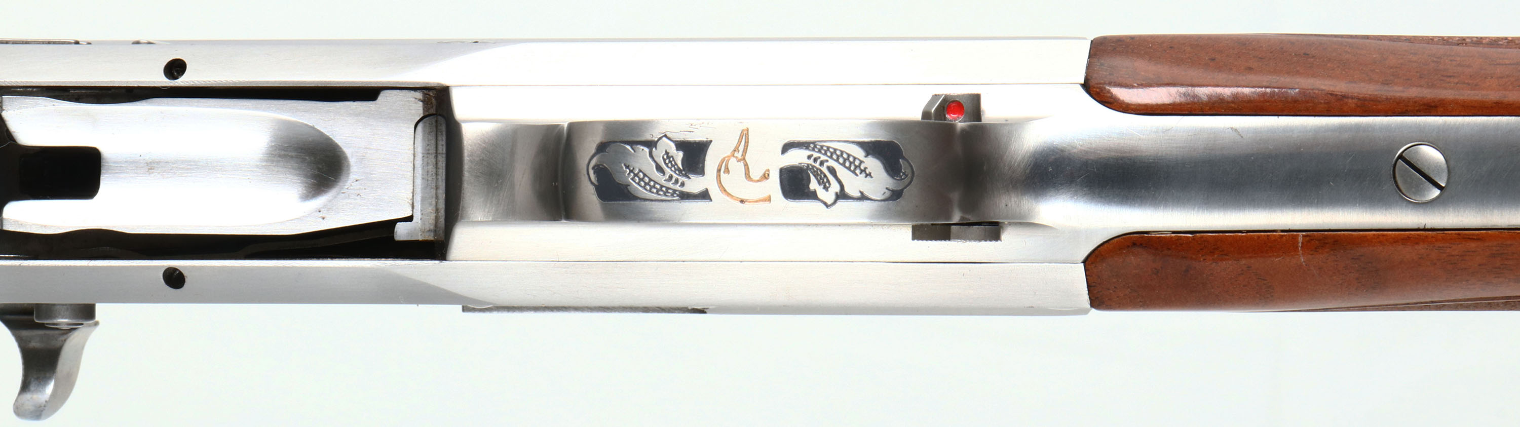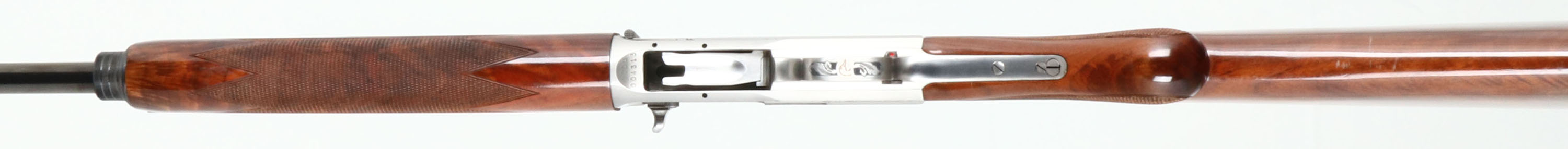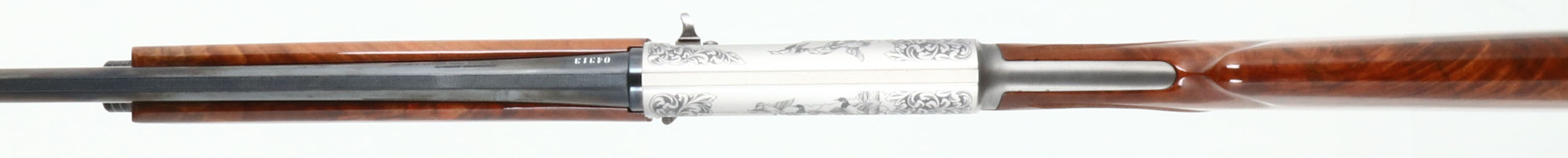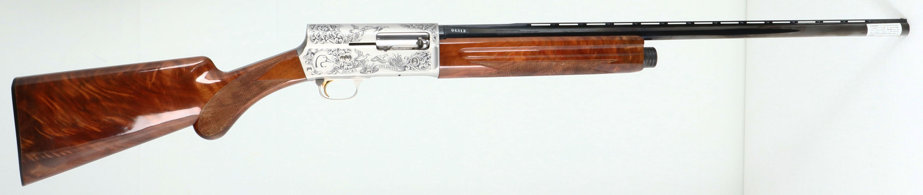 Browning, Auto-5 Ducks Unlimited Light Twenty CAL: 20 GA, MFG: 1990, SN: 90DU004313, Semi-Auto Shotgun, Invector Choke System, 2 3/4'' chamber, 26'' Ventilated barrel. Ducks Unlimited Special Edition. The Miroku factories in Japan built 5,000 of these Auto-5's. Featuring elaborately engraved silver coin receiver & fancy checkered walnut stocks. The words ''DUCKS UNLIMITED'' & ''LIGHT TWENTY'' are engraved in banners across the sides of the receiver, along with numerous ducks in hunting scenes. Engraved trigger guard. Engraved & signed by T. NAGANOI. Both wood & metal finishes are as excellent. Bore is excellent. Barrel holds a single front bead. Buttstock carries Browning buttplate. Gold Trigger. Never shot. Sticker still on barrel. 14'' LOP. Excellent DU & Browning collectible. FFL Req. - Value: 1200 to 2200