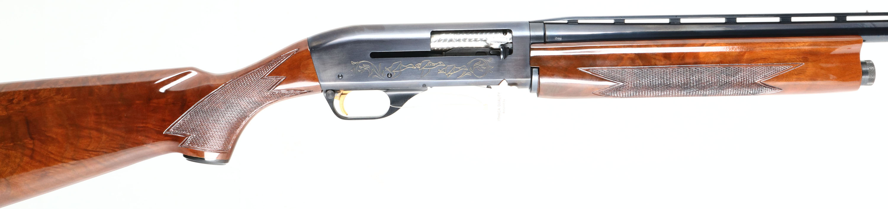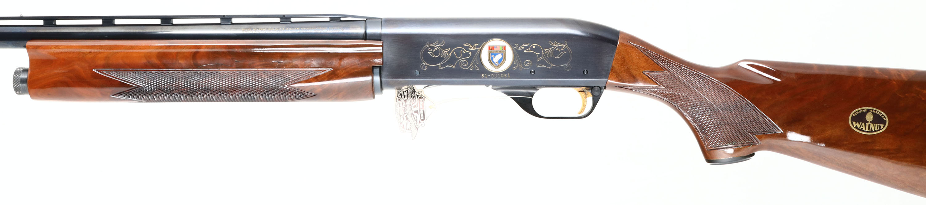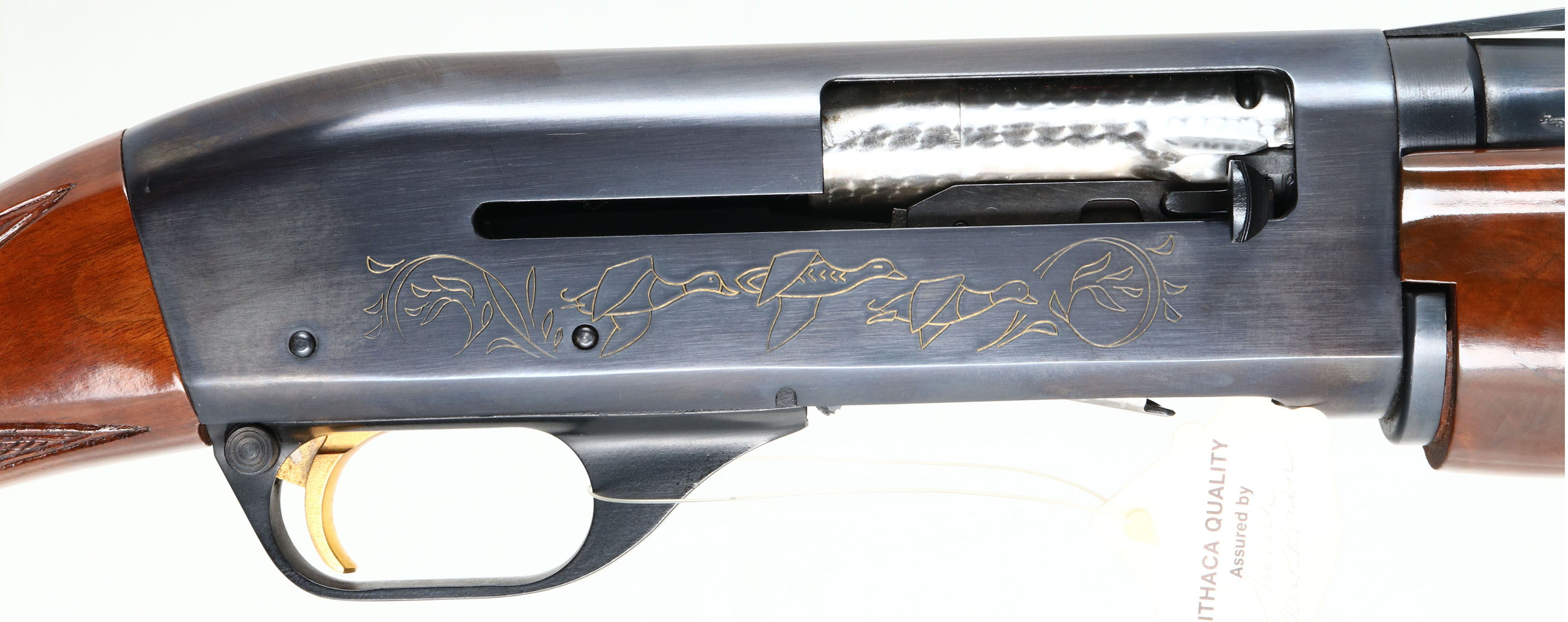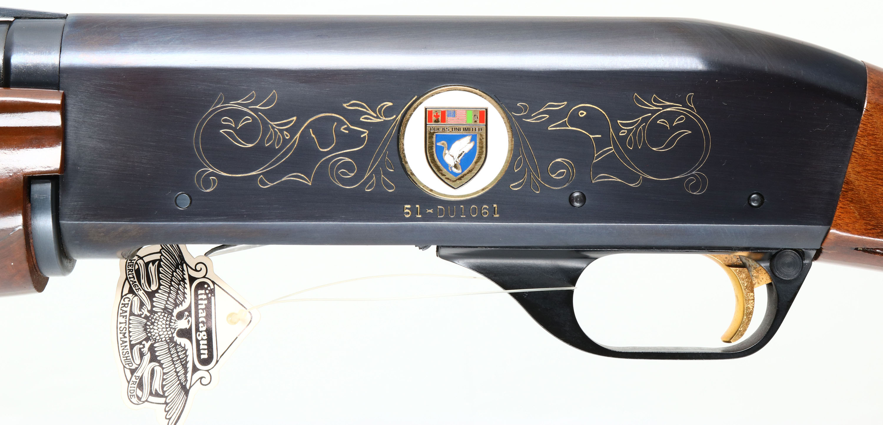 CASED Ithaca, Model 51 Featherlight ''PRESENTATION'' Model, Ducks Unlimited Commemorative CAL: 20 GA, MFG: 1978, SN: 51-DU1061, Semi-Auto Shotgun, Invector Choke System, 2 3/4'' chamber, 30'' Ventilated barrel. Ducks Unlimited Special Edition. The shotgun was manufactured in 1978 for Ducks Unlimited Canada 40th Year Anniversary (1937-1978) & were auctioned as ''Gun Of The Year'' (also referred to as Dinner Guns) at Duck Unlimited Annual Banquets at Duck Unlimited chapters throughout the country. Featuring gold (color) filled machine engraved receiver & fancy checkered walnut stocks. Both wood & metal finishes are excellent. DU emblem recessed in the left side of receiver. Special pewter grip cap insert commemorating DU (Canada)'s 40th anniversary. Bore is excellent. Barrel holds a mid & white front bead. Buttstock carries the original Pachmayr solid recoil pad. Jeweled bolt & carrier. Gold Trigger. Never shot. Hang tag still on trigger guard. Comes in original DU hard case, booklet, DU Letter announcing the gun offering & keys. 14'' LOP. Excellent DU & Ithaca collectible. FFL Req. - Value: 1000 to 2000