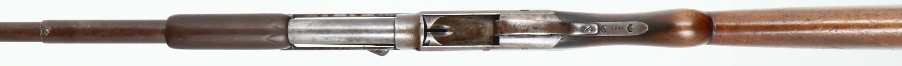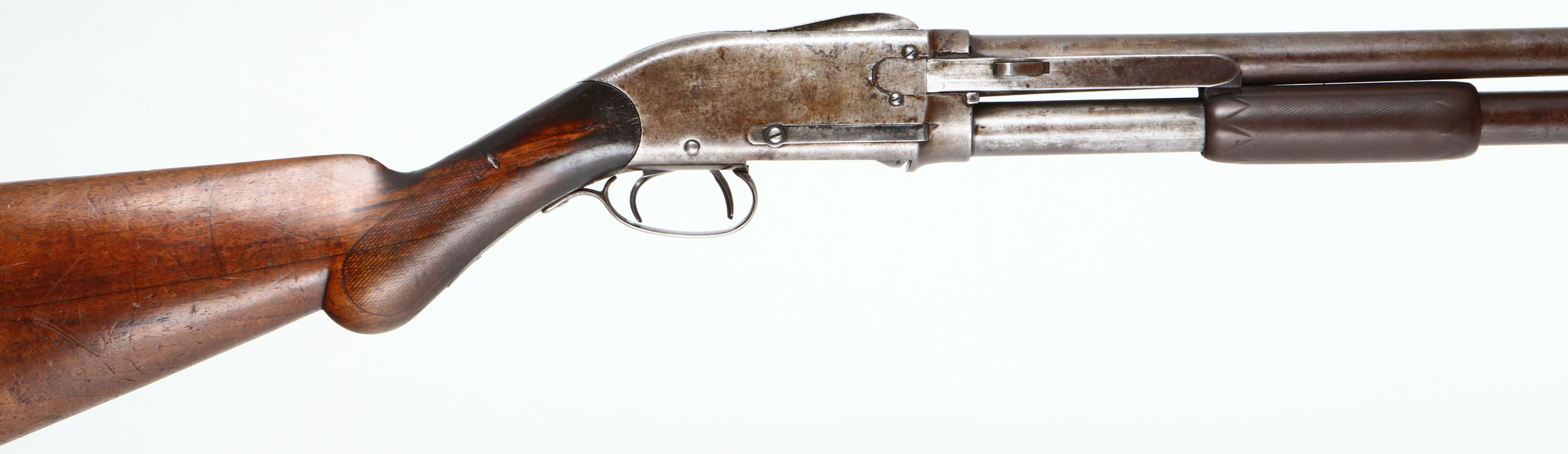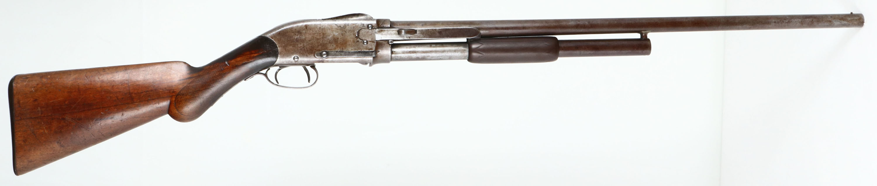 RARE Spencer Arms Co., Model 1890 Pump Shotgun, CAL: 12 GA, MFG: 1882-89, SN: 4598, Pump Action Shotgun, 28'' Damascus barrel. This is an early Spencer marked 1890, rather than the later production Bannerman stamped 1890 guns. The original round pistol grip wood stock on this example is very good & solid, despite being well used & worn. Checkering has worn thin & there are numerous scrapes, scratches & contusions to the worn thin original finish. The gutta percha (hard rubber) forend is also very good, despite the smoothing of the checkering. The metal has fully worn gun metal gray, with some spotty areas of thin brown patina. The thumbprint pattern of the damascus barrel is viewable & it holds a single front bead. Bore is good, with some spotty roughness. The mag tub retention lug at the front of mag has been nicely soldered back onto the lower portion of the barrel. Stock carries the original hard rubber buttplate. What appears to be another trigger facing backwards inside the trigger guard is actually the hammer spur. While this Spencer shotgun is largely forgotten by even the most advanced collectors, it remains an important historical footnote as an early commercially successful pump-action shotgun. Fairly scarce & collectible. Antique, No FFL Req. - Value: 800 to 1500