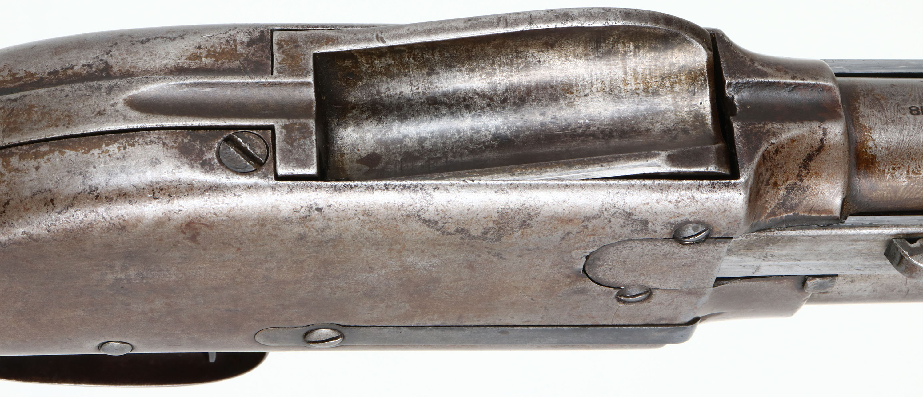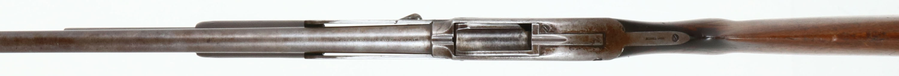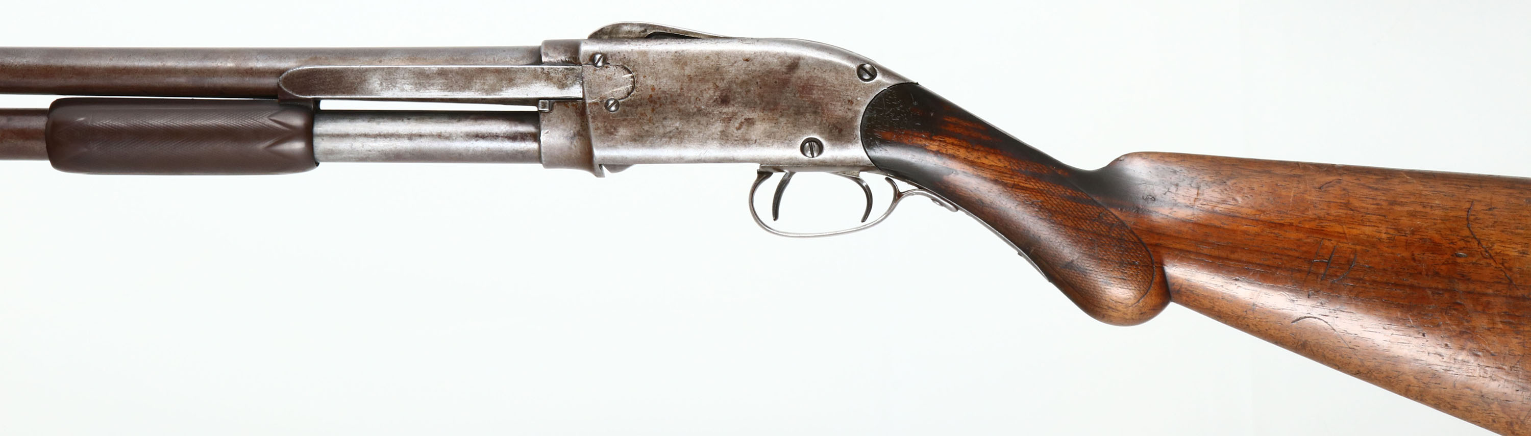RARE Spencer Arms Co., Model 1890 Pump Shotgun, CAL: 12 GA, MFG: 1882-89, SN: 4598, Pump Action Shotgun, 28'' Damascus barrel. This is an early Spencer marked 1890, rather than the later production Bannerman stamped 1890 guns. The original round pistol grip wood stock on this example is very good & solid, despite being well used & worn. Checkering has worn thin & there are numerous scrapes, scratches & contusions to the worn thin original finish. The gutta percha (hard rubber) forend is also very good, despite the smoothing of the checkering. The metal has fully worn gun metal gray, with some spotty areas of thin brown patina. The thumbprint pattern of the damascus barrel is viewable & it holds a single front bead. Bore is good, with some spotty roughness. The mag tub retention lug at the front of mag has been nicely soldered back onto the lower portion of the barrel. Stock carries the original hard rubber buttplate. What appears to be another trigger facing backwards inside the trigger guard is actually the hammer spur. While this Spencer shotgun is largely forgotten by even the most advanced collectors, it remains an important historical footnote as an early commercially successful pump-action shotgun. Fairly scarce & collectible. Antique, No FFL Req. - Value: 800 to 1500