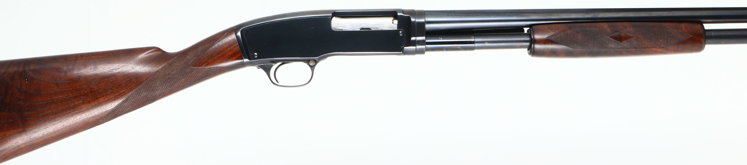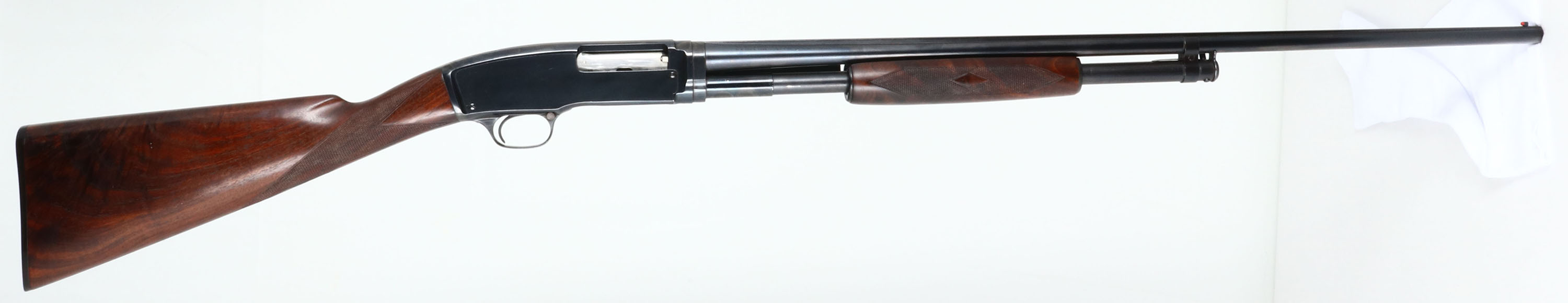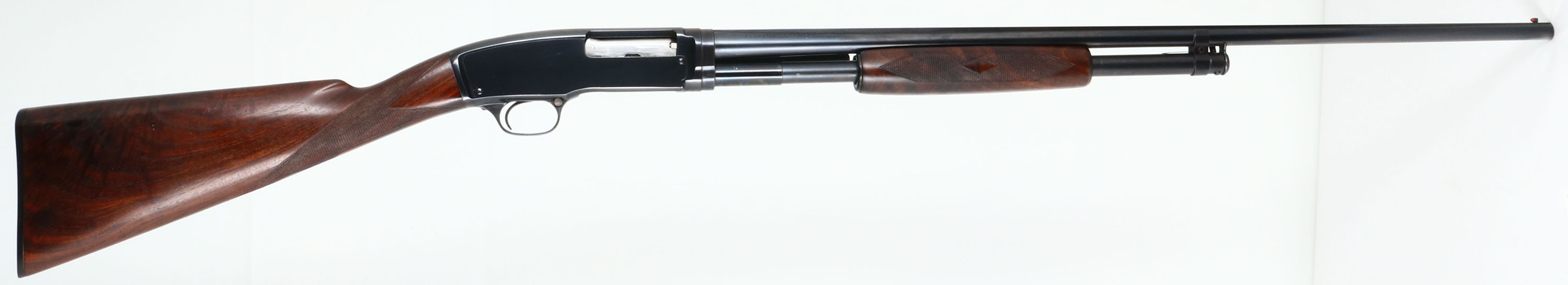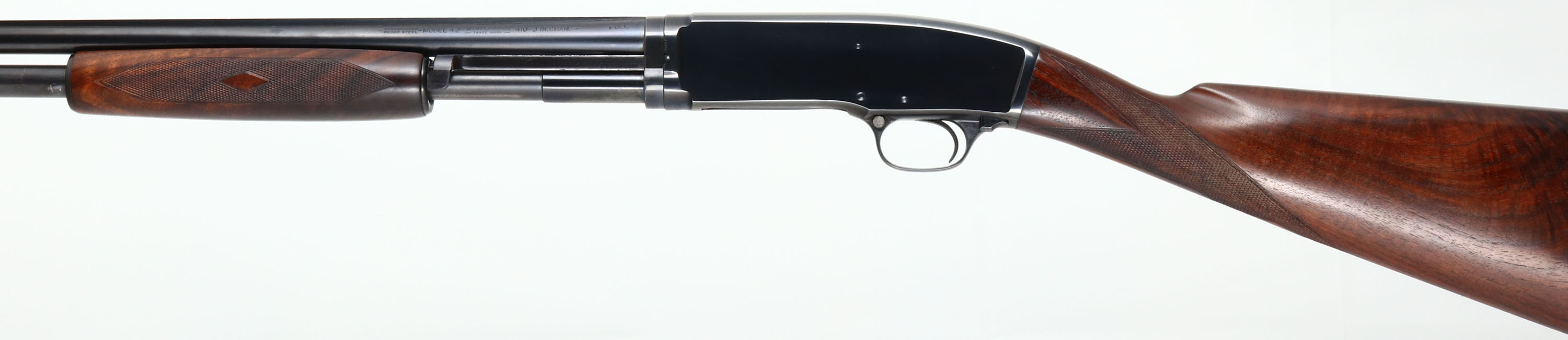RARE DELUXE Winchester Model 42 DELUXE, 410 GA., MFG. 1946, SN: 56332. Pump Action Shotgun, 3'', Full choke, 28'' matted solid rib barrel. The original factory deluxe checkered, & rare straight pistol grip wood stocks are excellent & solid. The original finish is excellent with only a couple of tiny handling rubs. The scalloped grain is fantastic. The original metal blue finish rates 99% on barrel & receiver & 97% on tube. Bore is excellent. Stock carries the original Winchester buttplate. Barrel has a red front bead. Probably the nicest deluxe 42 we've ever offered. 13 7/8'' LOP.* FFL or C&R Req. - Value: 6000 to 12000